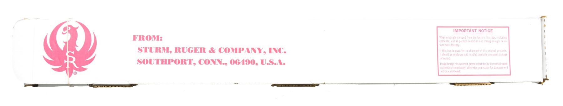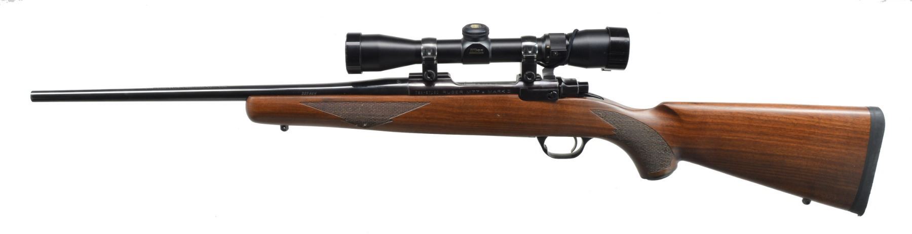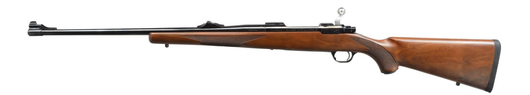 1) M77 CR MKII COMPACT. Cal. 223 Rem. S# 788-57160. Bbl. 16 1/2" w/out sights. Nikon 3-9x32 matte finished scope w/ duplex reticle on Ruger rings & integral mts. Action featuring 2 lug bolt w/ claw extractor, side safety & hinged floorplate. Straight comb carbine style walnut stock w/ satin finish, cut checkering & swivel bases. LOP: 12 5/8" over black Ruger pad. CONDITION: near excellent retaining over 98% wood & metal finish. Near excellent bore. Scope has clear optics. (20-1386/DS). 2) M77 RS MK II. Cal. 30-06. S# 786-24563. Bbl. 22" w/ ramp mounted gold bead front sight & island mounted folding leaf rear sight. Blued action featuring integral scope bases, 2 lug stainless steel bolt w/ claw extractor, right side safety & hinged floorplate. Classic style stock w/ satin finished walnut w/ cut checkering, swivel bases & plastic grip cap. LOP: 13 5/8" over black Ruger pad. UNATTACHED ACCESSORIES: original box containing scope rings, trigger lock, instruction manual, & record cards. CONDITION: near new w/ box. Stock shows a few sm. marks. (20-1388/DS). BOTH MODERN. $800-1,100.