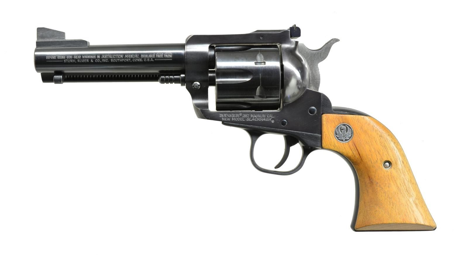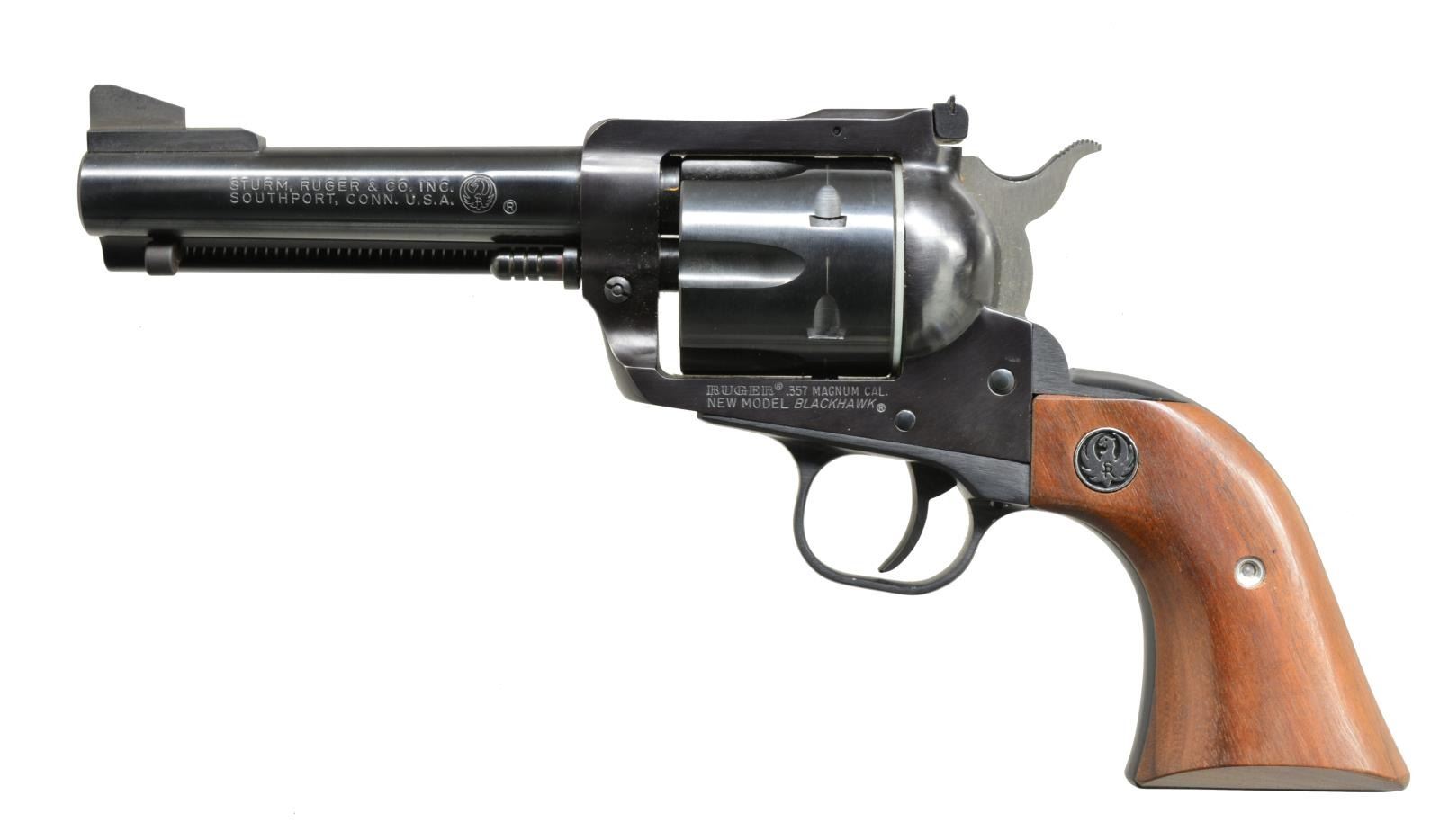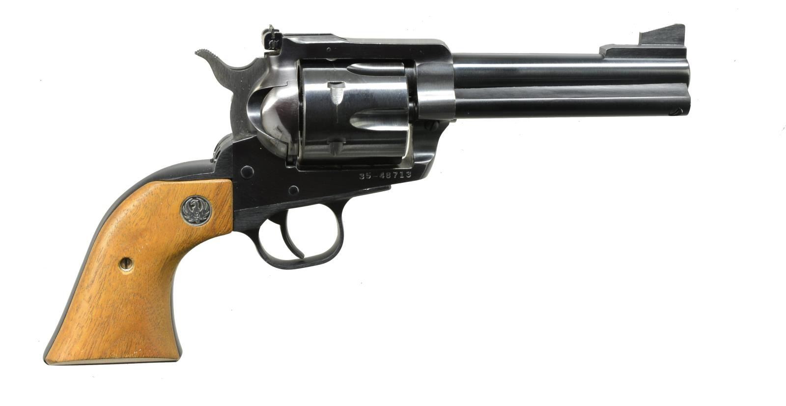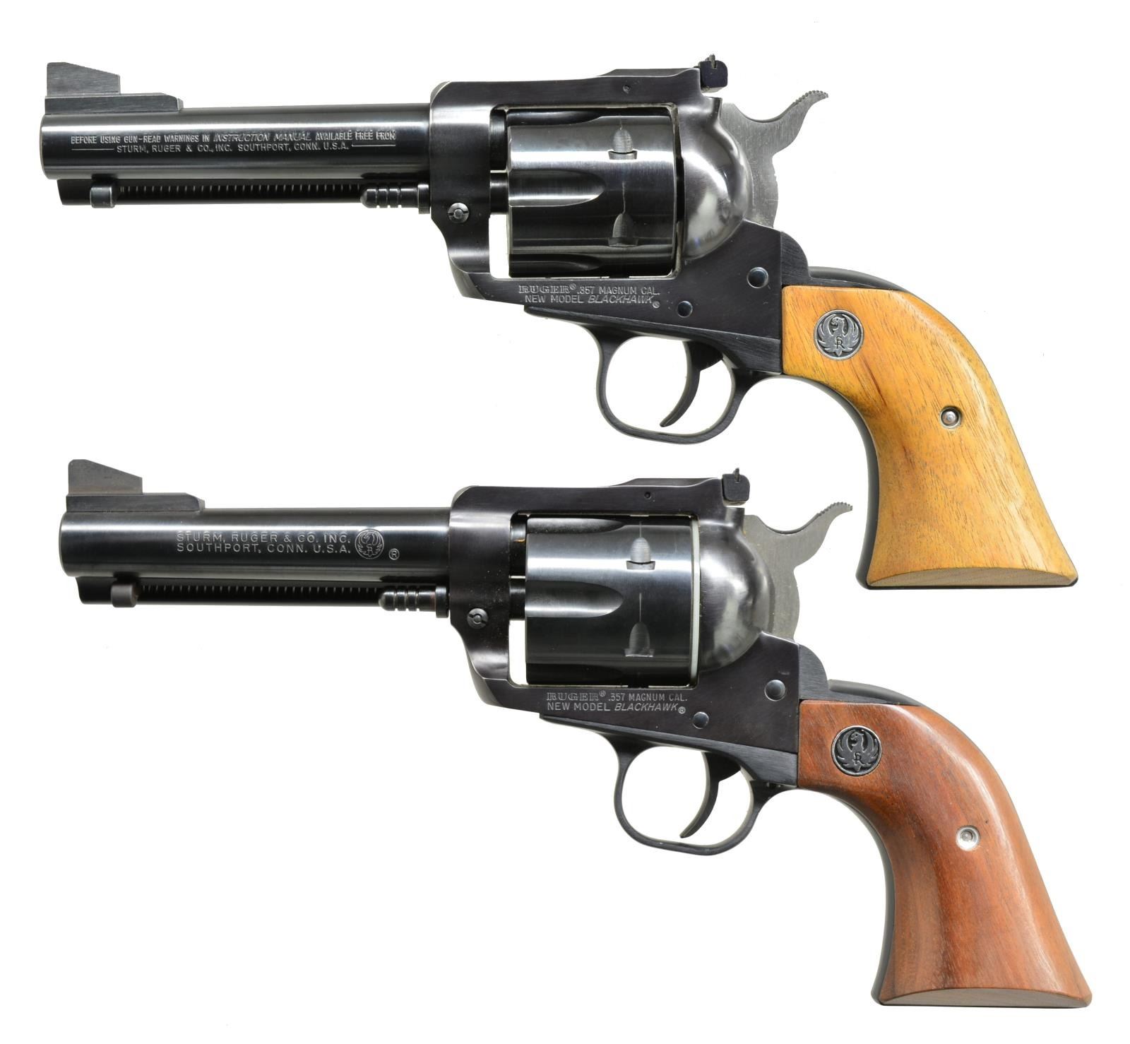 CYL. 1) NEW MODEL BLACKHAWK CONVERTIBLE W/ EXTRA GRIPS. Cal. .357 Mag. S# 35-48713. Bbl. 4 3/4" w/ target sights, blued finish. Alloy grip frame w/ walnut grips & Ruger medallions. UNATTACHED ACCESSORIES: extra cyl. in 9mm, scratch number matching revolver. Pair of rosewood grips w/ Ruger medallions. Semi relief carved w/ scroll. Right grip marked on inside “Design hand carved by” w/ stamped “NW”. Instruction booklet included. CONDITION: retaining nearly all original factory finishes w/ high edge wear. Very light drag line on both cyls. Mechanically crisp. (20-3851/MGM). 2) NEW MODEL BLACK HAWK. Cal. .357 Mag. S# 33-82138. Bbl. 4 3/4" w/ adj. sights, blued finish. Walnut grips w/ Ruger medallions in alloy frame. CONDITION: very close to “as new” w/ only a few minor marks in all finishes. Light drag line on cyl. Mechanically fine. (20-3860/MGM). BOTH MODERN. $750-1,100.