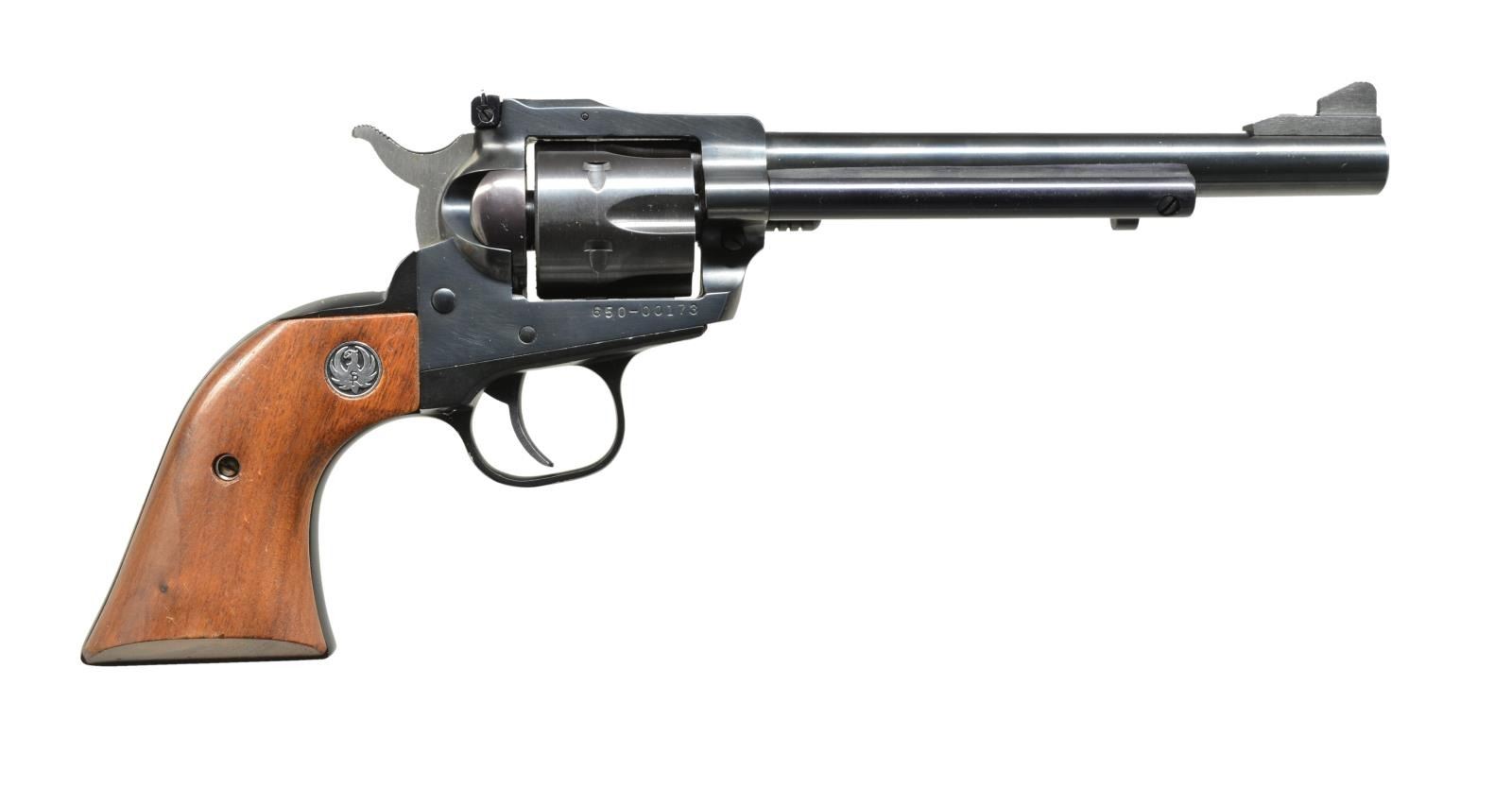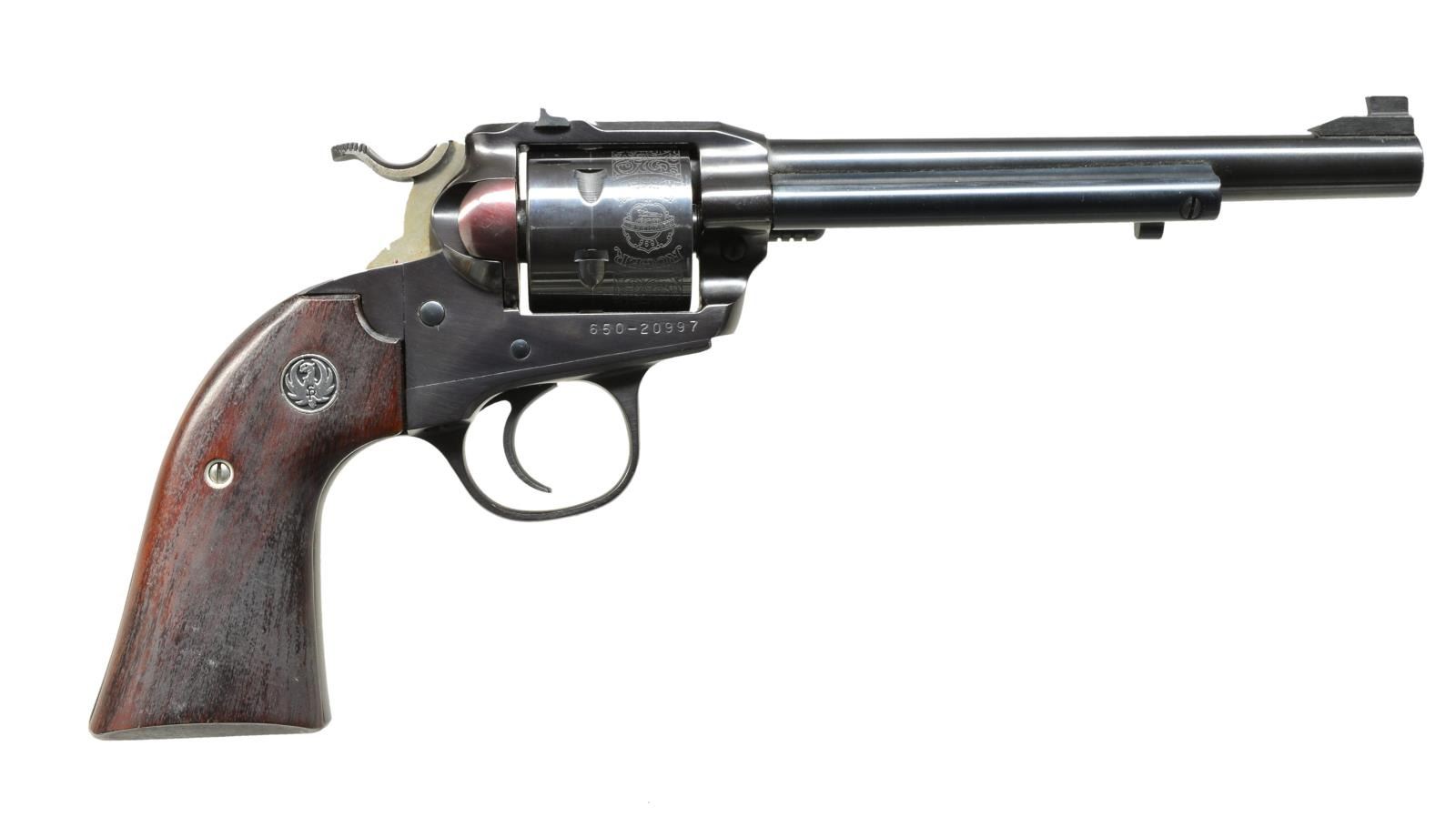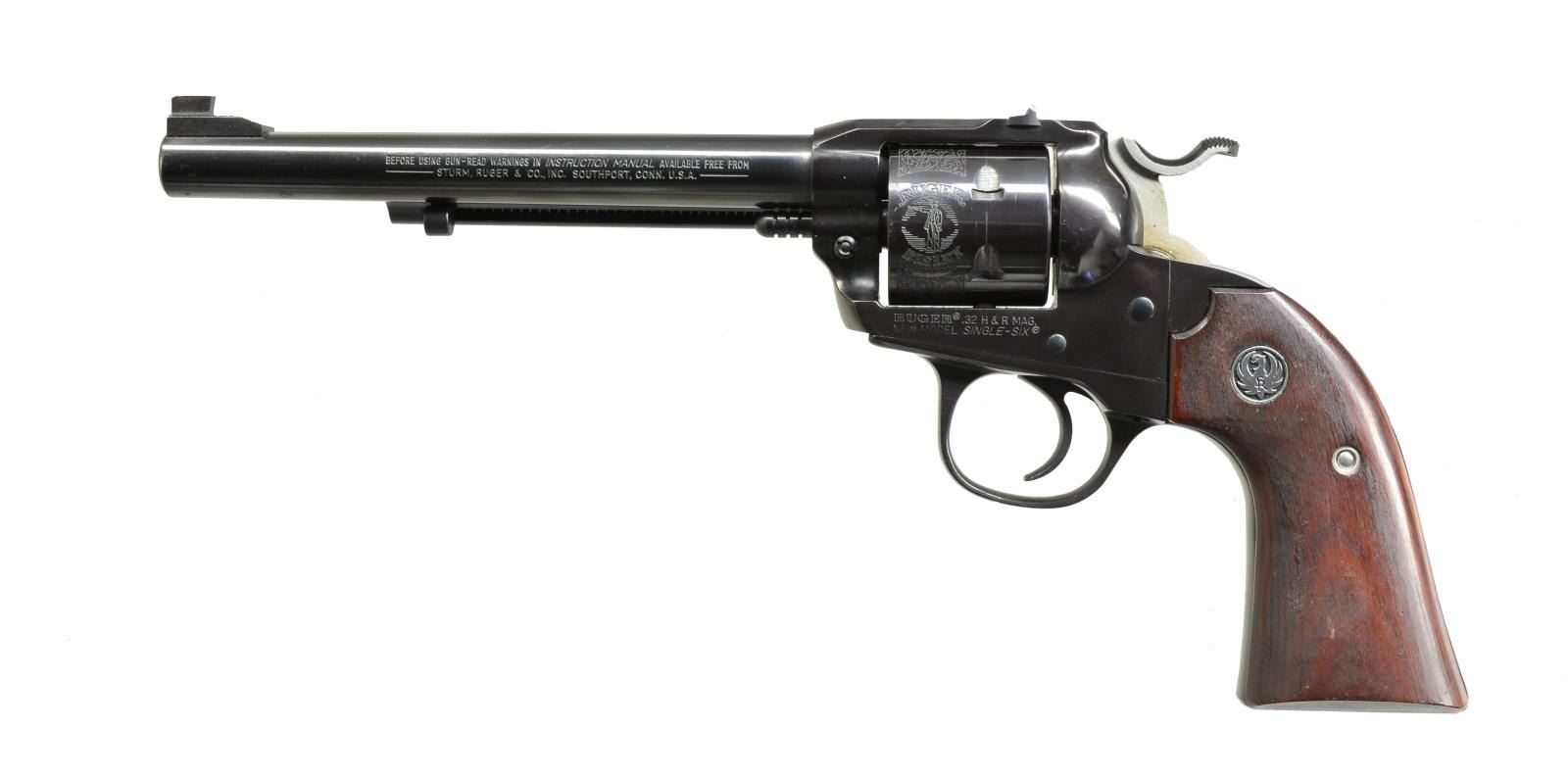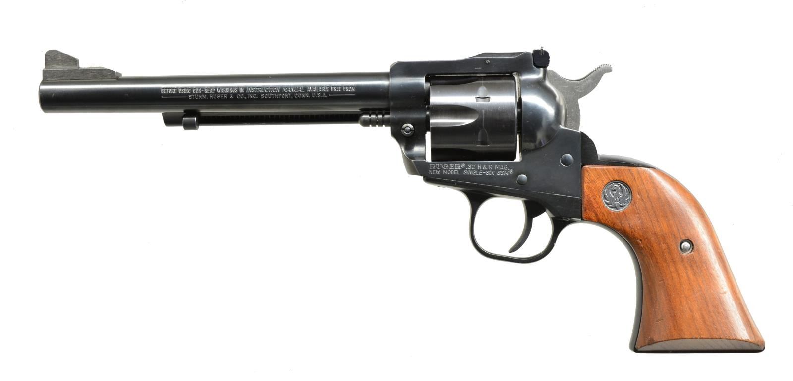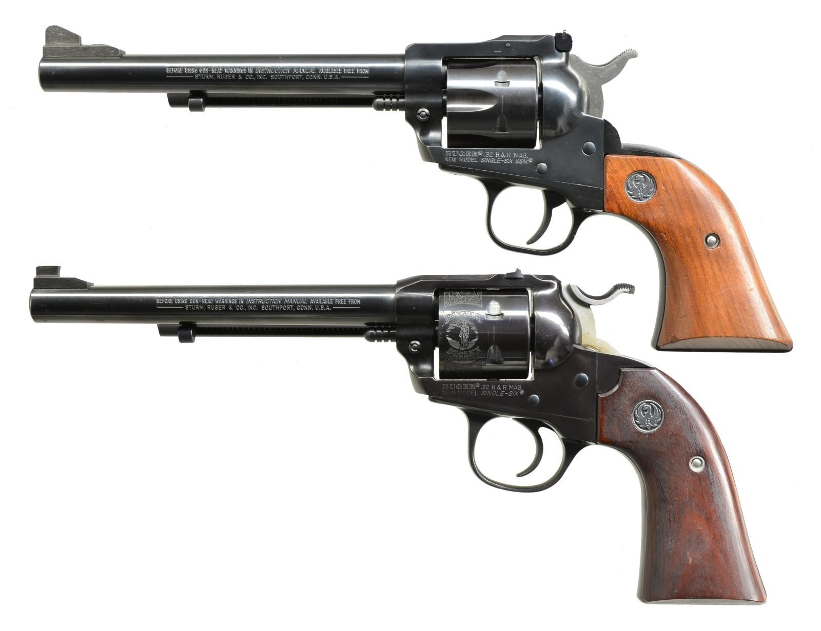 H&R MAG. BOTH: cal. .32 H&R Mag. 1) NEW MODEL SINGLE SIX SSM. S# 650-00173. Bbl. 6 1/2" w/ adj. sights. Blued action marked “SSM”. Alloy frame w/ walnut grips. UNATTACHED ACCESSORIES: Ruger box w/ matching number hand written S#. Box contains paperwork. CONDITION: approx. 95% original blue w/ a few minor nicks & some scratches mostly on grip frame at bottom. Bright shiny bore, mechanically fine. (20-3866/MGM). 2) SCARCE RUGER SINGLE SIX BISLEY. S# 650-20997. Bbl. 6 1/2" & fixed sights. Unfluted cyl. w/ rolled engraving. Low Bisley hammer & wide trigger. Steel Bisley style frame w/ rosewood grips. CONDITION: very fine, very close to “as new” w/ only a few very light handling marks & slight bolt drag mark on cyl. Mechanically fine. (20-3867/MGM). BOTH MODERN. $650-1,000.