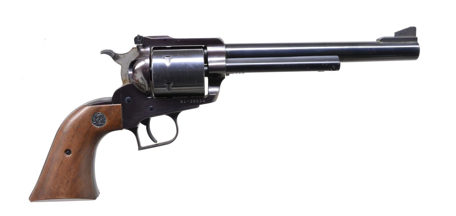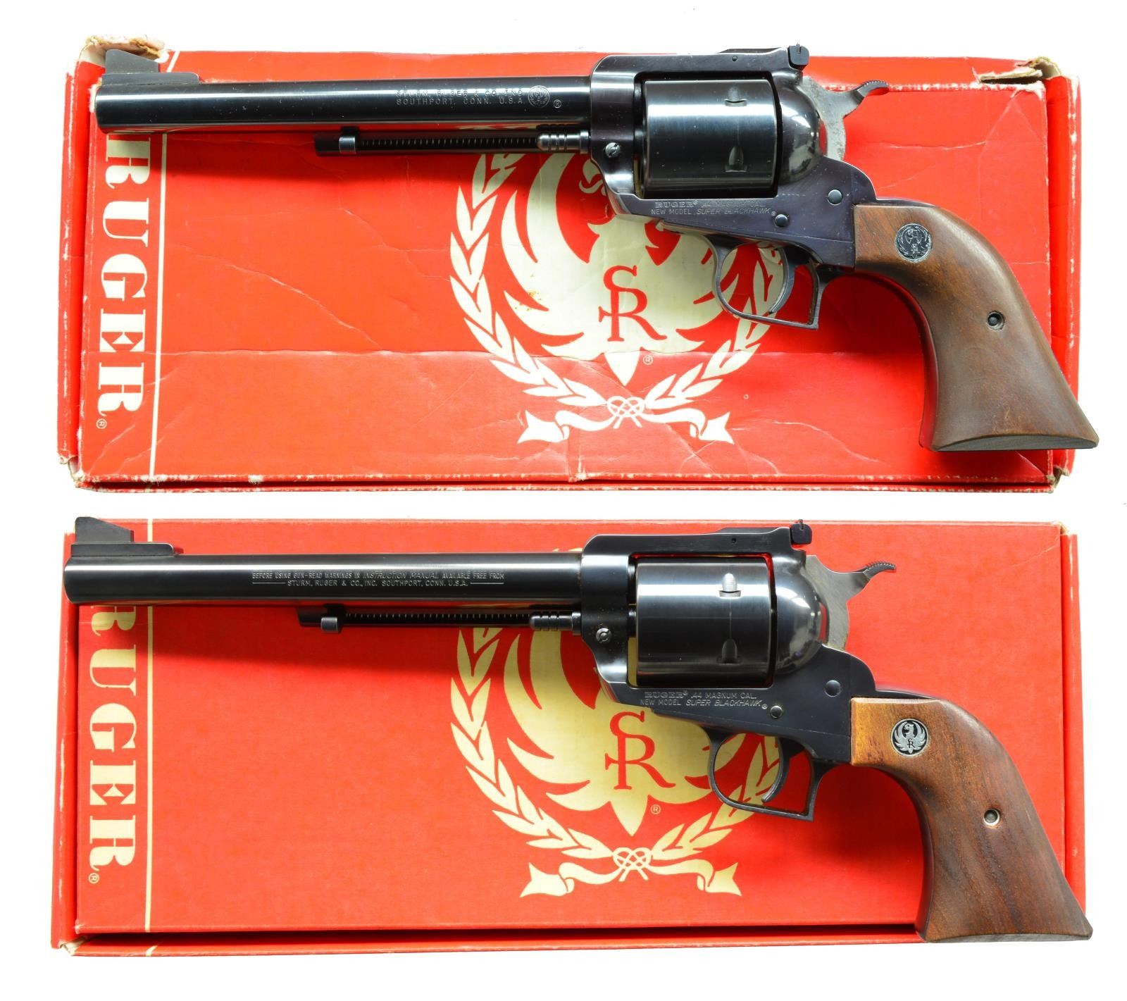 BOTH: cal. 44 Mag. Bbls. 7 1/2". Blued w/ steel Dragoon style trigger guards, unfluted cyls., adj. sights, wide spur hammers, alloy ejector housings & wide grooved triggers. Walnut grips w/ silver eagle medallions. UNATTACHED ACCESSORIES: matching numbered red & white one piece boxes w/ packaging; #1 slightly tattered on edges & corners, #2 near excellent. CONDITION: faint hint of cyl. turn lines & light staining on sides of hammers. All other aspects near excellent including bores. 1) S# 81-38534. Mfg. 1975 w/out warning marks on bbl. plus blued grip screw bushings & screw. (20-1518/NW). 2) S# 82-67775. Mfg. 1978 w/ warning marks on bbl. plus stainless grip screw bushings & screw. (20-1519/NW). BOTH MODERN. $700-1,000.