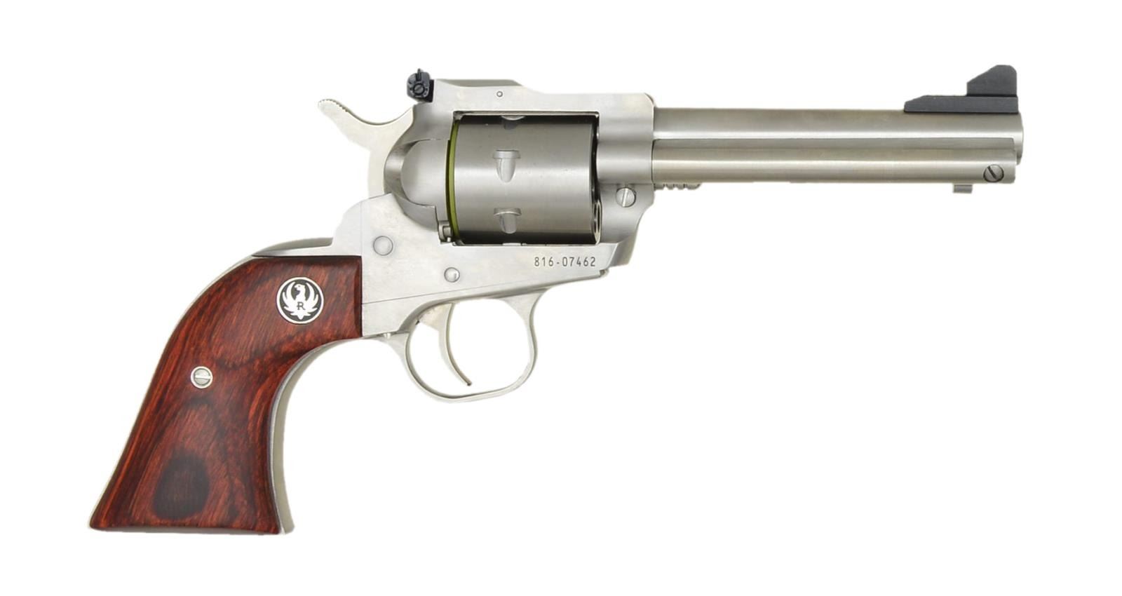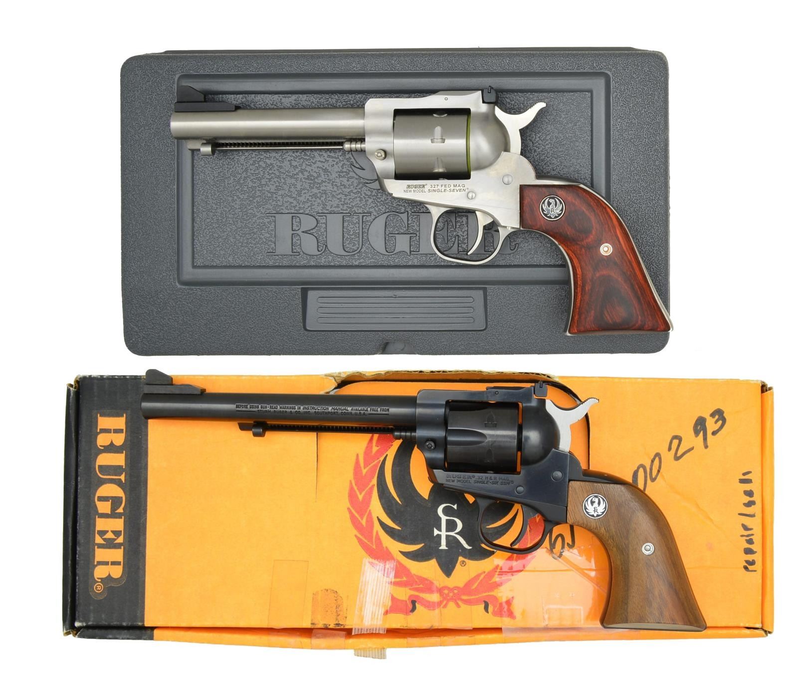 1) SINGLE-SEVEN. Cal. 32 Fed. Mag. S# 816-07462. Bbl. 4.62" w/ screw attached ramp front sight & frame mounted adj. rear. Stainless w/ unfluted 7 rd. cyl. mfg. 2018 having laminated rosewood grips, catalog #08161 & silver eagle medallions. Uncommon & desirable bbl. length. UNATTACHED ACCESSORIES: factory grey plastic case & packaging. CONDITION: all aspects near excellent appearing new. (21-1215/NW). 2) SINGLE-SIX SSM. Cal. 32 H&R Mag. S# 650-00293. Bbl. 6 1/2" w/ screw attached front sight & frame mounted adj. rear having white outline blade. Mfg. 1884 but per Ruger.com, shipped 2003! Rare blued model w/ "SSM" on left side of frame; less than 800 so marked. Early flat tipped ejector rod rather than later tapered rod. Steel ejector housing & walnut grips w/ silver eagle medallions. UNATTACHED ACCESSORIES: factory repair labeled yellow hinged box w/ packaging. Box has tape remnants & marker writings of S# plus "repair /sell". Very likely firearm from Ruger storage offered on Ruger's benefit auction listings as evidence by included letter signed by CEO Michael Fifer, listing all facets described above including repair/sell sticker. Letter further states no records as to what was repaired, but test target included. CONDITION: all aspects near excellent; appears new. (21-1227/NW). BOTH MODERN. $900-1,400.