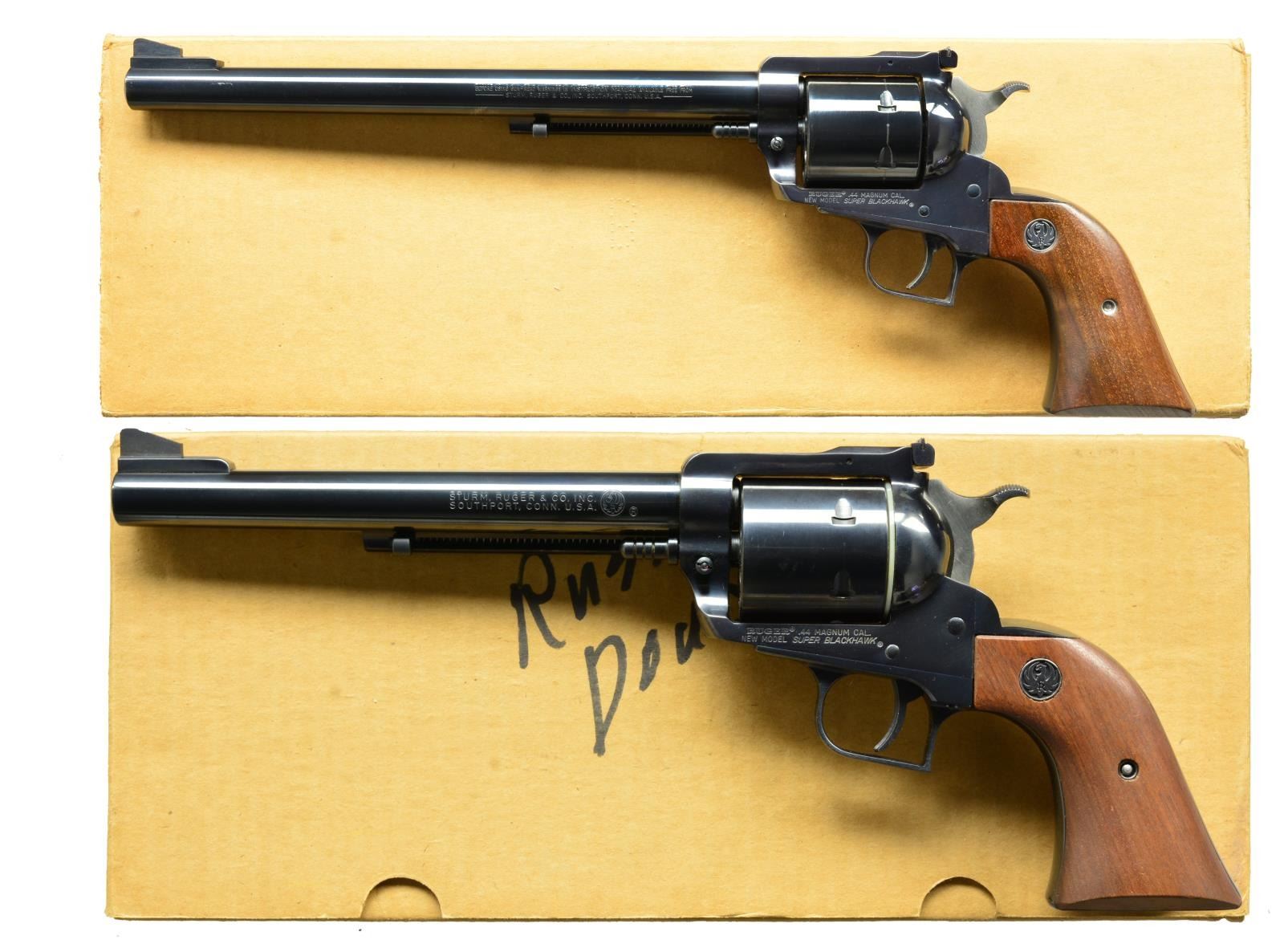 BOTH: cal. 44 Mag. Blued finish w/ alloy ejector housings. Walnut grips w/ silver eagle medallions. Ramp front sights w/ frame mounted adj. rears. UNATTACHED ACCESSORIES: original box & packaging for each w/ shipping sleeves. 1) S# 84-52112. Bbl. 10 1/2". Mfg. 1982 w/ warning marks on left side of bbl. CONDITION: very good plus w/ slight turn line on cyl. & sm. rub mark on bottom of bbl. just forward of ejector housing. Near excellent bore & grips. (21-1257/NW). 2) S# 81-99444. Bbl. 7 1/2". Mfg. 1977 w/out warning marks; legend w/ eagle logo on left side of bbl. Unusual full house S#; two 9's & three 4's. CONDITION: all aspects near excellent including bore & grips. (21-1308/NW). BOTH MODERN. $800-1,200.