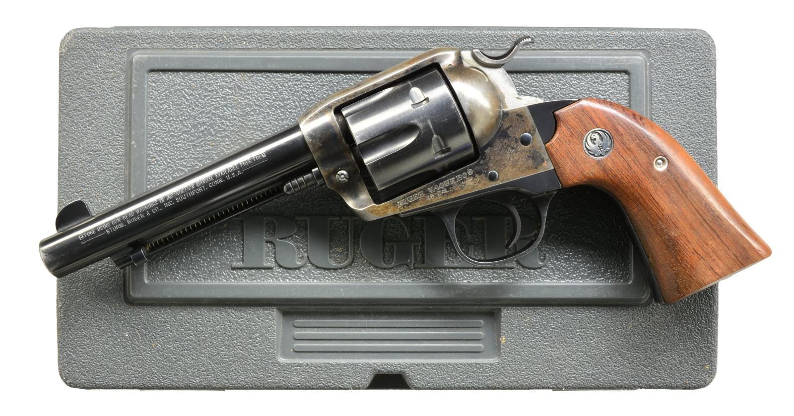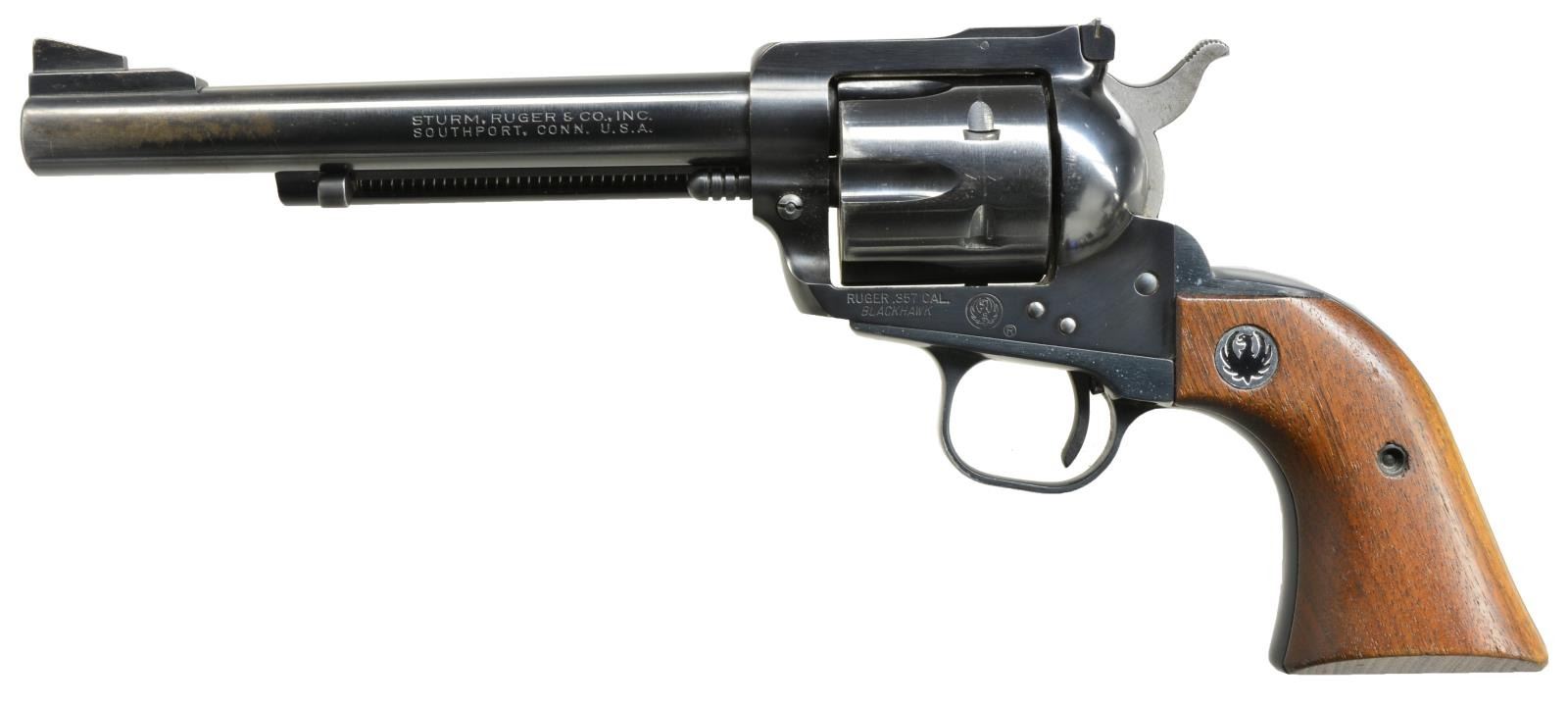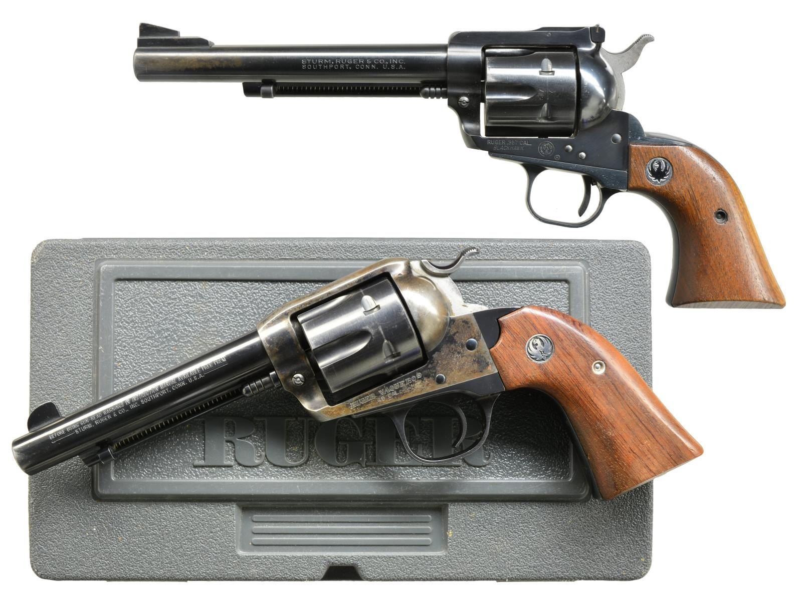 1) OLD MODEL BLACKHAWK. Cal. 357 Mag. S# 96035. Bbl. 6 1/2" w/ out eagle logo but w/ "Inc." Mfg. 1969 w/ alloy ejector rod housing & non collared base pin. Black eagle walnut grips. Not factory safety updated; original lock work. CONDITION: very good general appearance w/ slight holster like wear on bbl., cylinder, & end of ejector housing. Occasional small spots of finish loss on grip frame. Very good grips w/ slight marks on right & on butts. Slight firing residue & near excellent bore. (20-2526/NW). CURIO. 2) BISLEY VAQUERO. Cal. 45 LC. S# 58-21188. Bbl. 5 1/2" w/ blade front sight & frame notched rear. Mfg. 2002 as RBNV455 indicating Bisley model w/ case colored frame. UNATTCHED ACCESSORIES: matching numbered factory gray plastic box w/ out packaging. CONDITION: about very good appearance w/ holster like wear & cyl. turn line. Very good appearing grips w/ light marks on butt; especially right. Near excellent bore. (20-2529/NW). MODERN. $750-1,000.