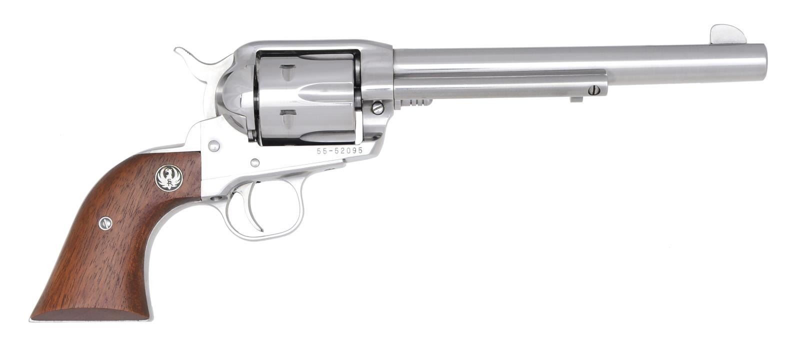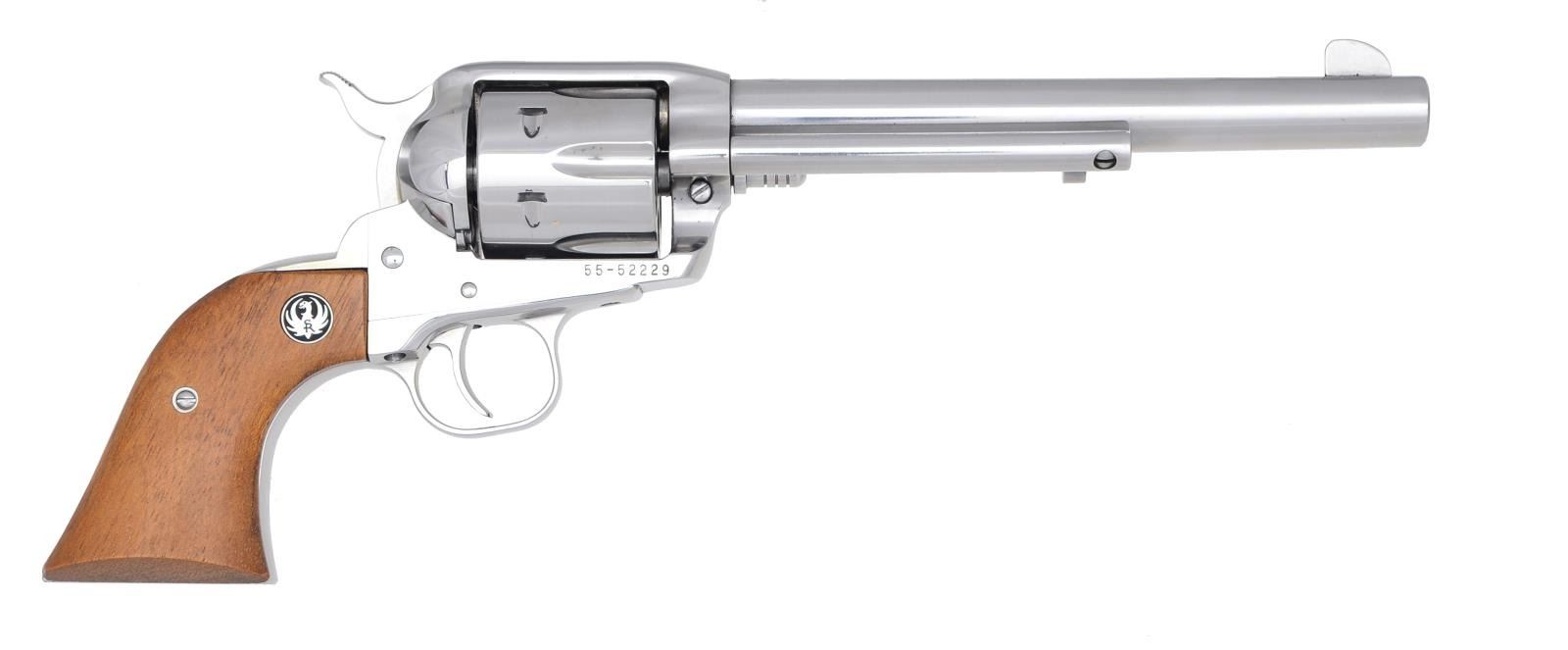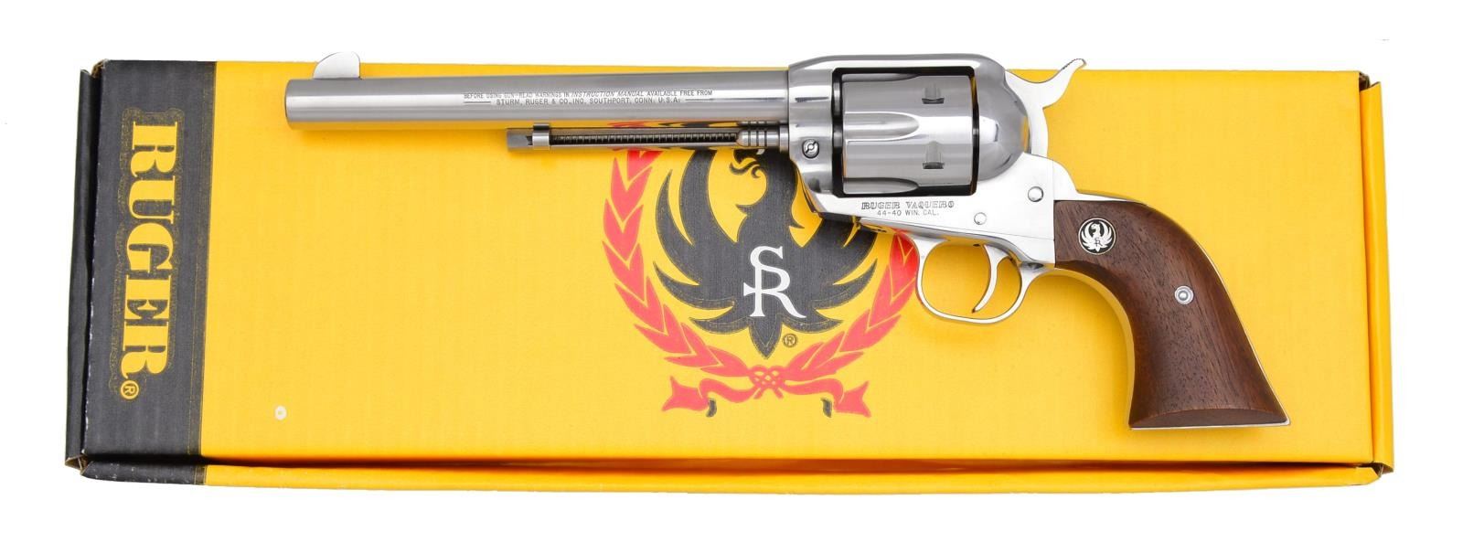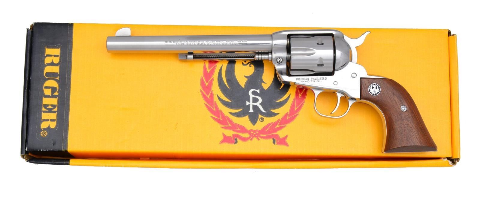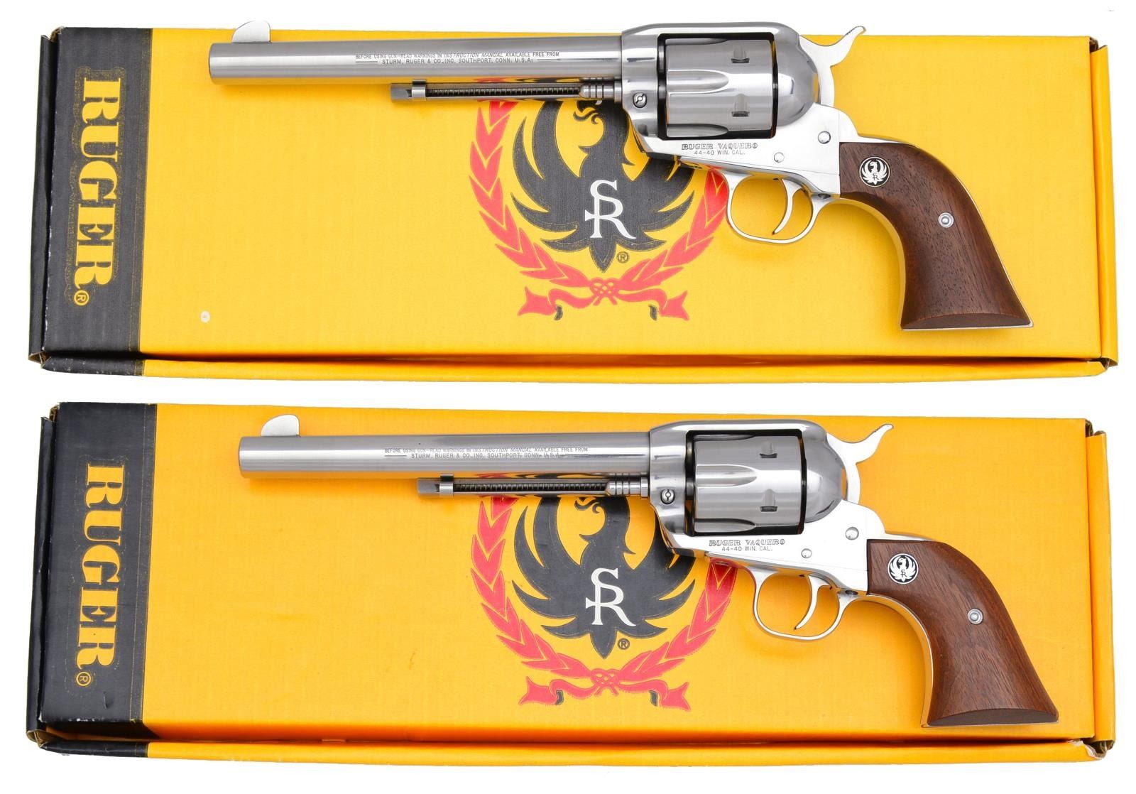 BOTH: cal. 44-40. Bbl. 7 1/2". Mfg. 1997 w/ catalog #KBNV-407 indicating bright polished stainless. Walnut grips w/ silver eagle medallions. UNATTACHED ACCESSORIES: original inner boxes w/ manuals plus end label from shipping sleeve of #1. CONDITION: all aspects of both near excellent w/ very faint cleaned firing residue. 1) S# 55-52095. (20-1534/NW). 2) S# 55-52229. (20-1538/NW). BOTH MODERN. $800-1,100.