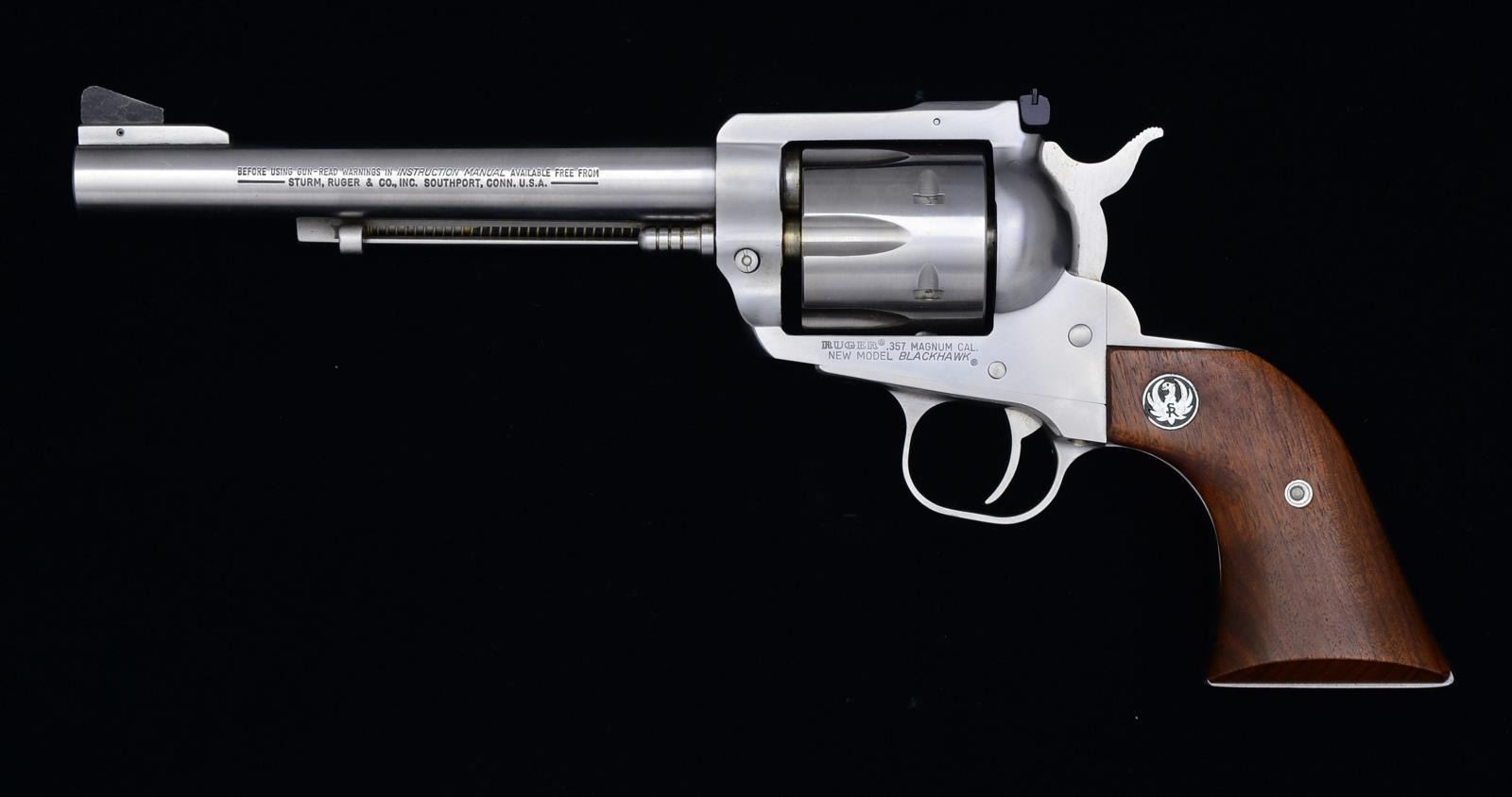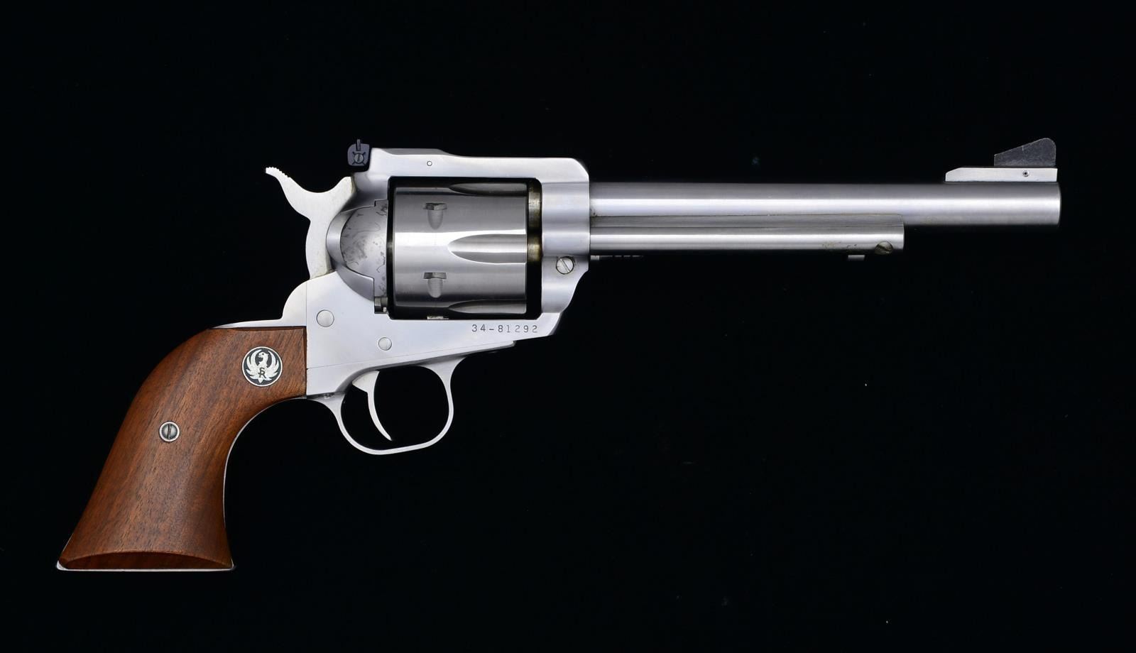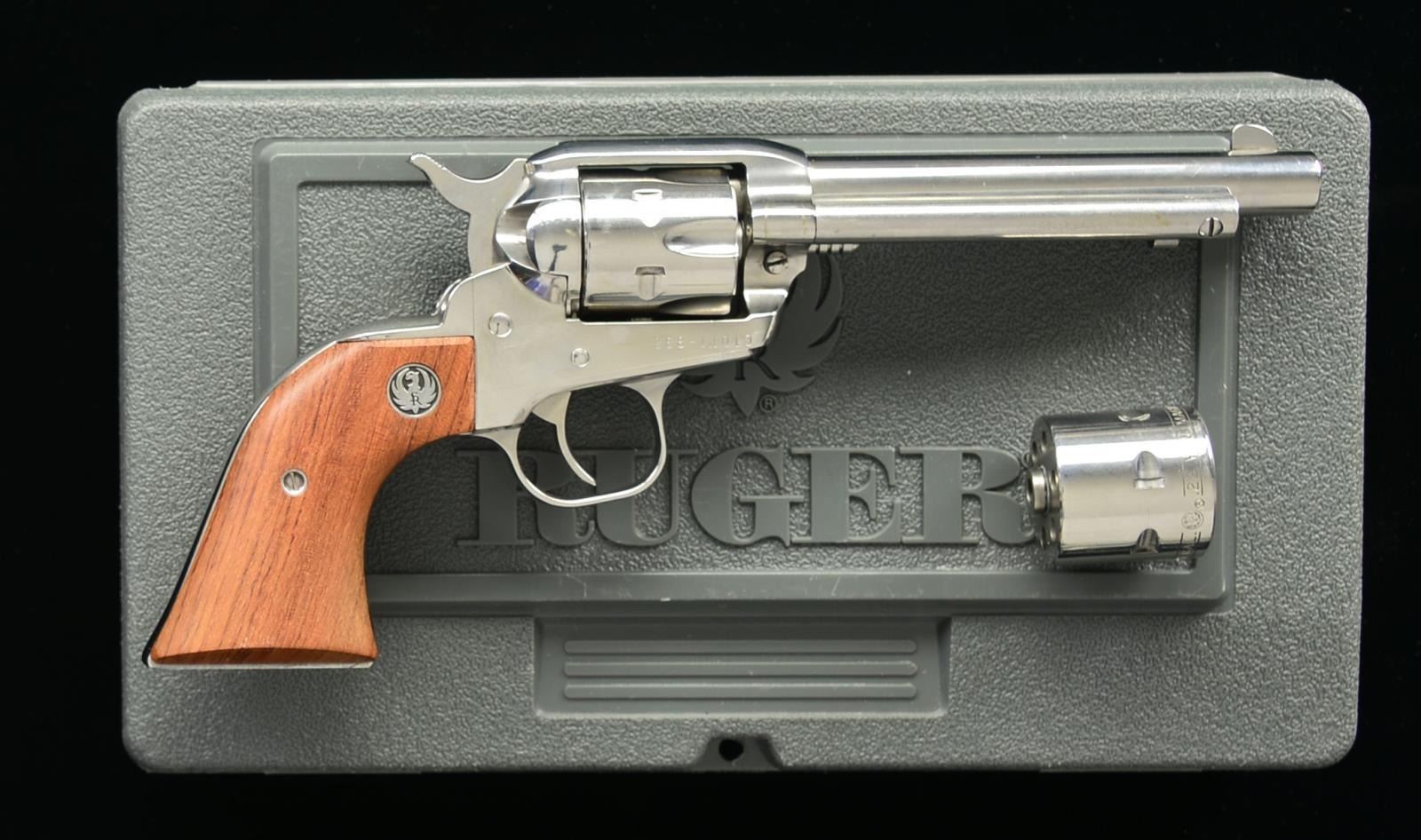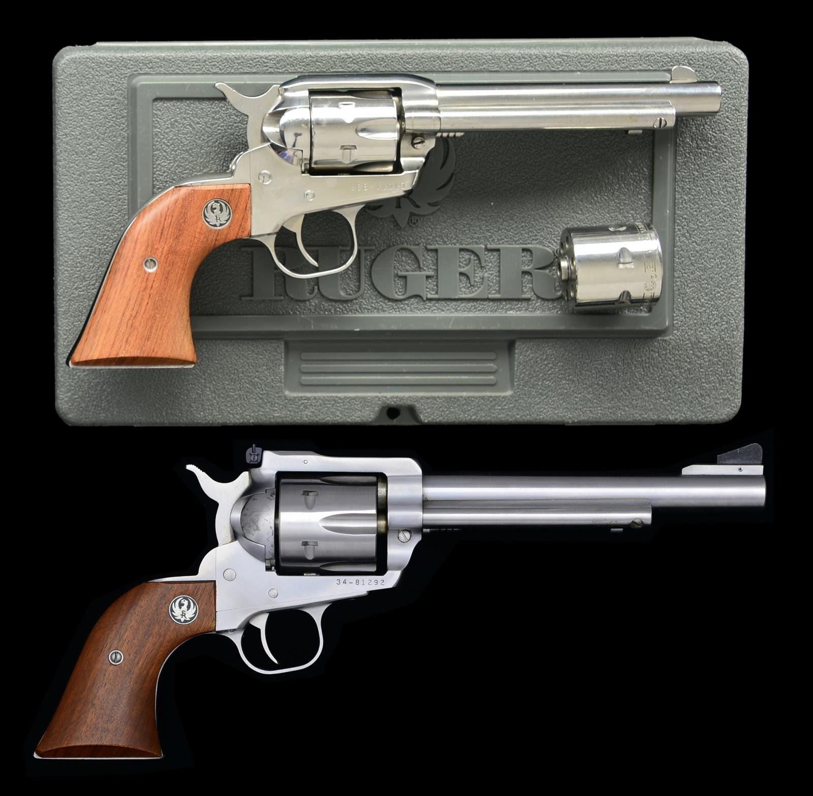1) NEW MODEL .22 CAL. SINGLE SIX CONVERTIBLE. Cal. 22 LR. S# 268-11010. Bbl. 5 1/2" w/ high gloss stainless steel finish. Standard sights. Fluted cyl. Stainless grip frame w/ rosewood grips & Ruger medallions. UNATTACHED ACCESSORIES: unfluted spare cyl. for .22 Win. Mag. scratch numbered to this revolver. Gray plastic carrying case w/ instruction papers. CONDITION: close to “near new” w/ some white scratches, mostly on bottom of bbl. Grips are very fine. Mechanically crisp. Spare cyl. w/ evidence of firing. (20-3253/MGM). 2) STAINLESS STEEL NEW MODEL BLACKHAWK IN .357 MAGNUM. Cal. 357 Mag. S# 34-81292. Bbl. 6 1/2" w/ adj. sights. Fluted cyl. Stainless steel grip frame w/ walnut grips having Ruger medallions. CONDITION: close to “as new” w/ a few very scattered minor marks w/ a barely discernible drag line on cyl. Mechanically crisp. (20-3267/MGM). BOTH MODERN. $700-1,000.