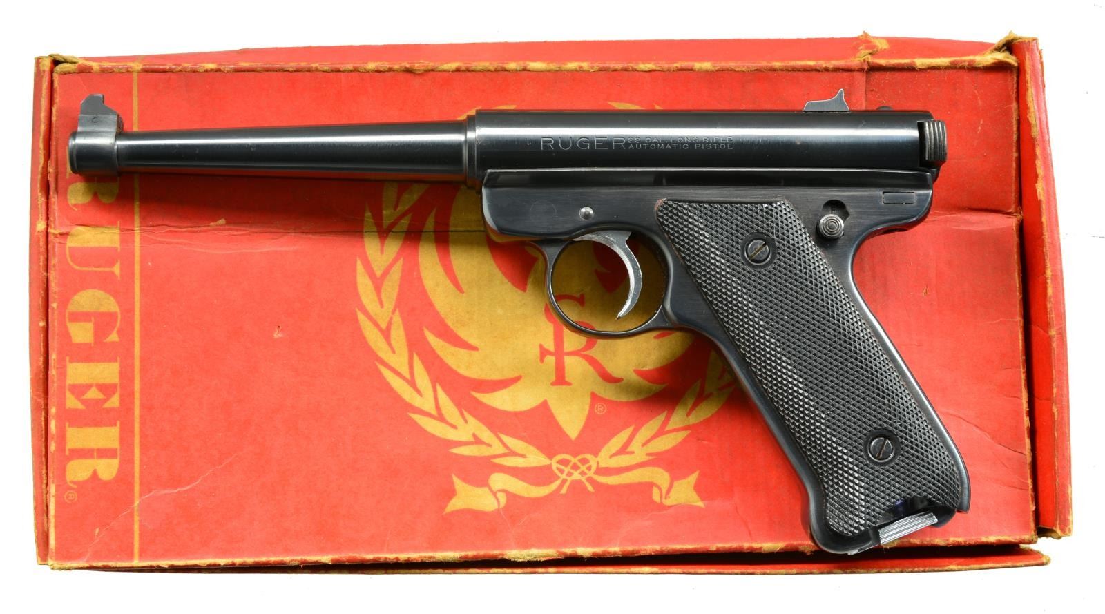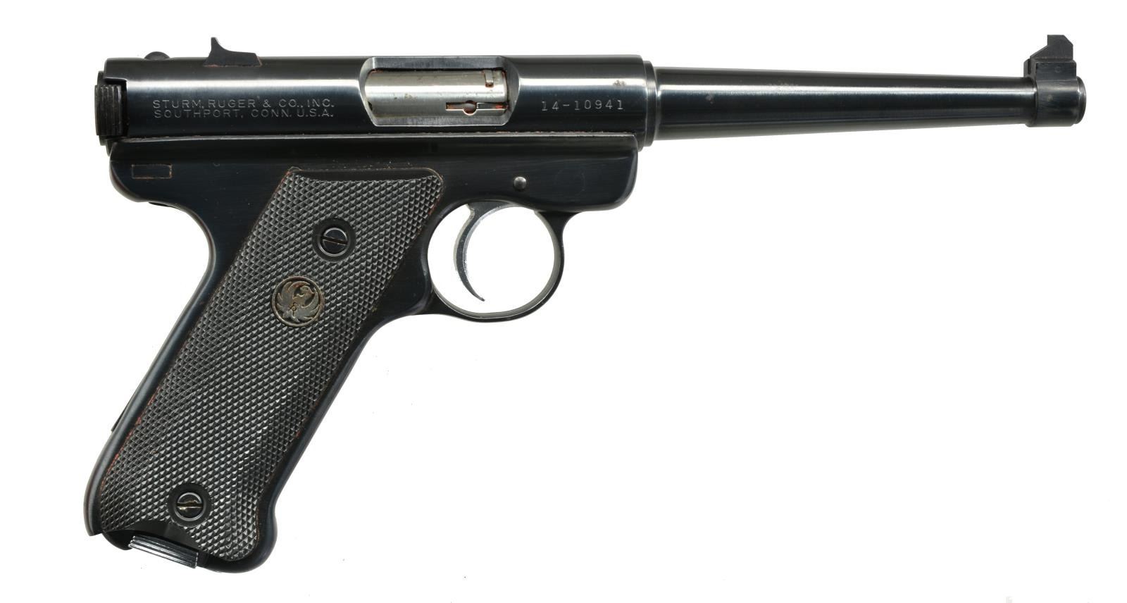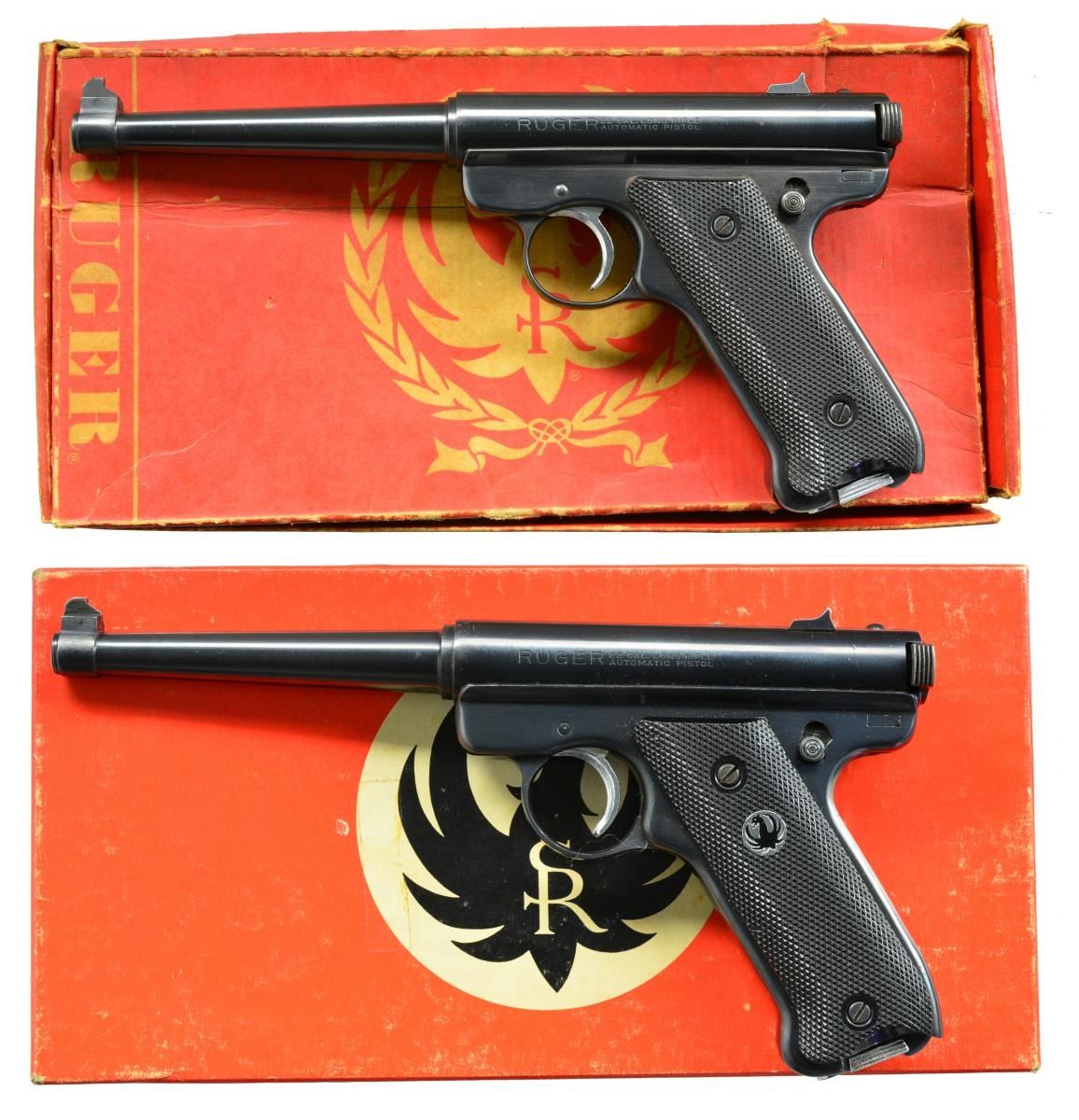 BOTH: cal. 22 LR. Bbl. 6". Blued w/ checkered black plastic grips. Chrome plated triggers. Fixed sights. MAGS: 3 factory 9 rd. w/ chrome bases: 2 Slotted right side only, 1 slotted both sides. 1) S# 14-10941. Bicentennial marked model mfg. 1976. Silver eagle medallion. UNATTACHED ACCESSORIES: good general appearing original red 1 piece box w/ worn edges & busted corner on lower. Lid w/ inked line. Overall patina appearance. CONDITION: occasional very sm. faint spot of peppery oxidation. w/ generally near excellent appearance. Near excellent bore & grips. (20-2355/NW). MODERN. 2) S# 429237. Mfg. 1966 w/ black eagle medallion. Top of receiver just behind port has 10-32 drilled & tapped hole w/ plug screw; likely for some auxiliary sight. UNATTACHED ACCESSORIES: very good original style unnumbered 2 piece box w/ warranty card & user tips. Checkered white plastic Fitz target grips w/ thumb rest for RH use. CONDITION: very good to excellent overall appearance w/ thinning on back strap & occasional very sm. spot of peppery oxidation. Near excellent bore & grips. PROVENANCE: The Estate of Richard Willman. (20-2357/NW). CURIO. $450-600.