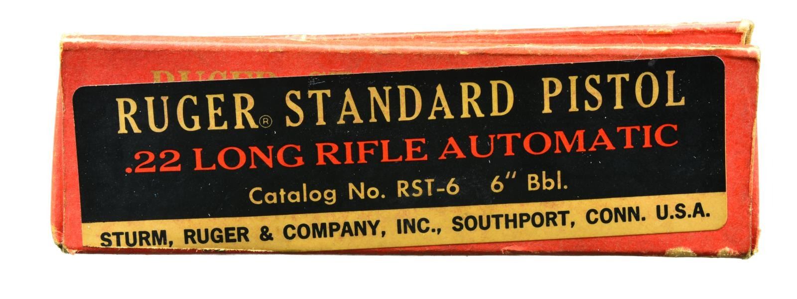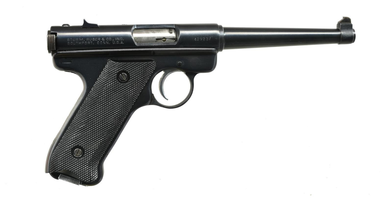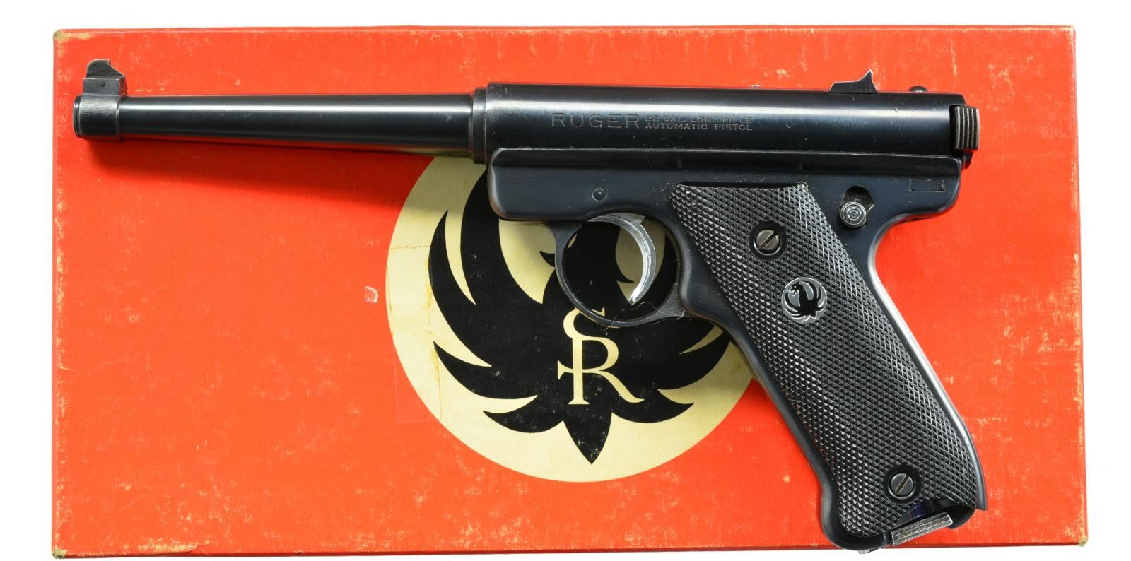 BOTH: cal. 22 LR. Bbl. 6". Blued w/ checkered black plastic grips. Chrome plated triggers. Fixed sights. MAGS: 3 factory 9 rd. w/ chrome bases: 2 Slotted right side only, 1 slotted both sides. 1) S# 14-10941. Bicentennial marked model mfg. 1976. Silver eagle medallion. UNATTACHED ACCESSORIES: good general appearing original red 1 piece box w/ worn edges & busted corner on lower. Lid w/ inked line. Overall patina appearance. CONDITION: occasional very sm. faint spot of peppery oxidation. w/ generally near excellent appearance. Near excellent bore & grips. (20-2355/NW). MODERN. 2) S# 429237. Mfg. 1966 w/ black eagle medallion. Top of receiver just behind port has 10-32 drilled & tapped hole w/ plug screw; likely for some auxiliary sight. UNATTACHED ACCESSORIES: very good original style unnumbered 2 piece box w/ warranty card & user tips. Checkered white plastic Fitz target grips w/ thumb rest for RH use. CONDITION: very good to excellent overall appearance w/ thinning on back strap & occasional very sm. spot of peppery oxidation. Near excellent bore & grips. PROVENANCE: The Estate of Richard Willman. (20-2357/NW). CURIO. $450-600.