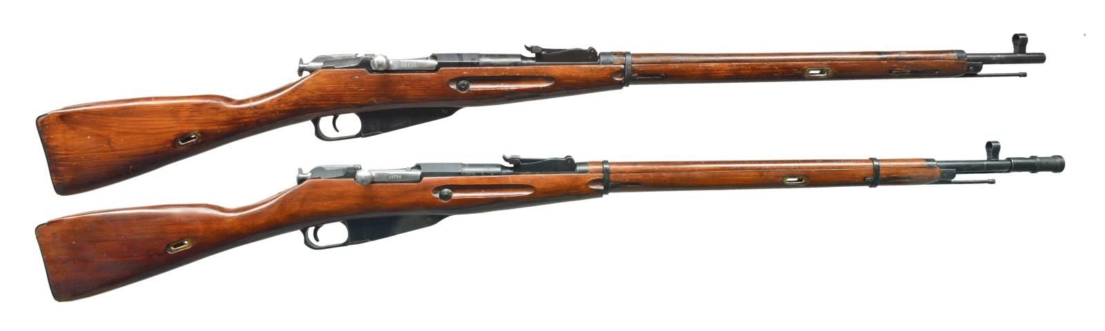 1) Cal. 7.62x54R. S# 9130120676. Bbl. 28 5/8". Original S# matches on bbl., bolt, cocking piece, floorplate & buttplate. Import marked on top left flat of hex receiver. Tangent rear sight graduated to 2000m. Post front sight w/ protective hood. Cleaning rod is present. Hardwood stock set has metal lined sling slots. Upper band is not present. UNATTACHED ACCESSORIES: black nylon padded gun case. CONDITION: stock set has light wear, scattered dents & handling marks w/ flaking of finish notable on forend & handguard. Metal has 75% original thinning finish. Fair worn bore turning dark. (21-757/RW). 2) Cal. 7.62x54R. S# 011980. Bbl. 28 5/8". Original S#. matches on bbl., bolt, floorplate & buttplate. Hexagon receiver marked on top left flat w/ import markings. Bbl. marked over chamber w/ "USSR" & "RSFSR" indicating mfg. at Premier Tula Arsenal according to "The Mosin-Nagant Rifle" by Lapin. Bbl. dated 1928. Tangent rear sight graduated to 2000m. Post front sight w/ protective hood. Cleaning rod is present. Hardwood stock set w/ brass lined sling slots. UNATTACHED ACCESSORIES: 17 1/4" spike bayonet w/ 70% original finish matches original rifle S#. Black nylon padded gun case. CONDITION: stock set has arsenal rework type finish w/ added finish & light wear, flaking, dents & handling marks. Metal has 80% thinning original finish w/ light wear & scattered scratches. Good, shiny bore w/ wear to lands. (21-758/RW). BOTH CURIO. $300-500.