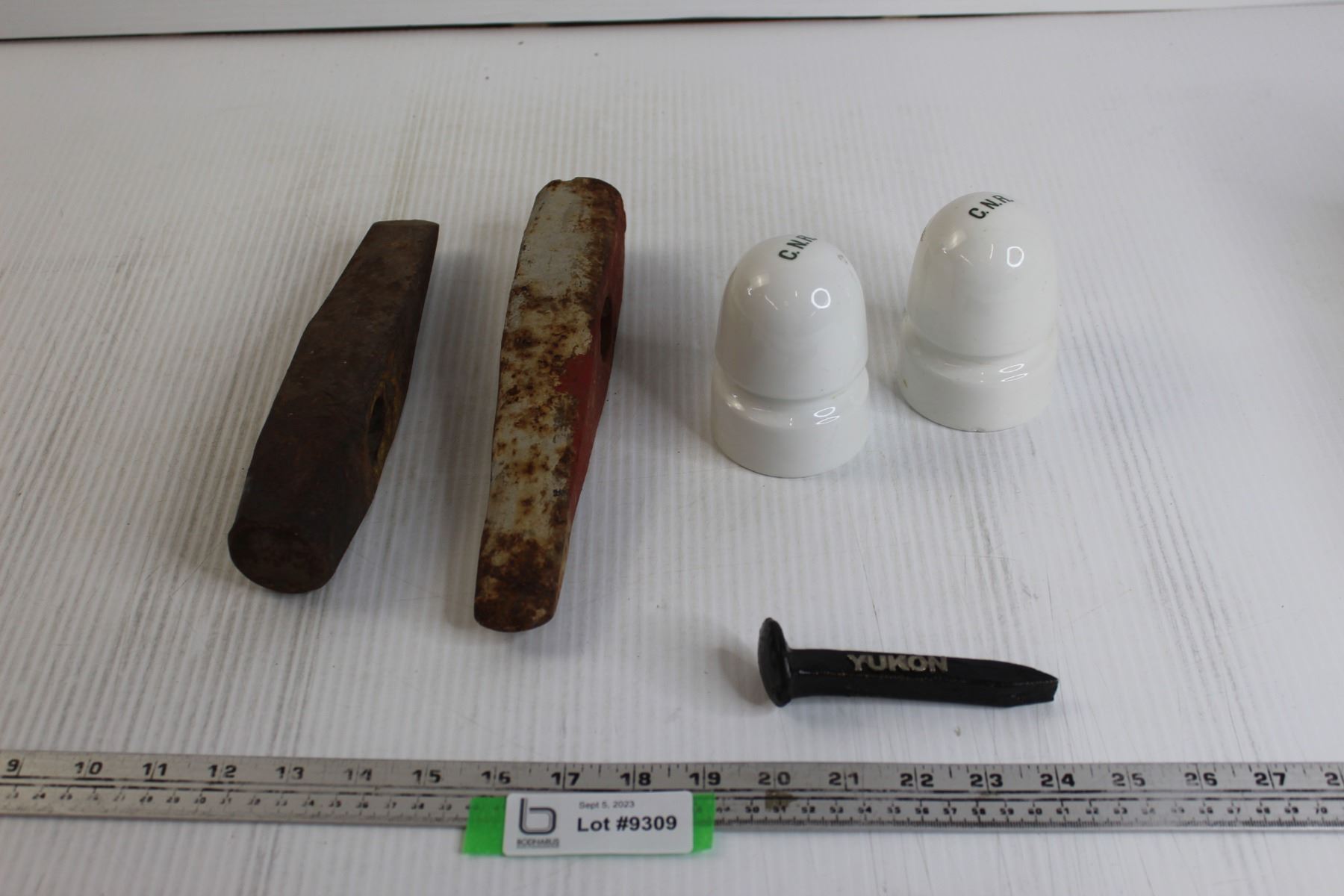 (2) Railway Spike Hammers, Railway Spike, (2) Porcelain C.N.R. Insulators