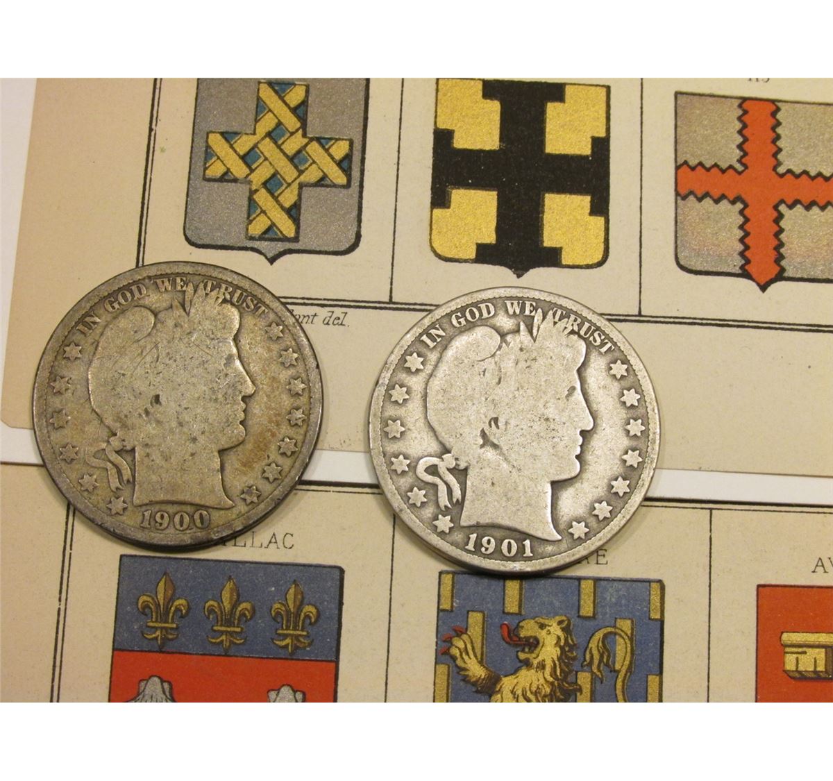 (2) Ready to Frame Illustrations of Heraldic Shields for various departments of France; & 1900 P & 1901 P Barber Half Dollars in G-AG.