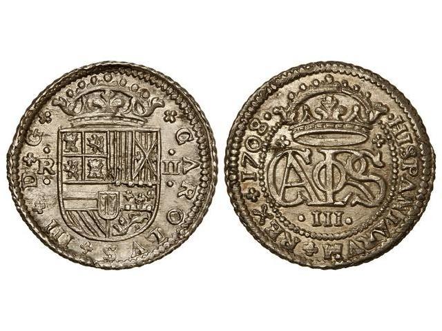 2 Reales. 1708. BARCELONA. Brillo original. ESCASA ASÍ. Cal-24. SC-.