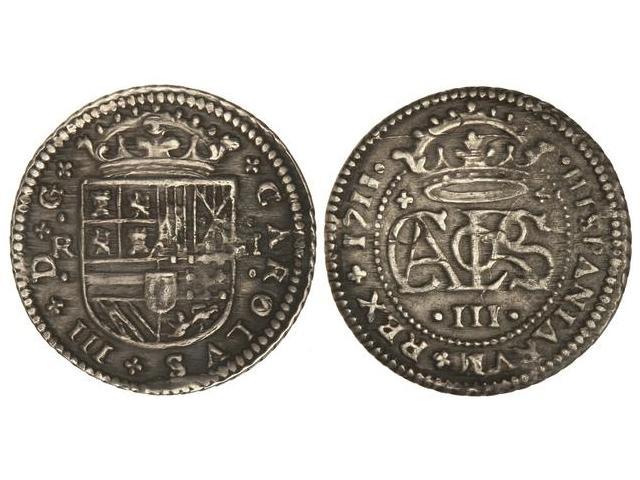 2 Reales. 1711. BARCELONA. Pátina. (Algo alabeada). Cal-28. MBC.