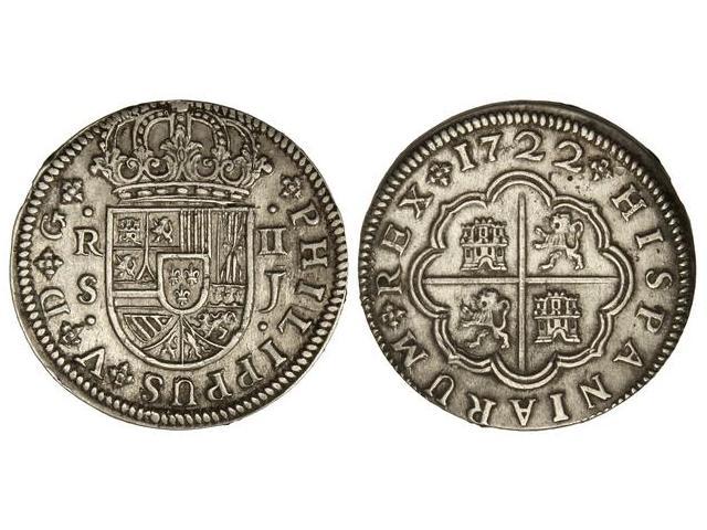 2 Reales. 1722. SEVILLA. J. Bella. Gran parte de brillo original. Cal-1424. EBC+.