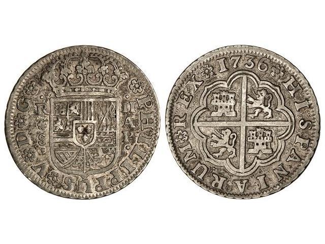 2 Reales. 1736. SEVILLA. A.P. Pátina. ESCASA. Cal-1438. MBC.