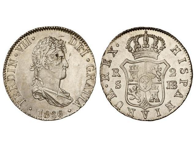 2 Reales. 1826. SEVILLA. J.B. Brillo original. (Hojitas en anverso). Cal-1034. SC.