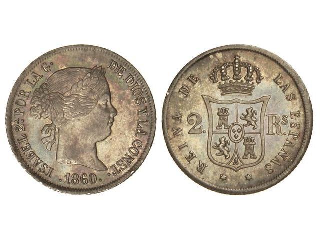 2 Reales. 1860. MADRID. Brillo original. Precios pátina. Magnífico ejemplar. RARA ASÍ. Cal-369. EBC+.