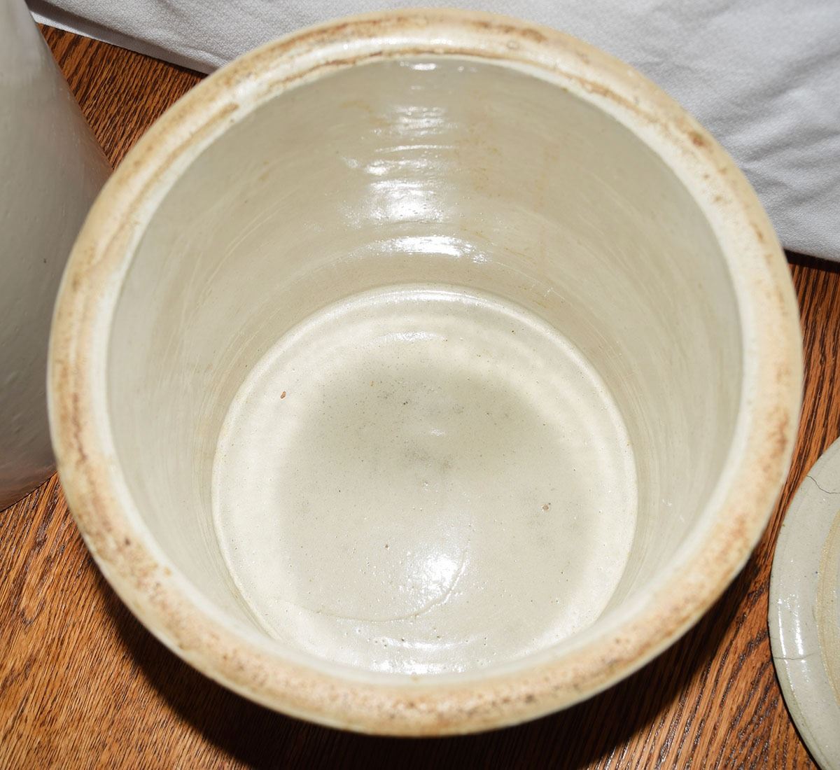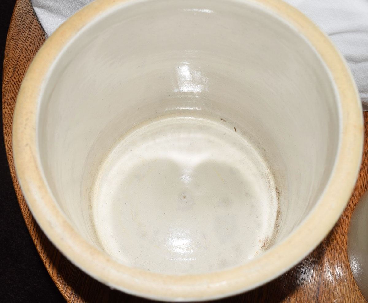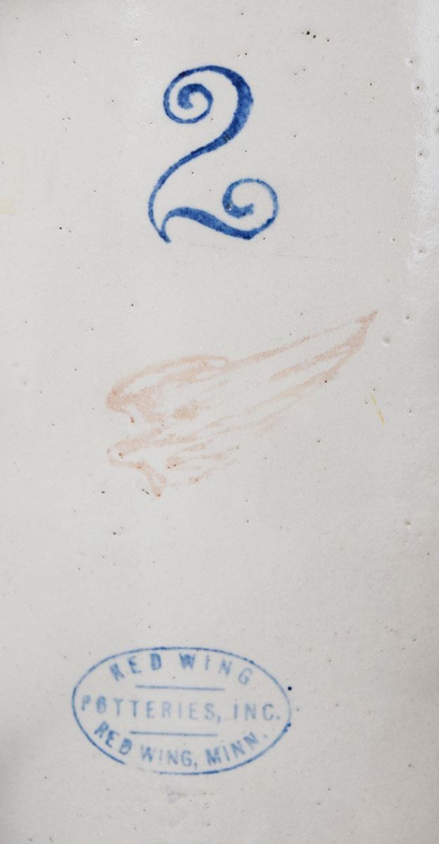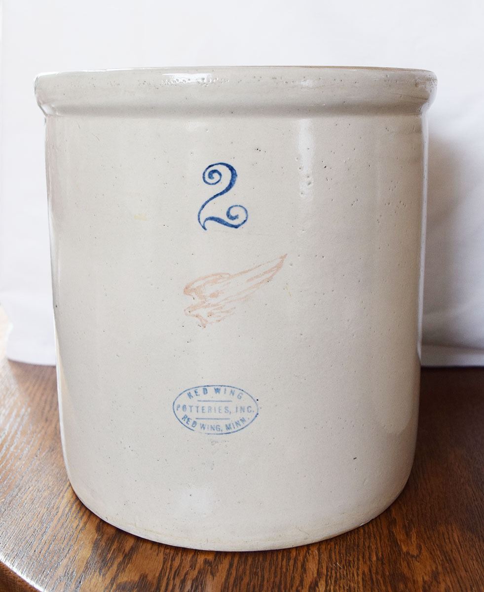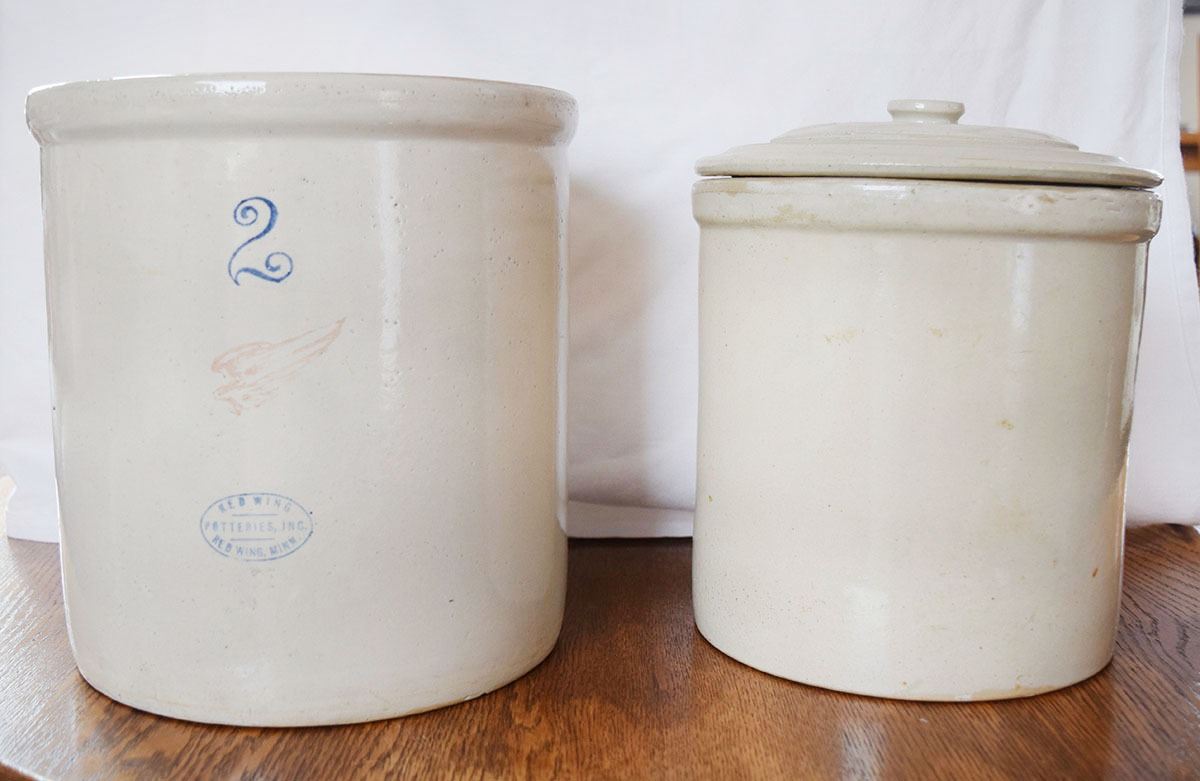 (2) Red Wing crocks: 1 gal with lid, no mark, small crack on lid & 2 gal with small wing