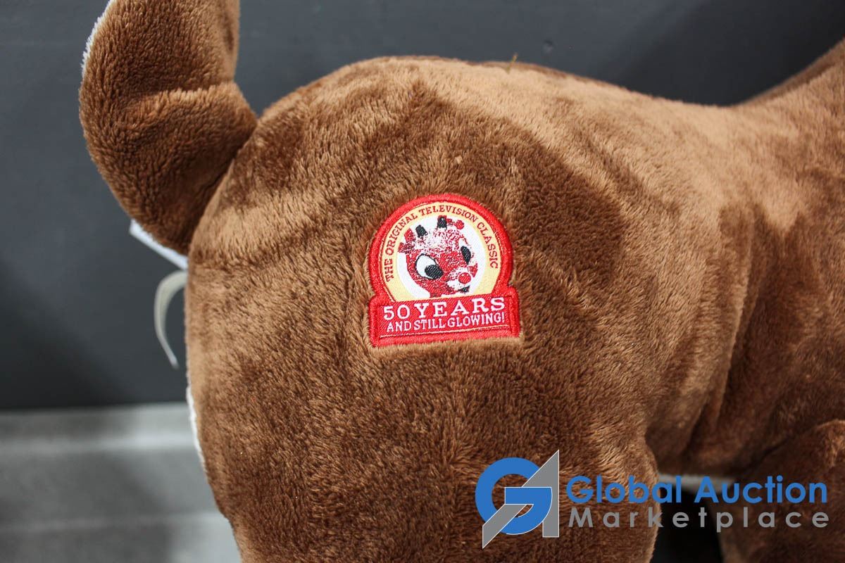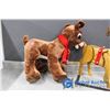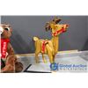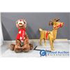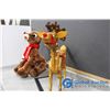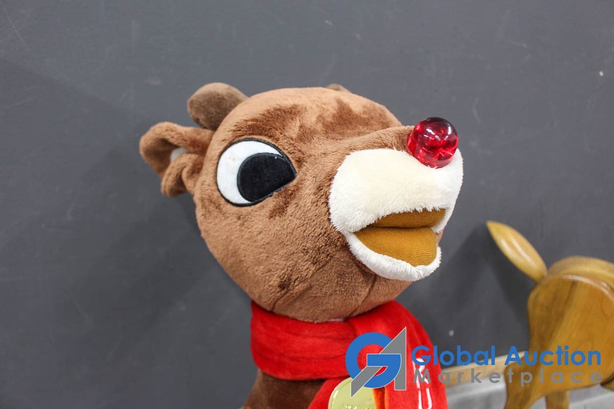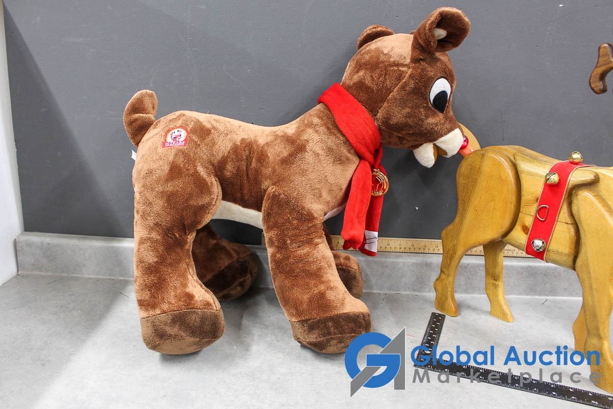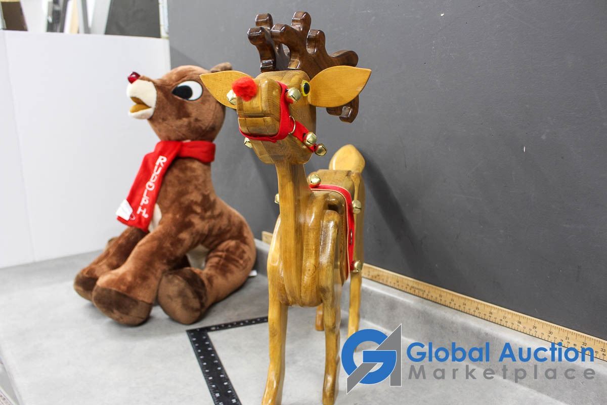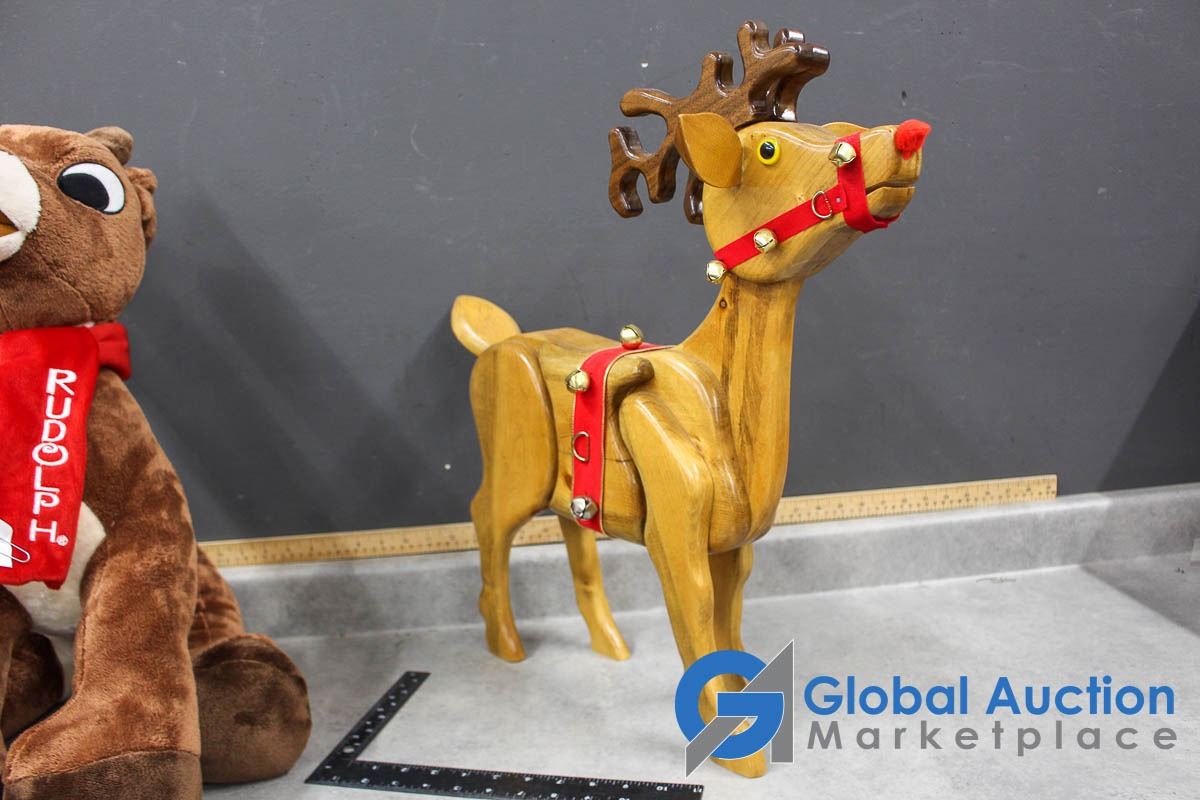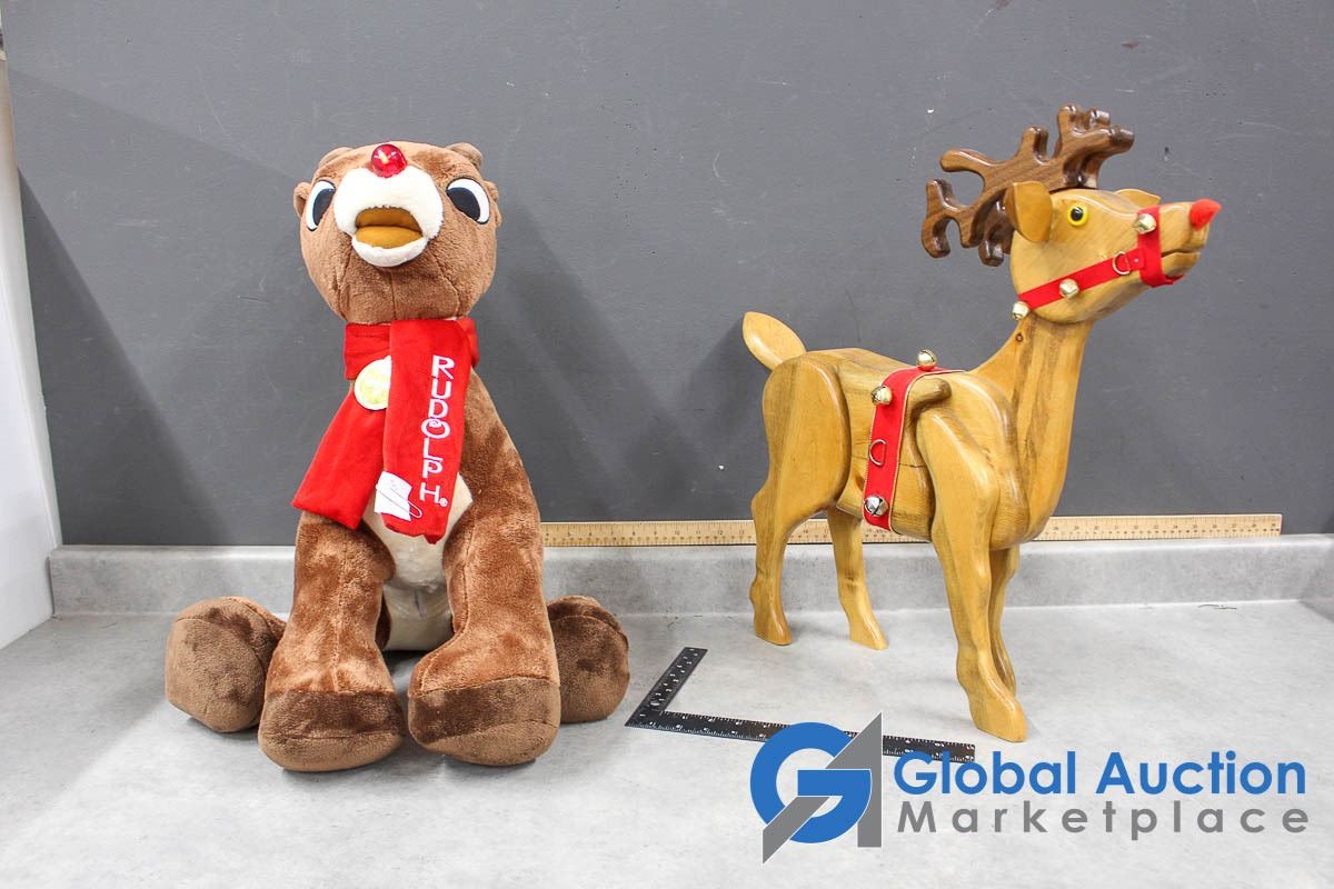 (1) handmade wooden reindeer; (1) plush singing Rudolph.