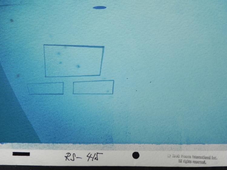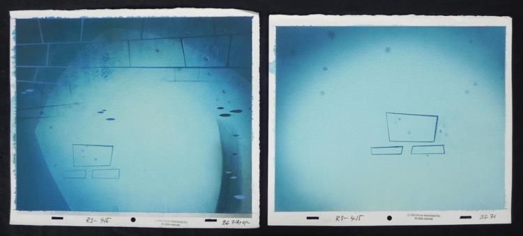 These two original production backgrounds were done for The Ren & Stimpy Show. These are both dark interior scenes with bricks--very noir looking. These two go together, as they are the same color and are marked with the same number 415. * * Original hand painted production background, on heavy paper with pegholes and animator's notations at the lower margin Overall size is 11 x 13 1/2 inches Very good conditionDetails: One sheet has the bottom portion taped onOriginal Production Backgrounds are used in the making of the final version of animated productions. The background establishes the location and the overall good mood of the scenee. Typically, a background layout artist creates a drawing to establish the content of the scene, placement of characters, perspective and camera angle. Based on this drawing, the background artist creates a preliminary painting to confirm all of the scenes details, then the final production background which is used in the filming of the scene. When these backgrounds are individually photographed behind the progression of production cels, and projected at a rapid succession, the images in the foreground appear to move, creating an animated scene. * These original backgrounds capture the dark side of Ren & Stimpy. *