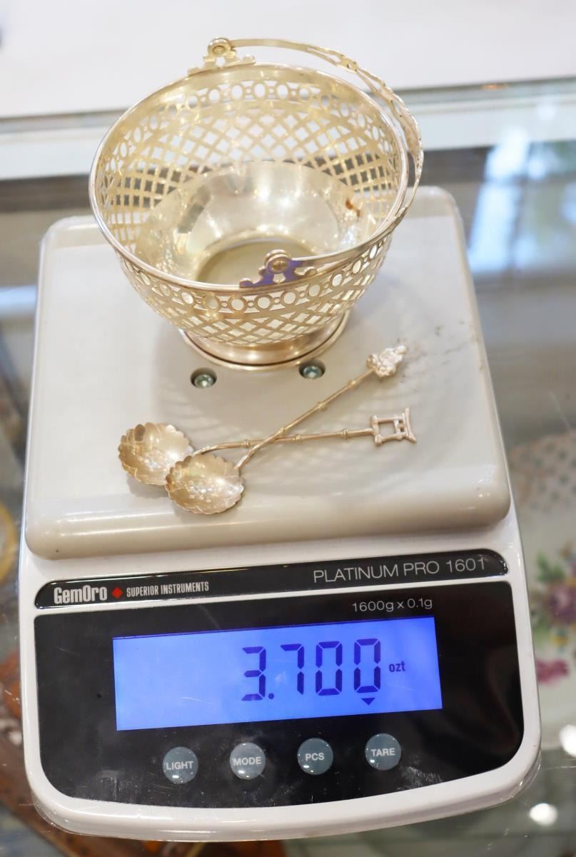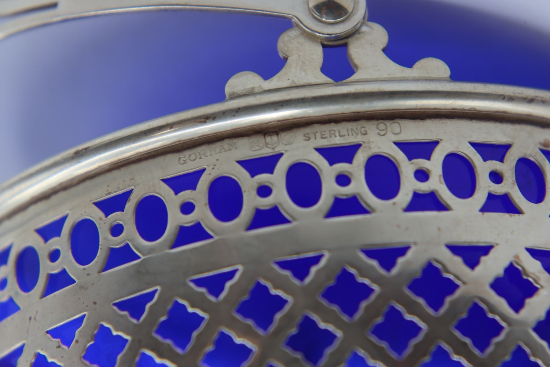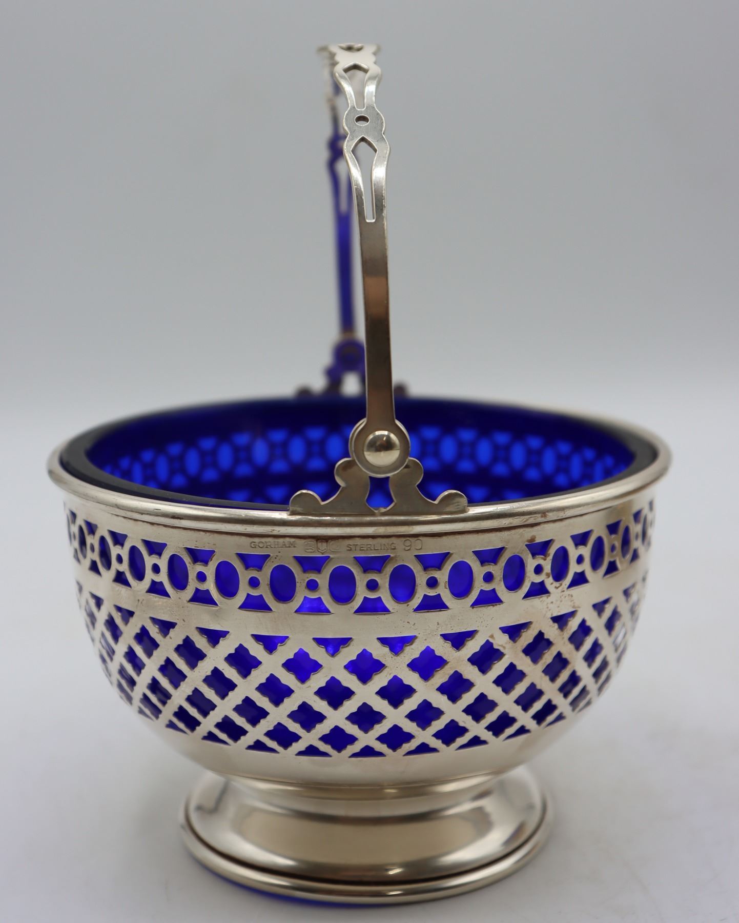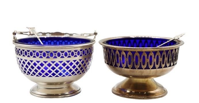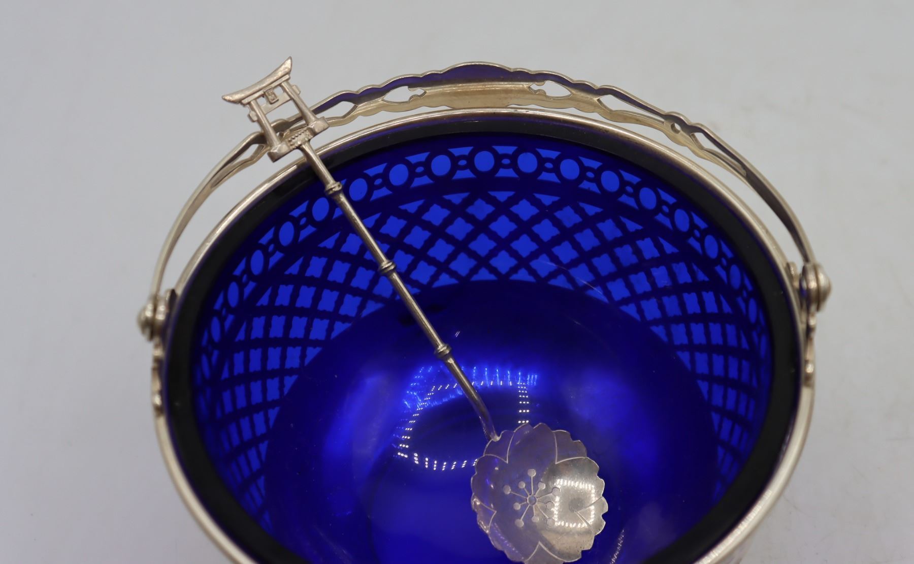 Pair of lovely vintage reticulated baskets with cobalt blue glass inserts. Basket with handle is marked Gorham Sterling 90, other basket is silver-plate. Tops of spoons are finished with Far Eastern imagery and are marked sterling 950.