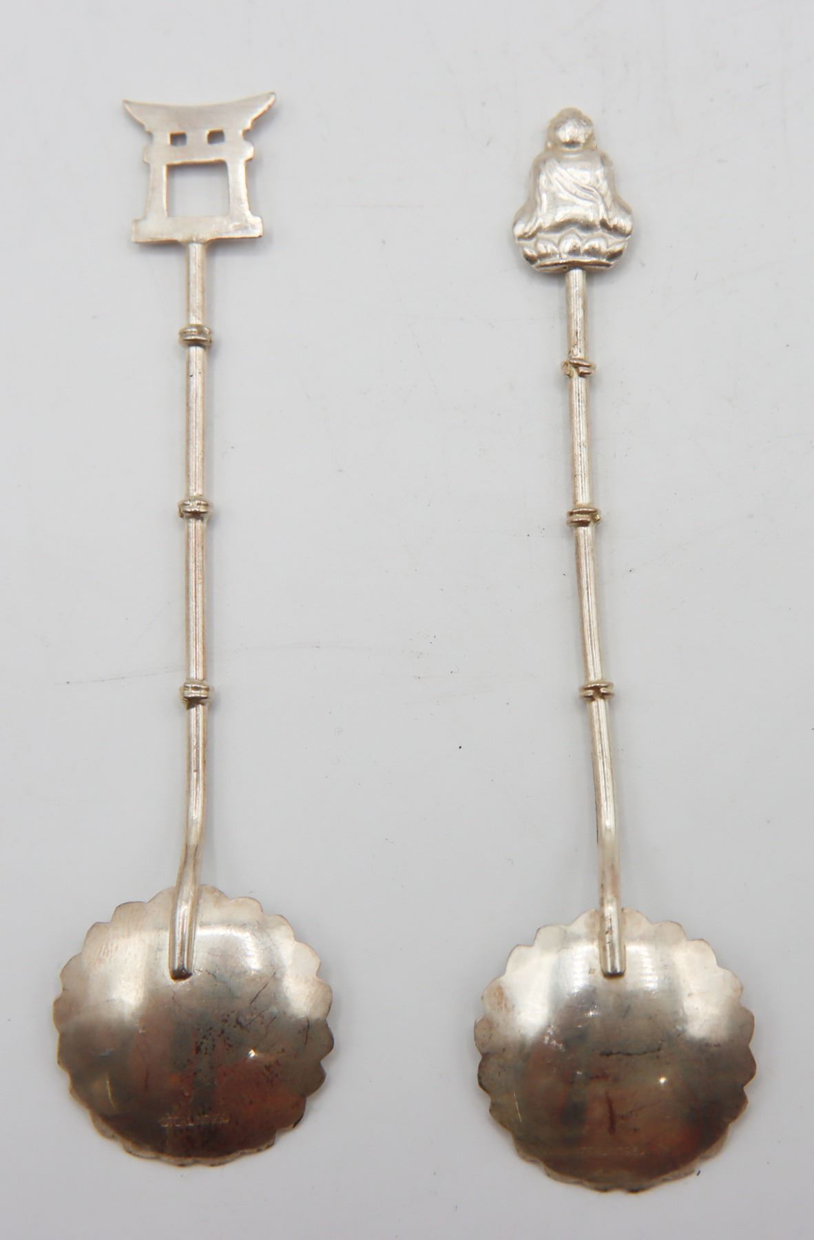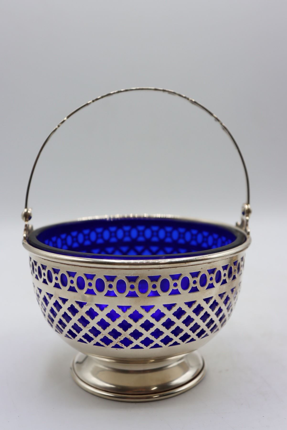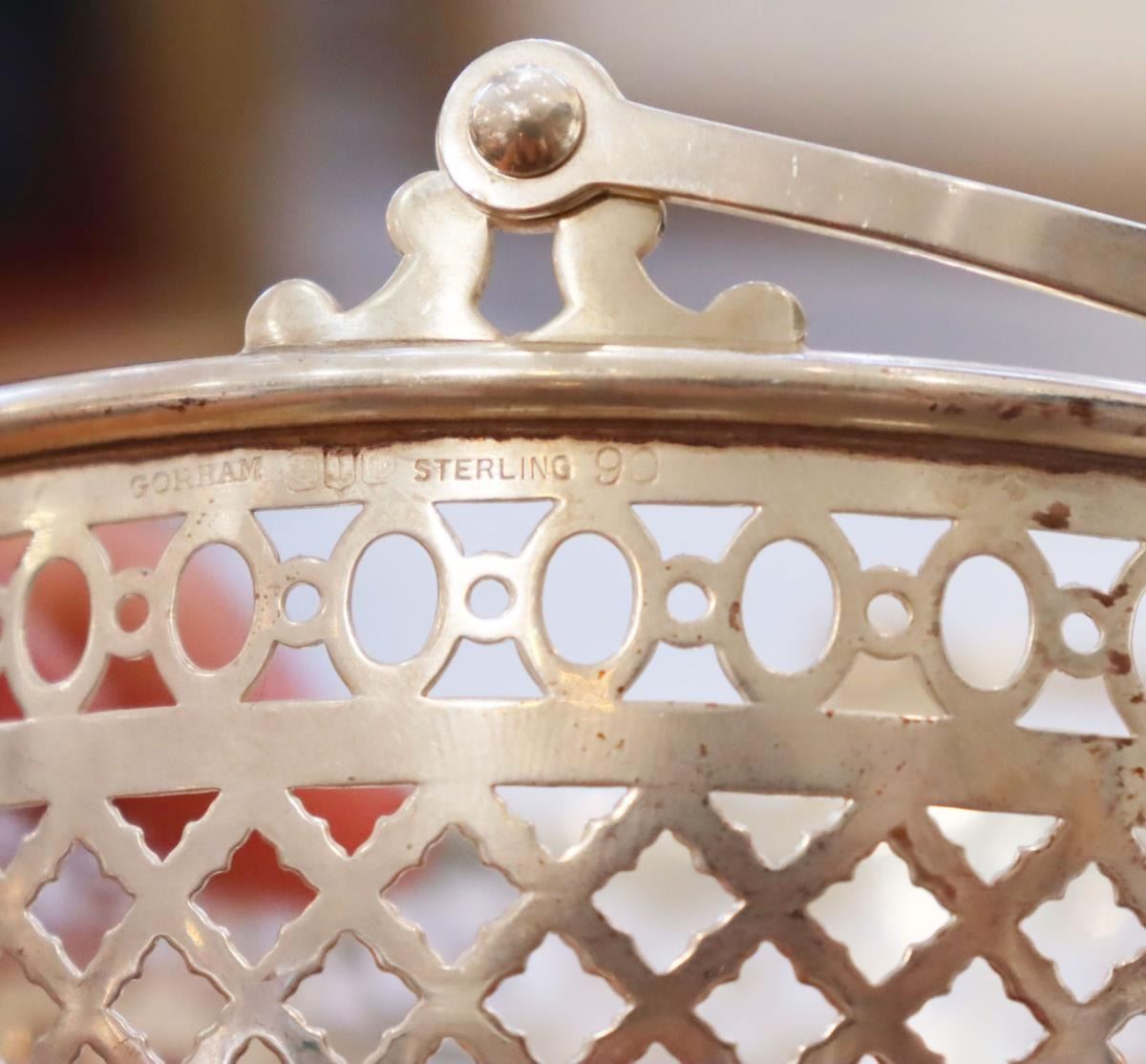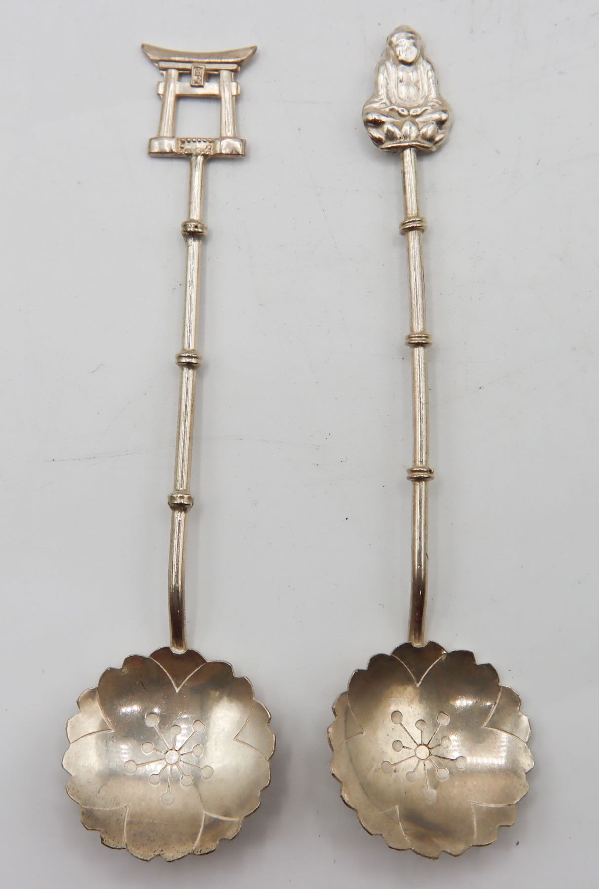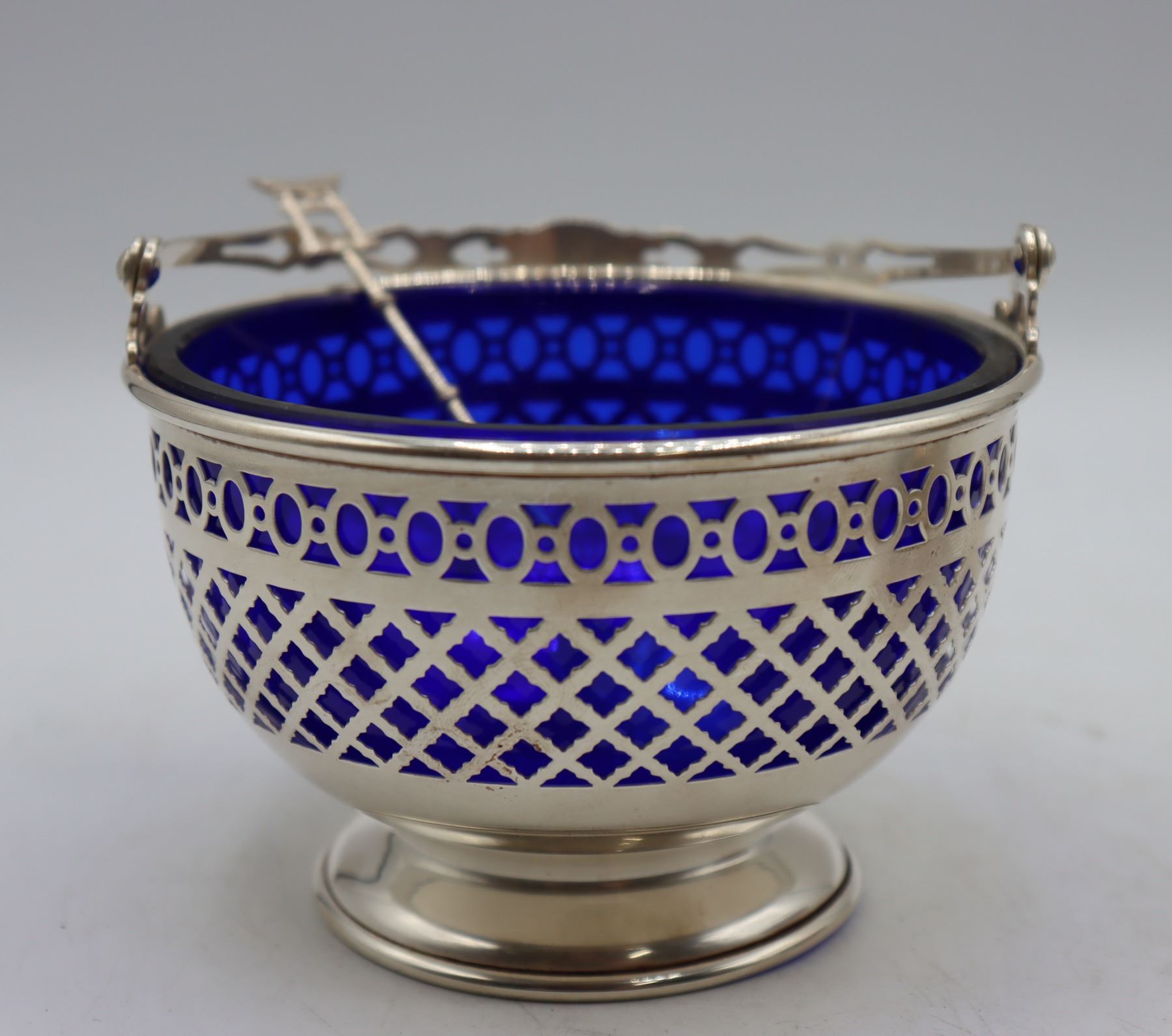 Pair of lovely vintage reticulated baskets with cobalt blue glass inserts. Basket with handle is marked Gorham Sterling 90, other basket is silver-plate. Tops of spoons are finished with Far Eastern imagery and are marked sterling 950.