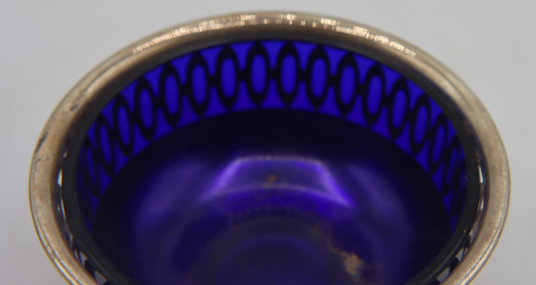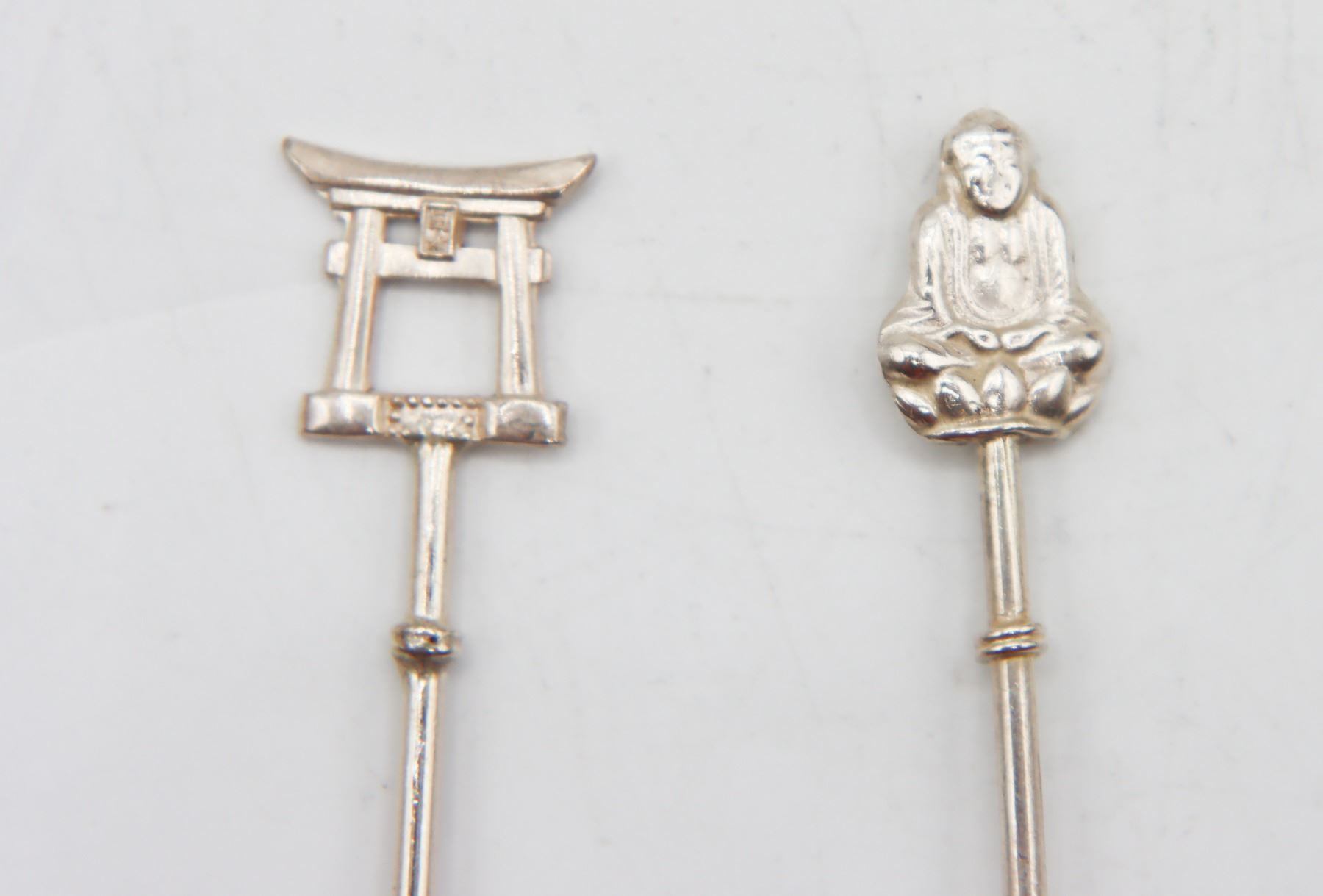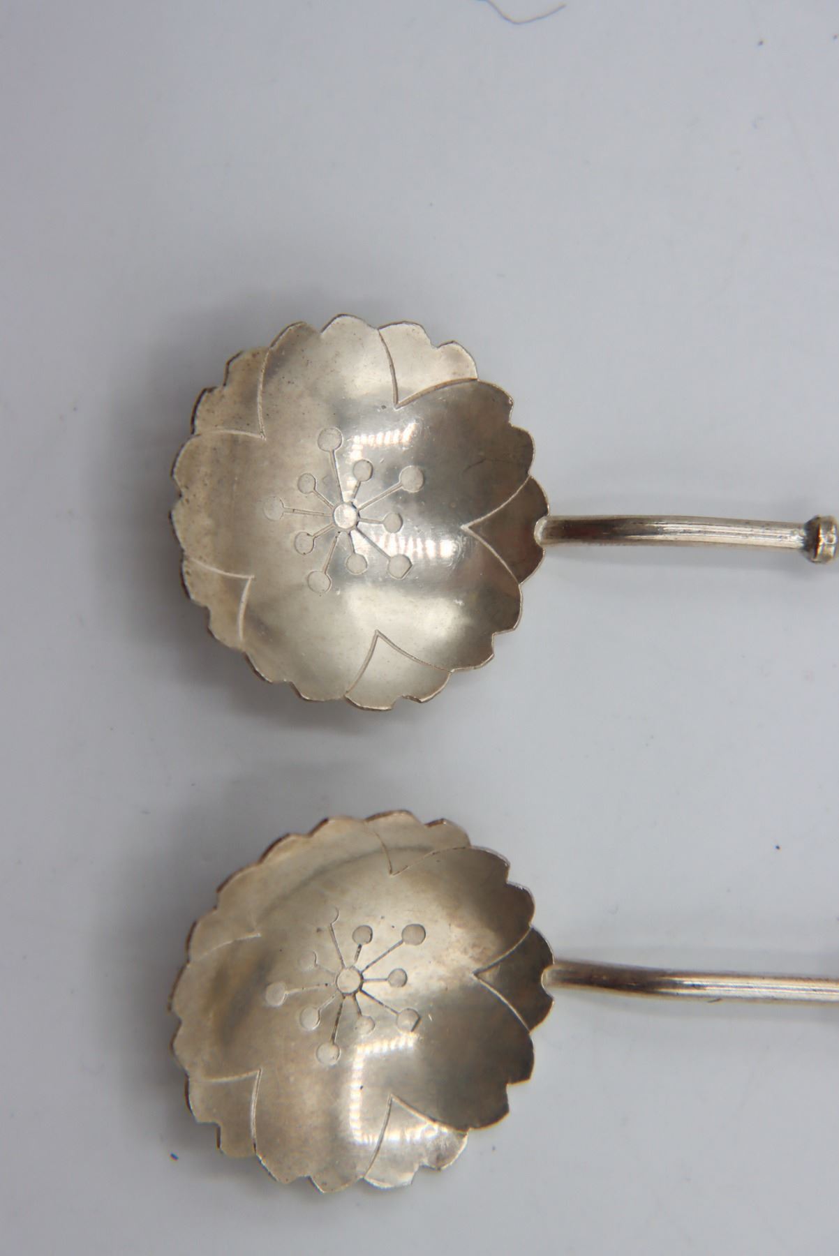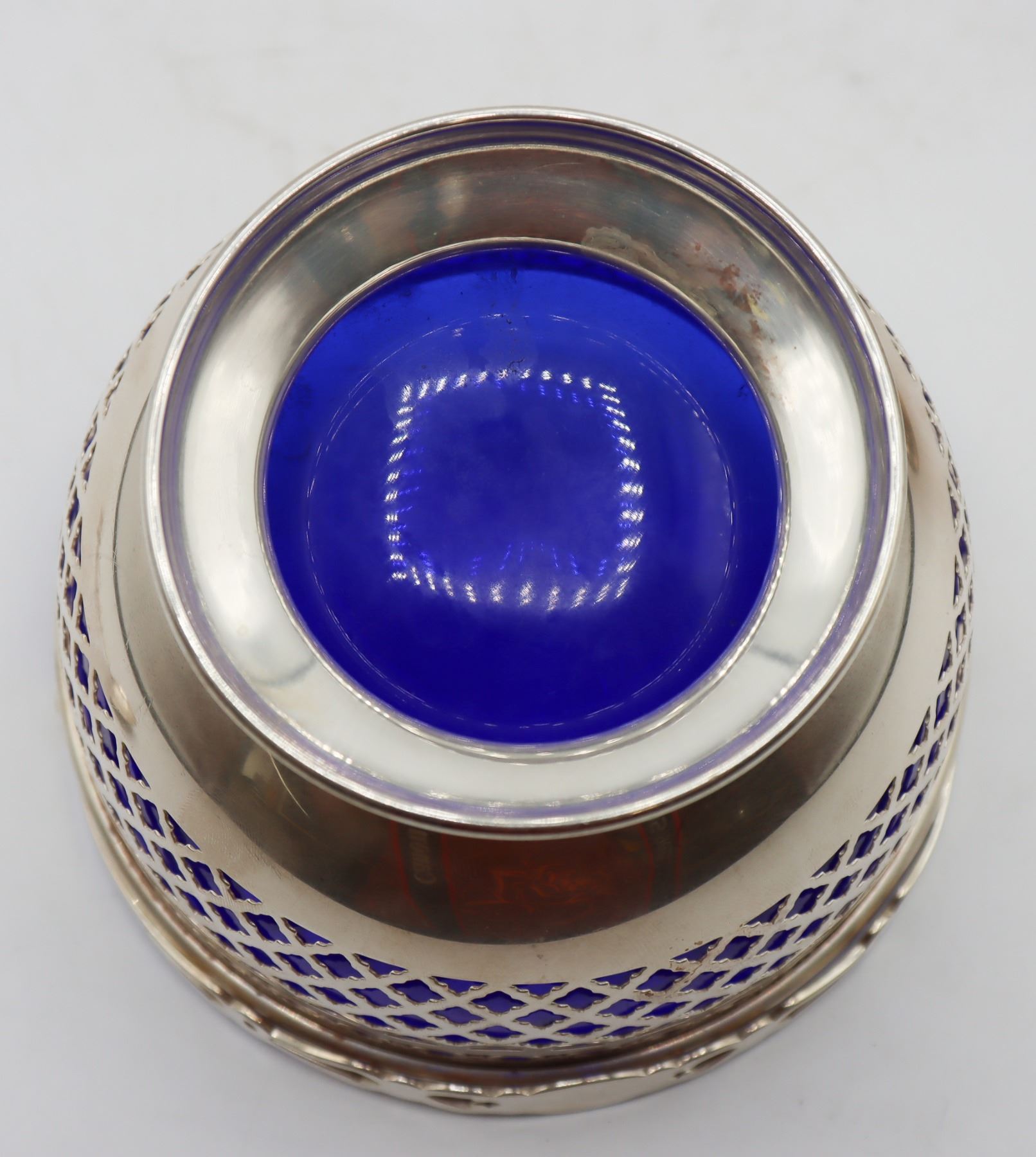 Pair of lovely vintage reticulated baskets with cobalt blue glass inserts. Basket with handle is marked Gorham Sterling 90, other basket is silver-plate. Tops of spoons are finished with Far Eastern imagery and are marked sterling 950.