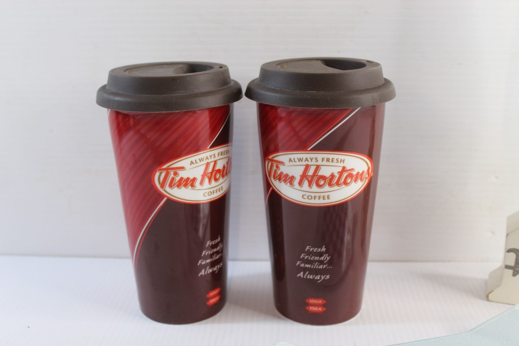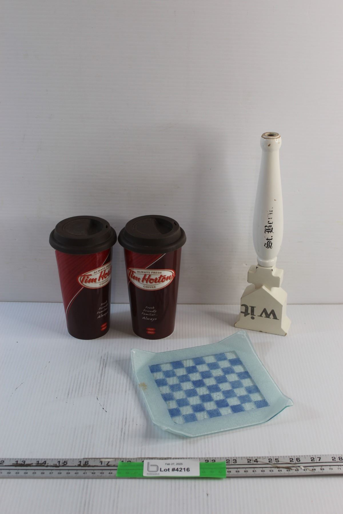(2) Reusable Tim Hortons Ceramic Cups, Beer Tap and Glass Chess Plate