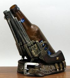 2 Revolver Wine Bottle HolderMeasures: Two revolvers balanced on a tooled leather look belt with bullets. This is a resin wood look product. Wine bottle rests on a small horseshoe. Measures: 8" H x 6" W x 8 1/2" D.