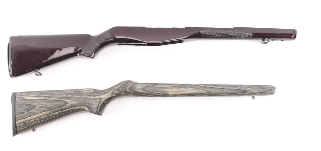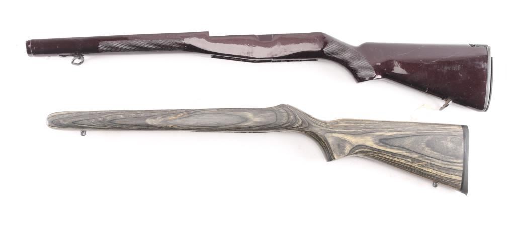 Ruger 10-22 Mag black wood grain stock and M1A1 burgundy plastic stock. In good condition.