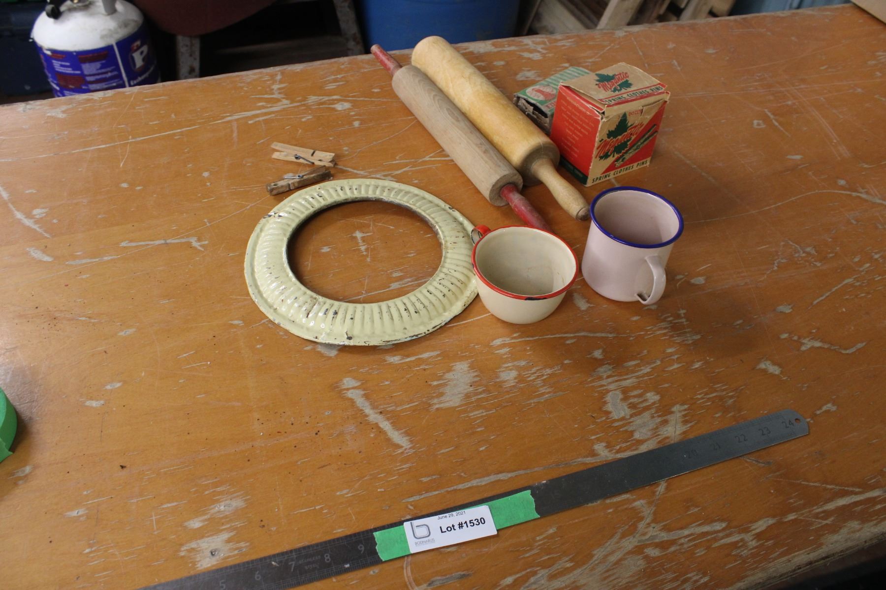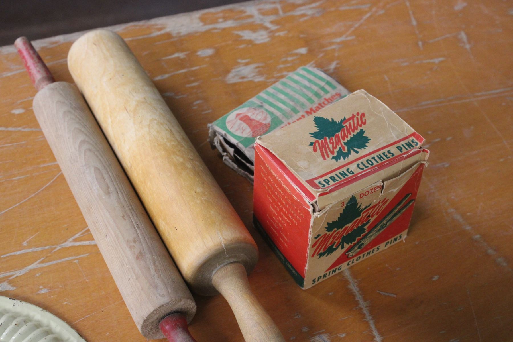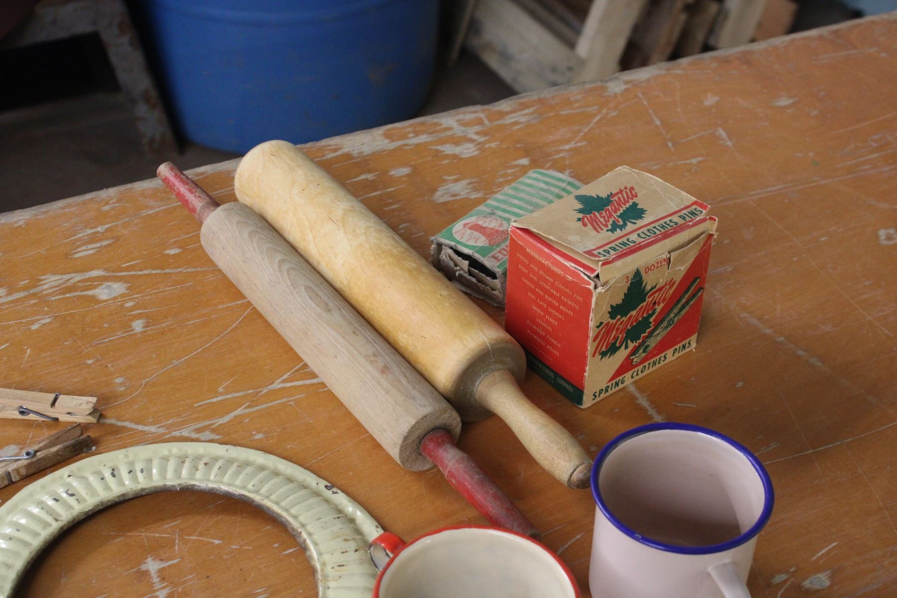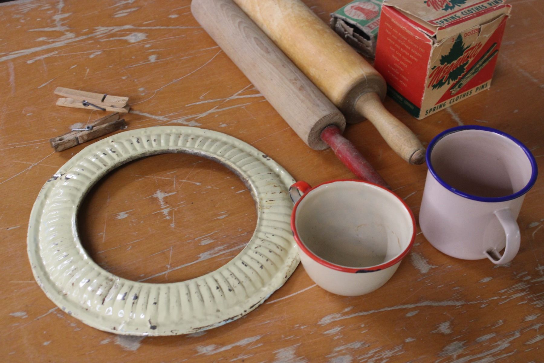 2 Rolling Pins Enamel Ware Clothes Pins