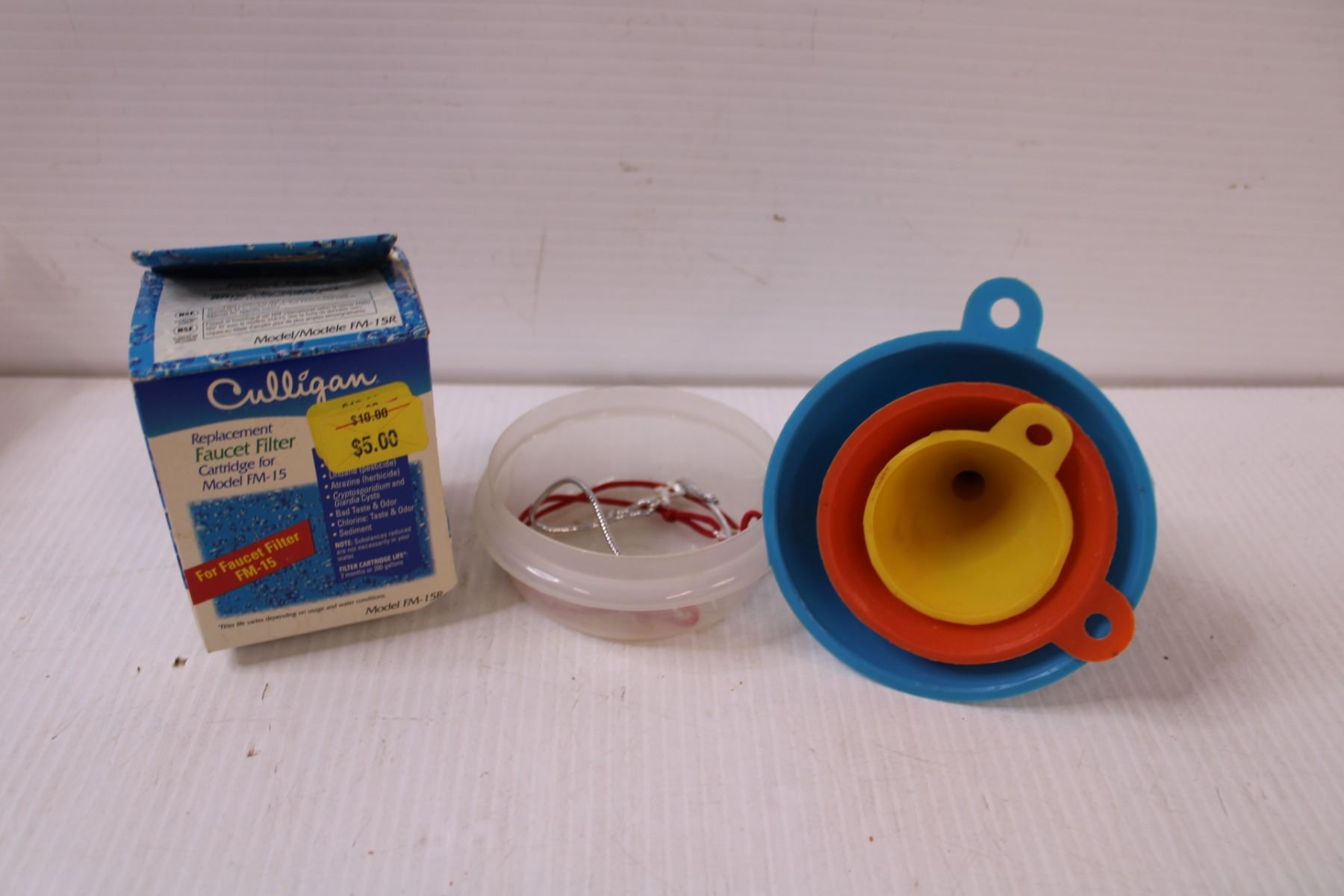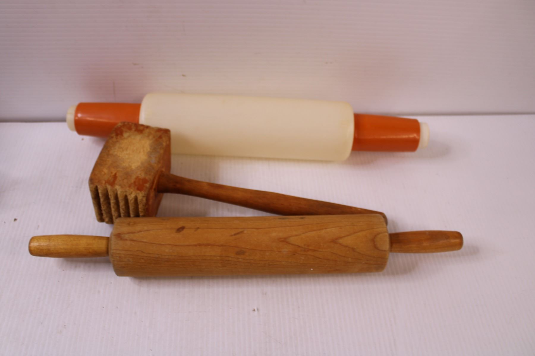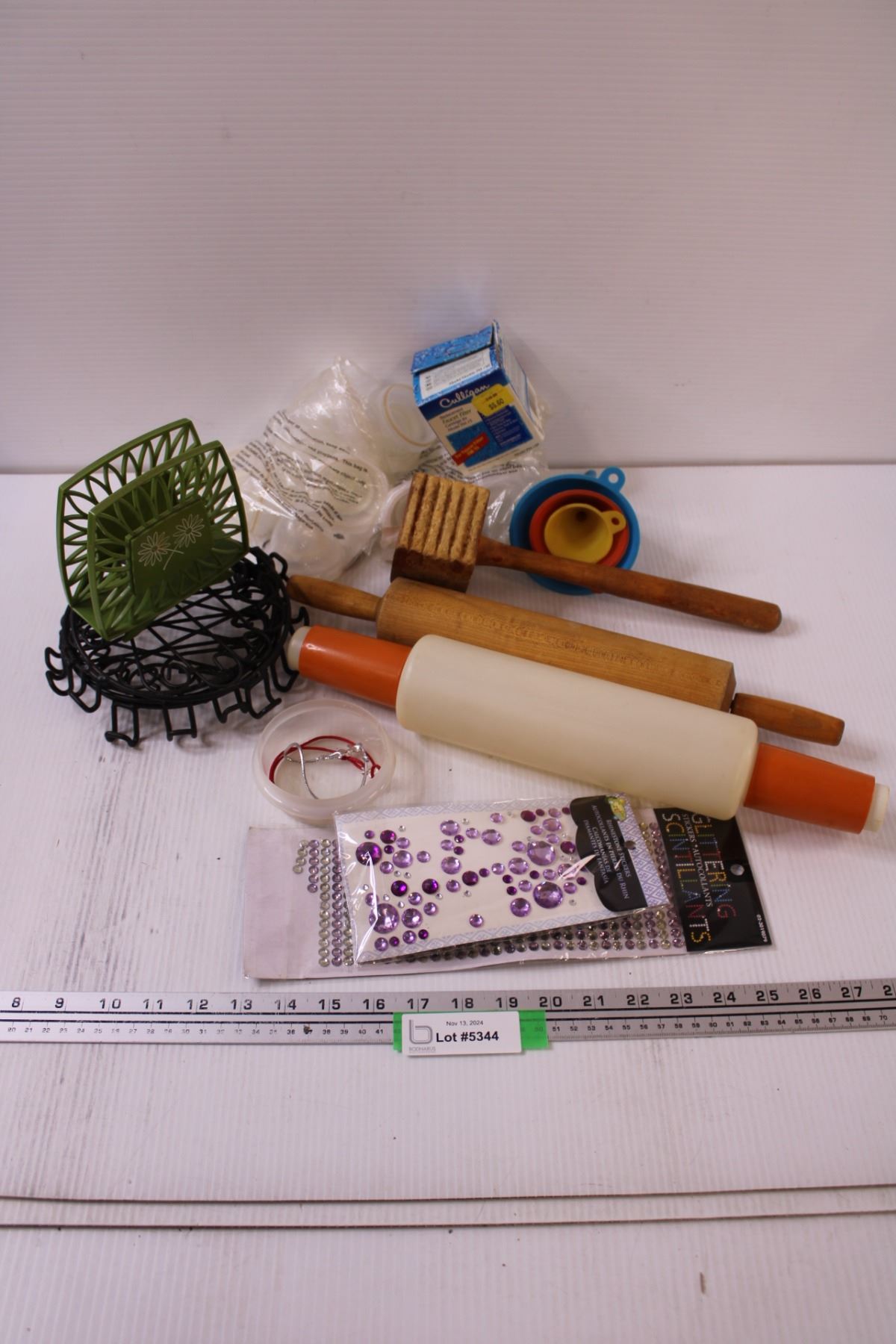 (2) Rolling Pins, Steak Tenderizer, Funnels, Filter, "Eggies", Stickers, Trivets, Napkin Holder