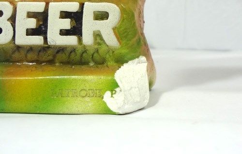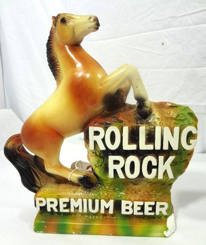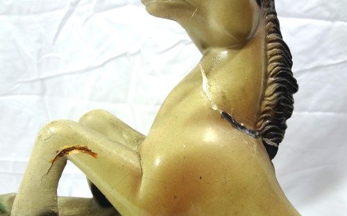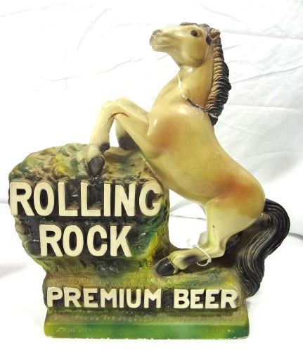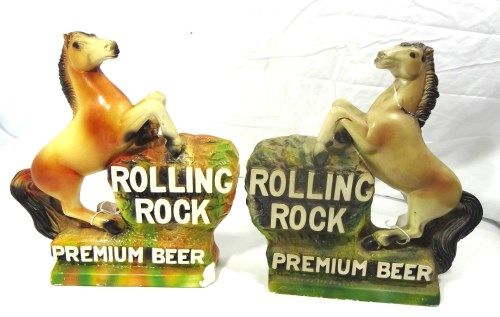 2 Rolling Rock Beer Advertising Chalkware Mustang Sculptures with some damage. One has a been cracked and repaired on the neck and chipped on the nose and ear. One has chips to the ear and base. Est. $25-50.00