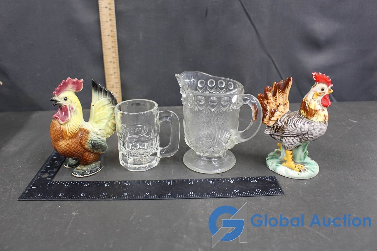(2) Rooster Decor, A&W Glass Mug and a Glass Creamer