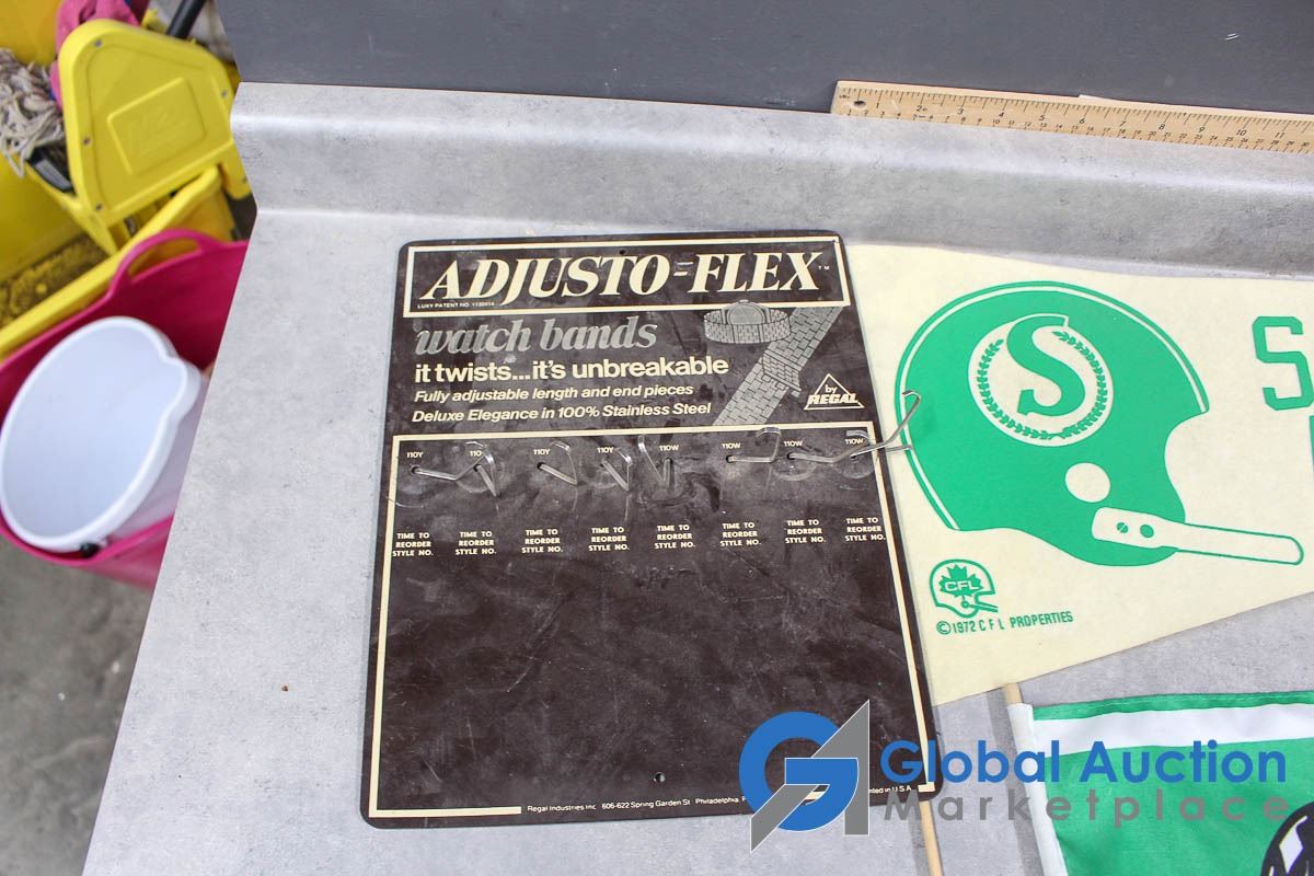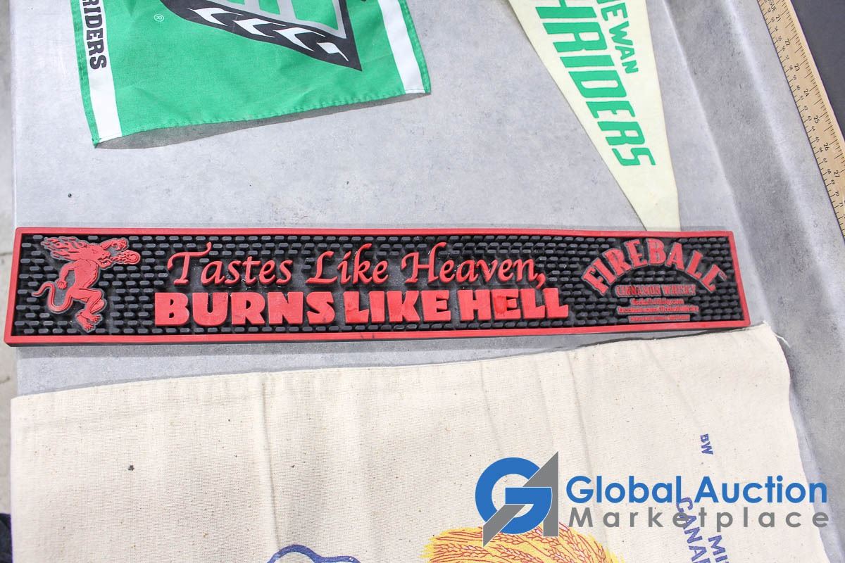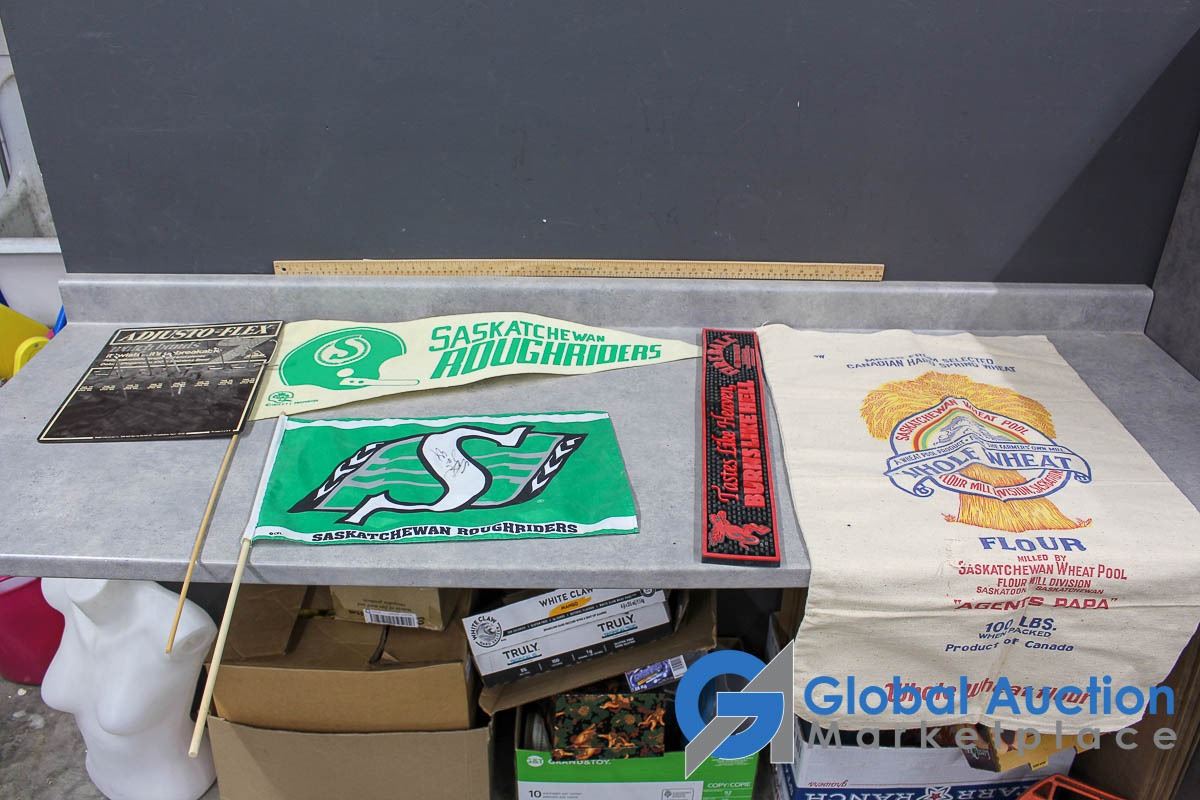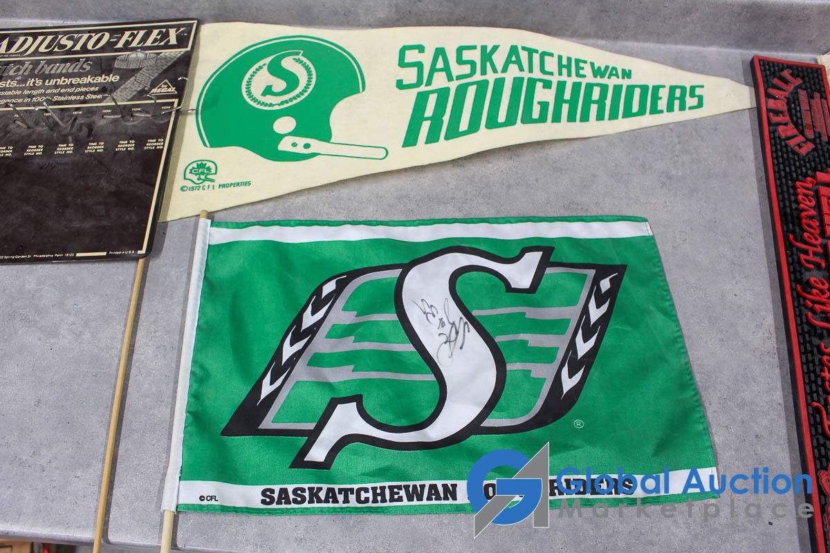 (2) Rough Rider Flags, Sask Wheat Pool Bag, & Fireball Bar Accessory