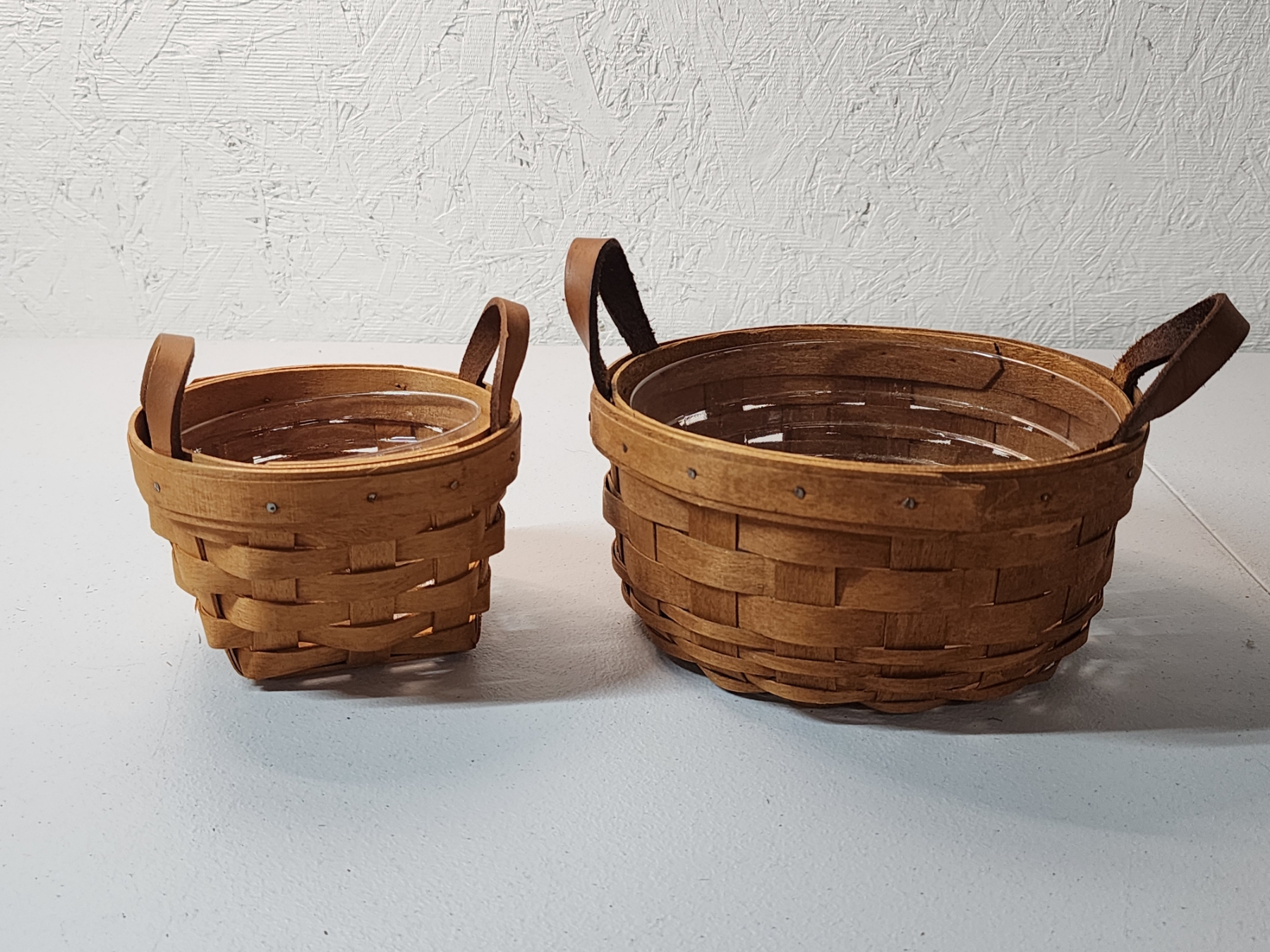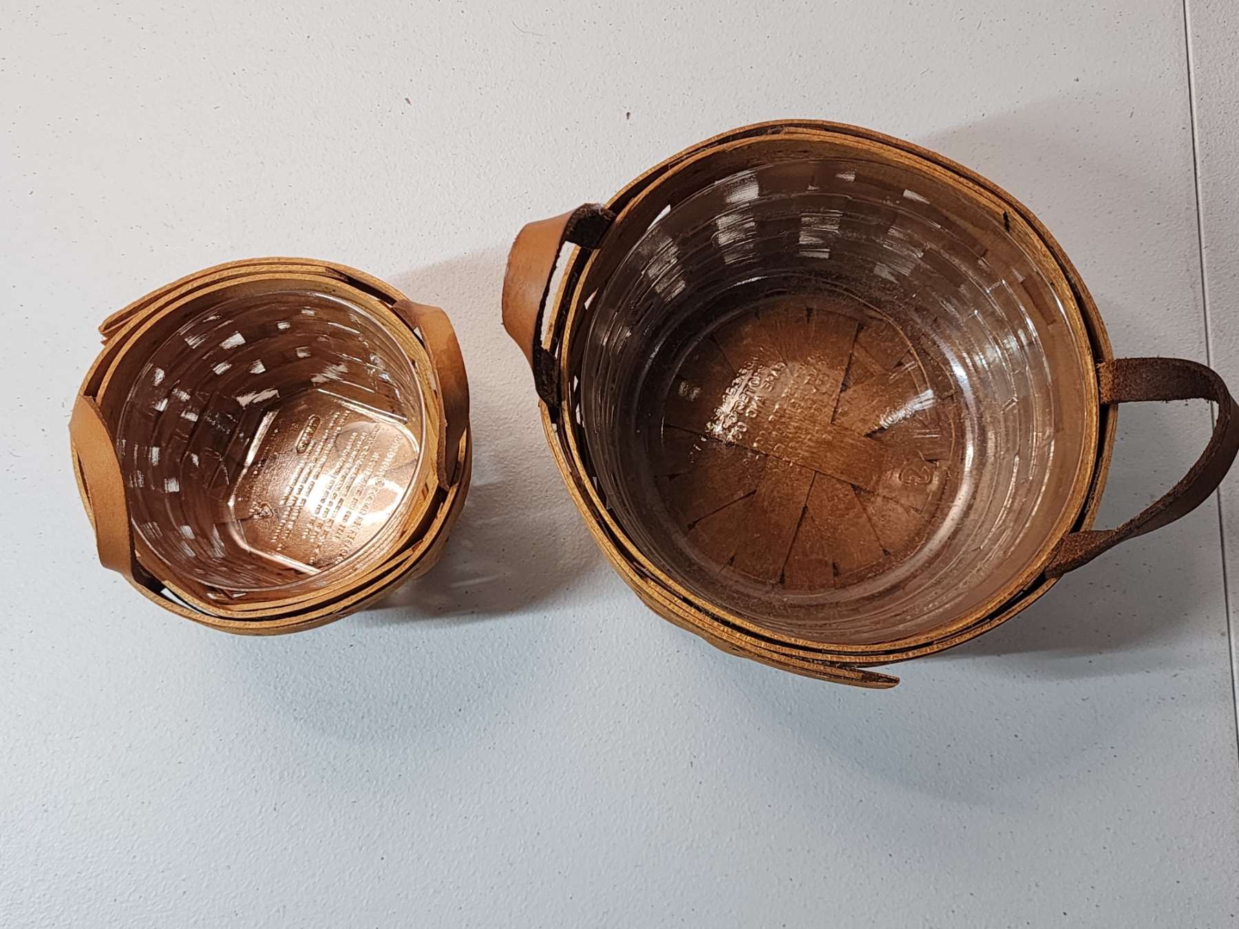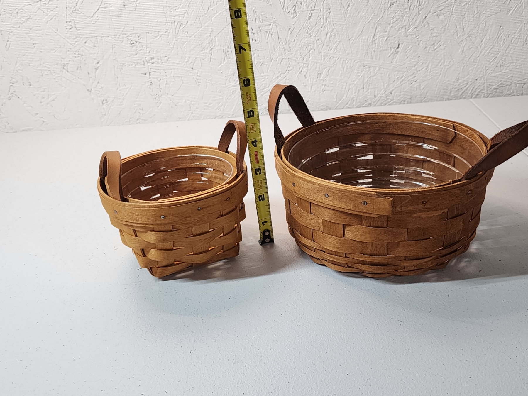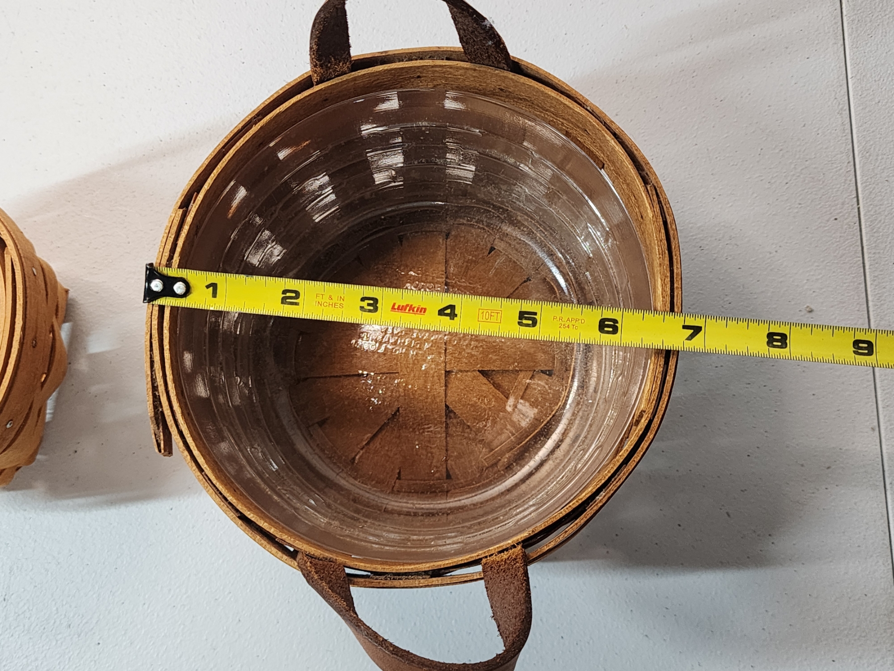 (2) Round Longaberger Baskets with Leather Handles and Plastic Liners
