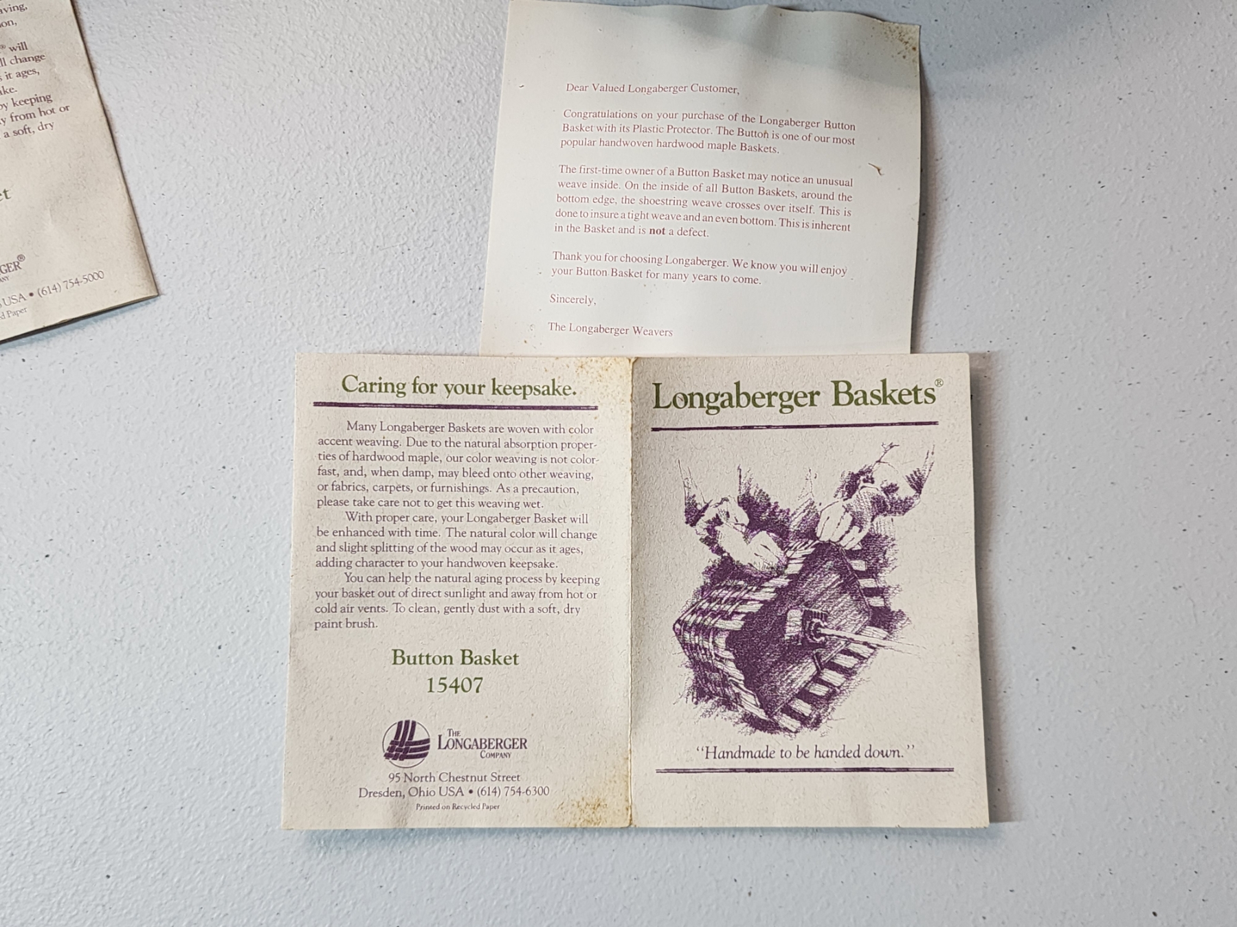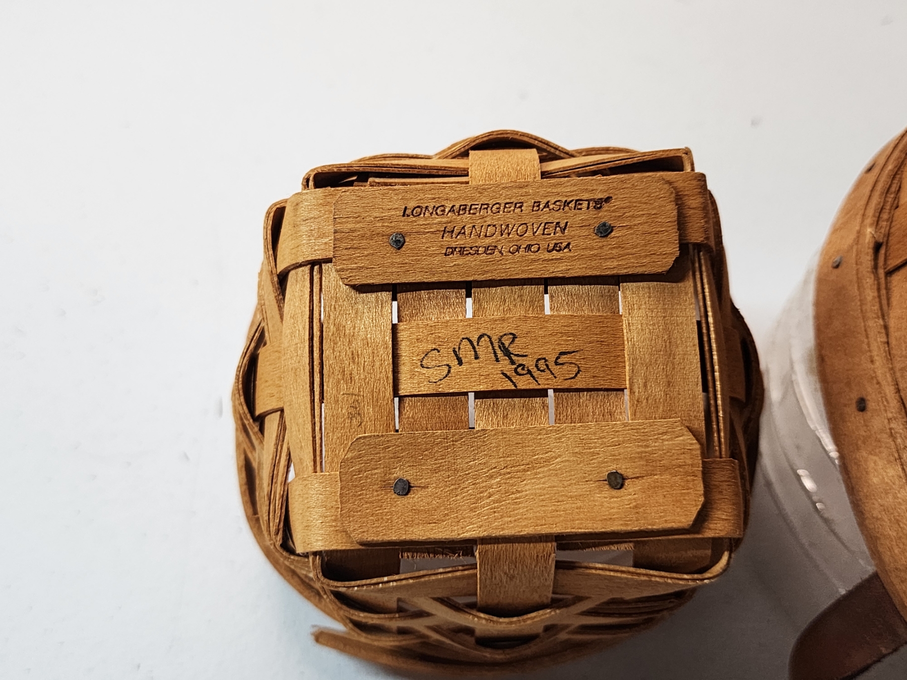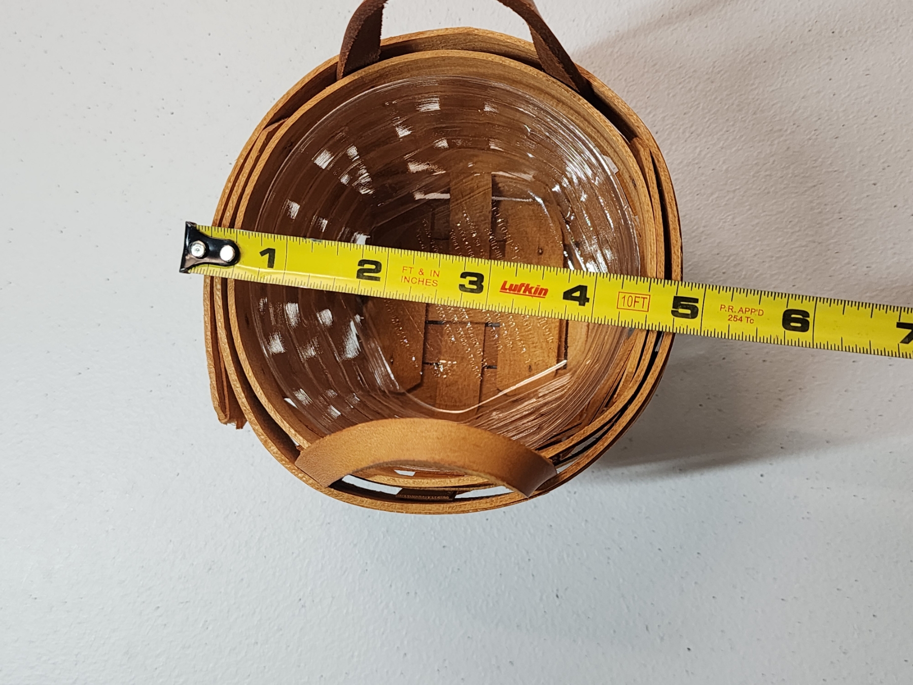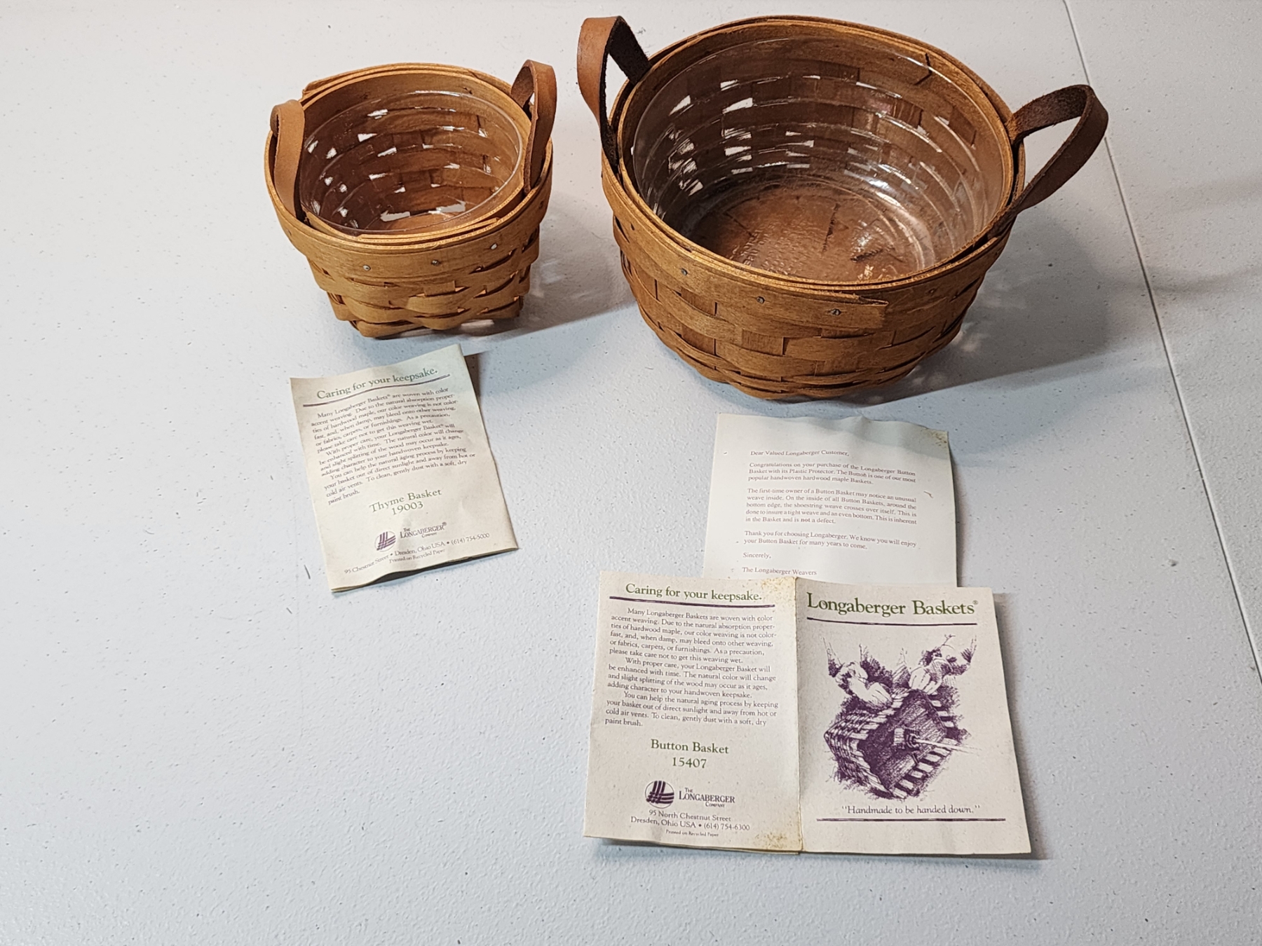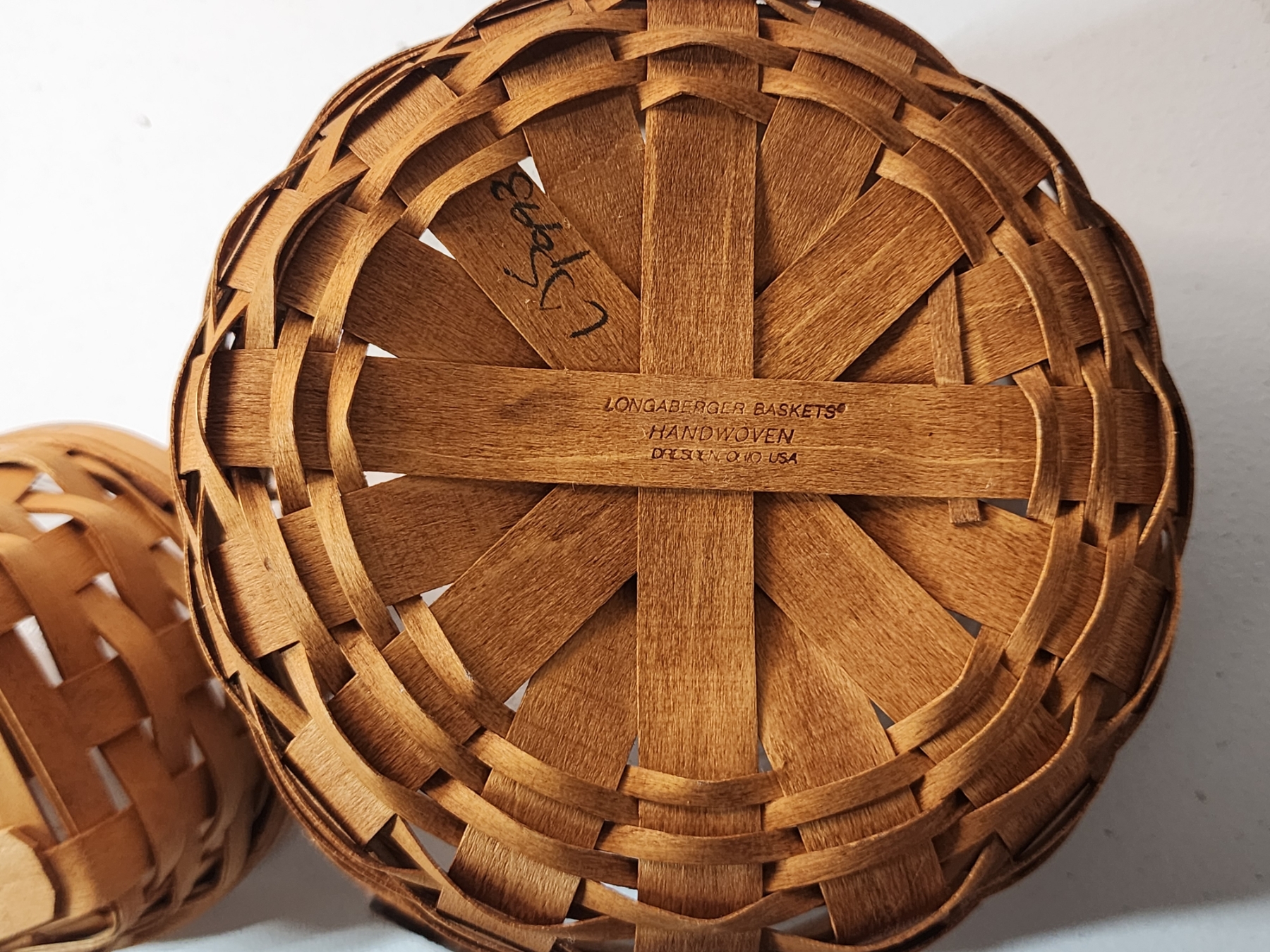 (2) Round Longaberger Baskets with Leather Handles and Plastic Liners