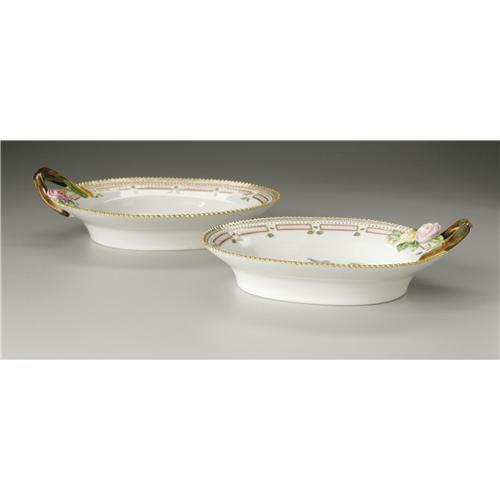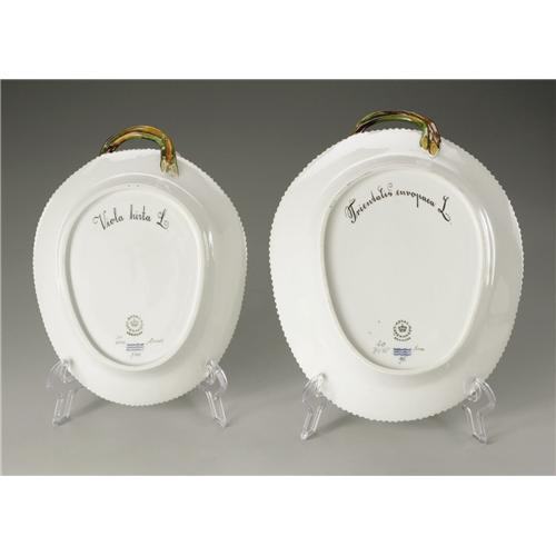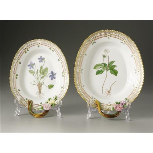 <B>Two <I>Flora Danica</B></I> Porcelain Relish Dishes</B></I><BR><B>Royal Copenhagen, Mid-Twentieth Century</B></I><BR><BR>Two <I>Flora Danica</B></I> pattern relish dishes depicting <I>Viola hirta L.,</B></I> and <I>Frientalis europaea L.,</B></I> pink and gilt rim. Maker's mark to the underside<BR>8.75in. long and 9.25in. long