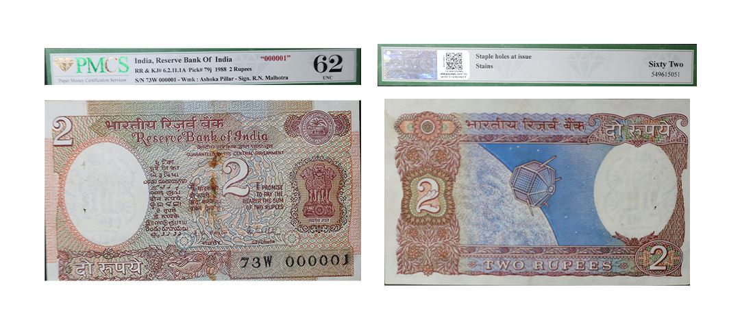 2 Rupees, 1982, Fancy Number, Signed by R.N. Malhotra, Serial No.: 73W 000001, PMCS Graded 62 UNC, Stains, Rare.