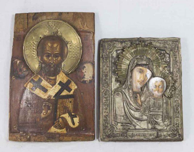 Depicting St. Luke, approx. 11" H x 7 1/3" W; and the Blessed Virgin with Jesus, approx. 9" H x 7" W. Late 19th-early 20th century. From a private collection. (4153)