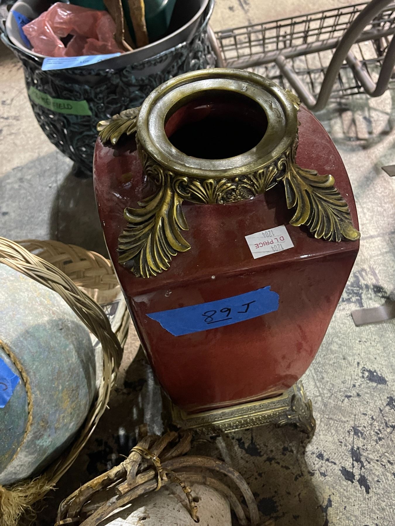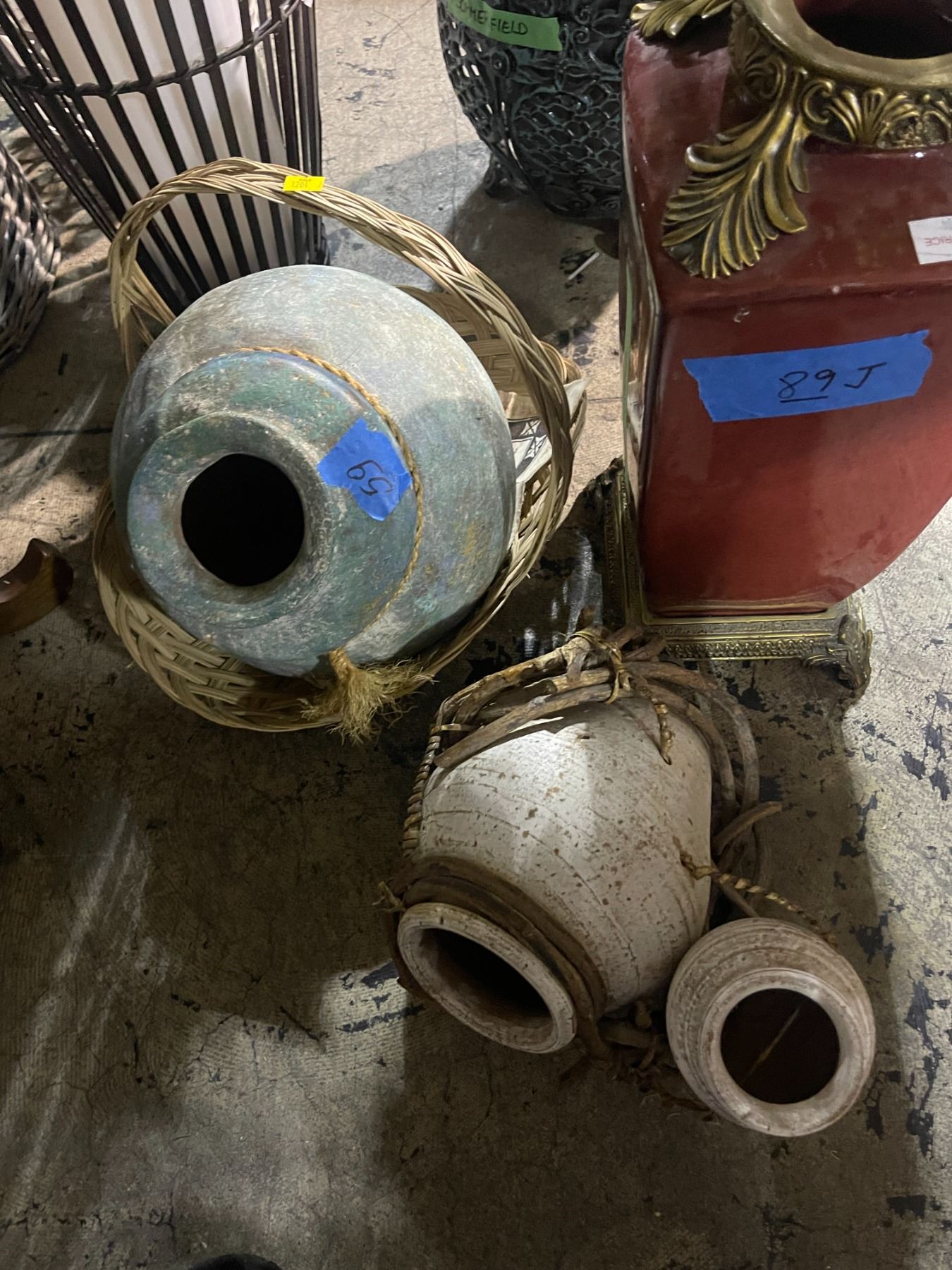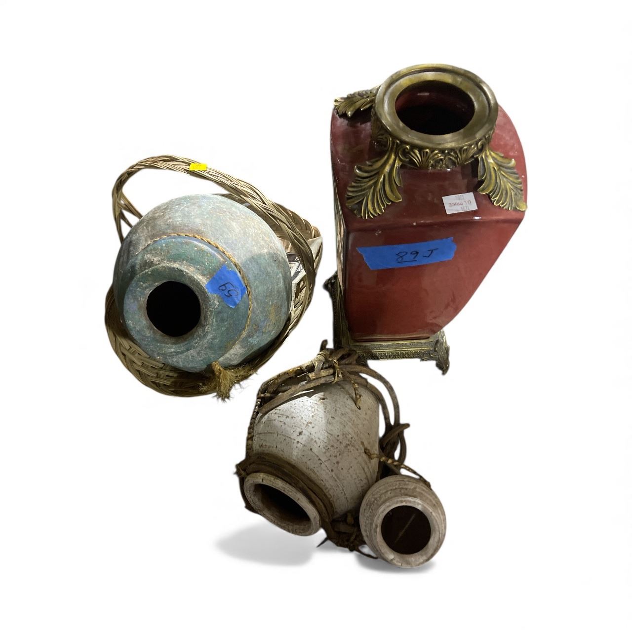 2 Rustic Pottery Jars and Red Ornate Vase