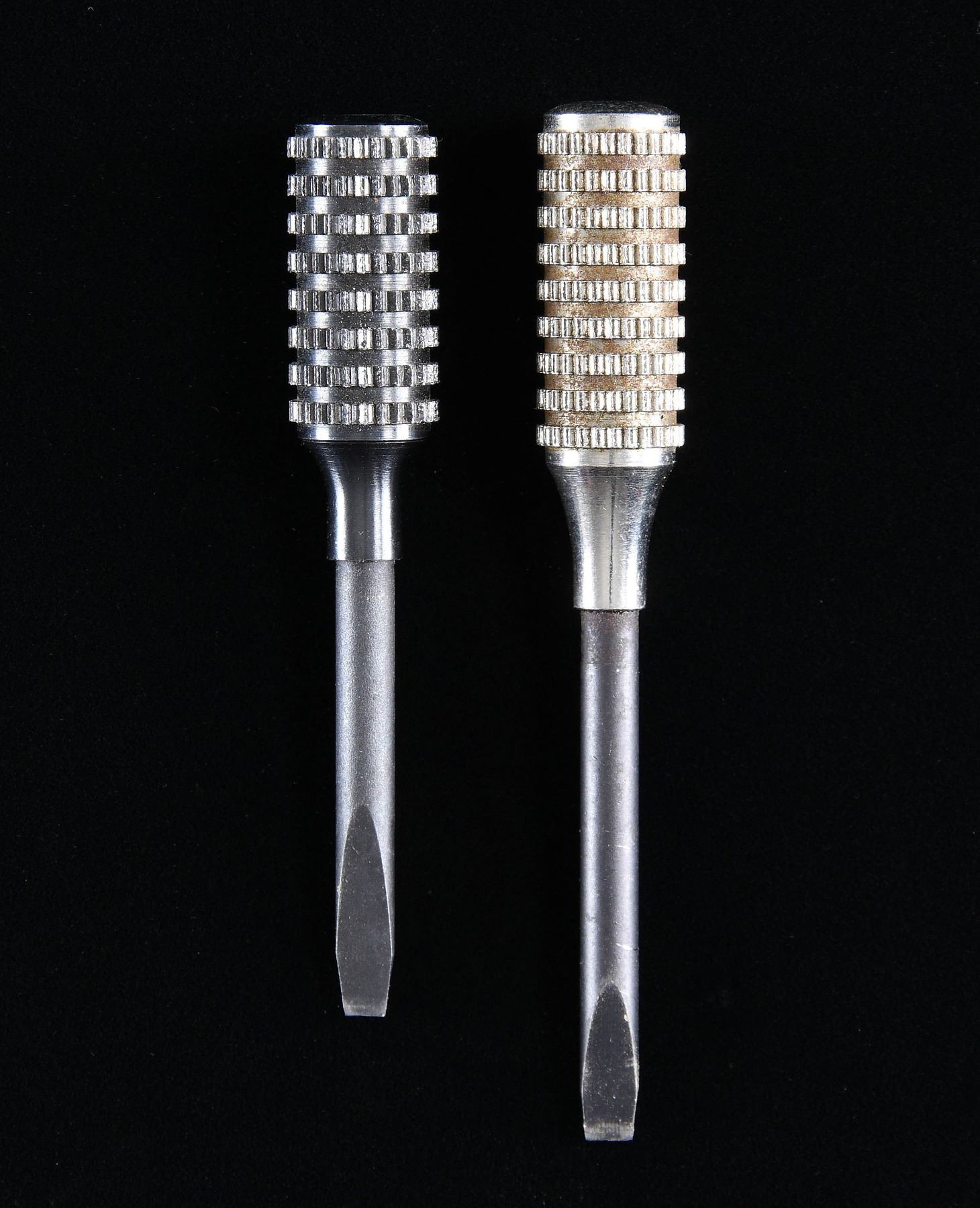 1). Scarce nickel plated model with hollow handle and long blued blade having short tapered sides. Nine rows of knurling. Usual production period of 1940-1948. Overall length of 3 9/16". CONDITION: slight evidence of use at tip of blade with balance near excellent. 2). All blued model with hollow handle and short blued blade having long tapered sides. Eight rows of knurling. Usual production period of 1940-1958. Overall length of 3 1/8". CONDITION: all aspects near excellent with new appearance. PROVENANCE: From the Lifelong Collection of George Staden S&W Member #3451. (02-23927/NW). $150-250.