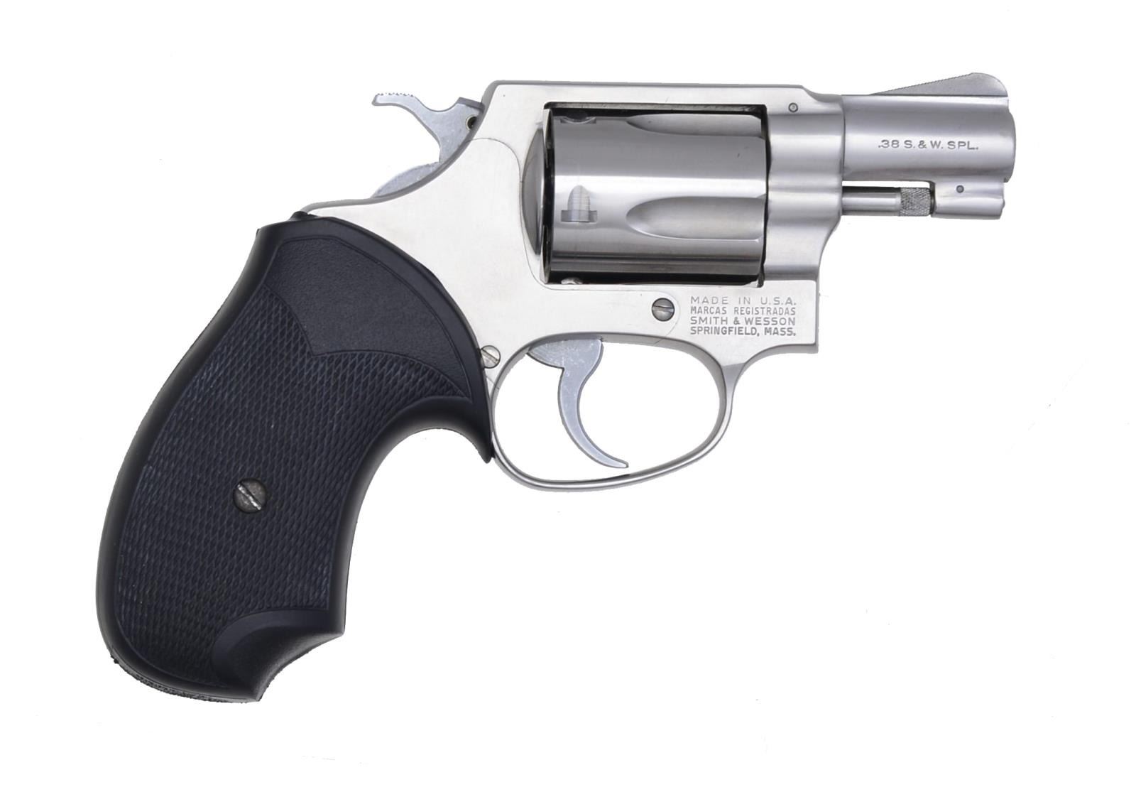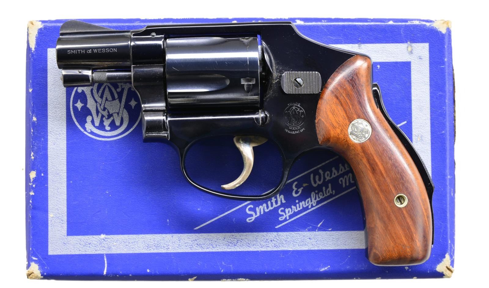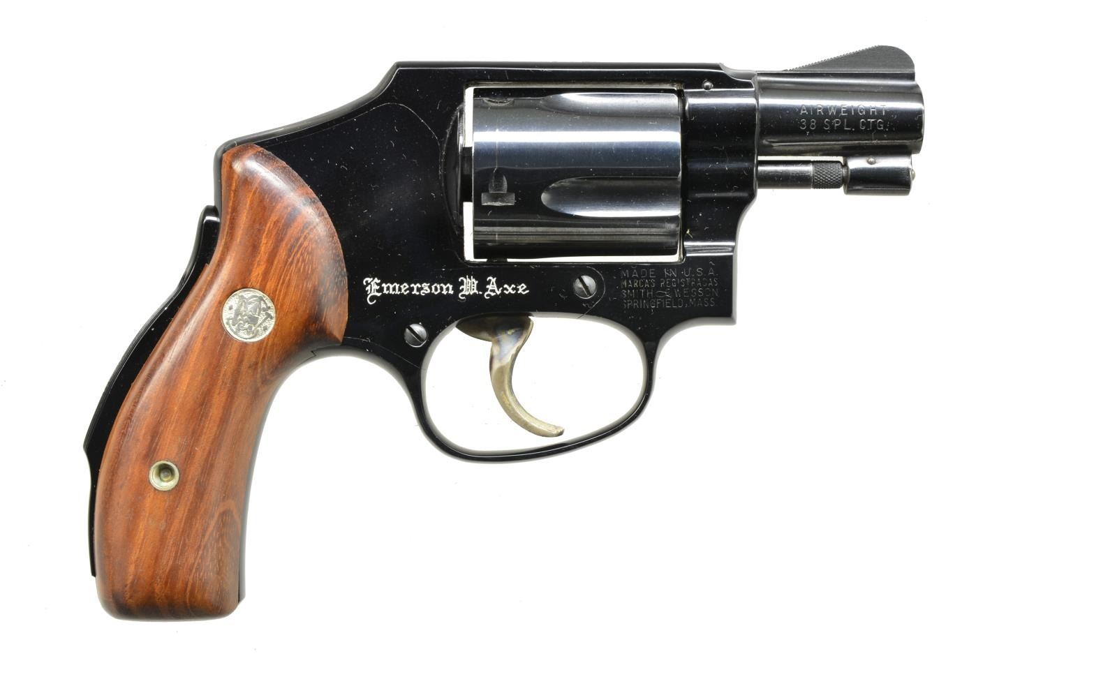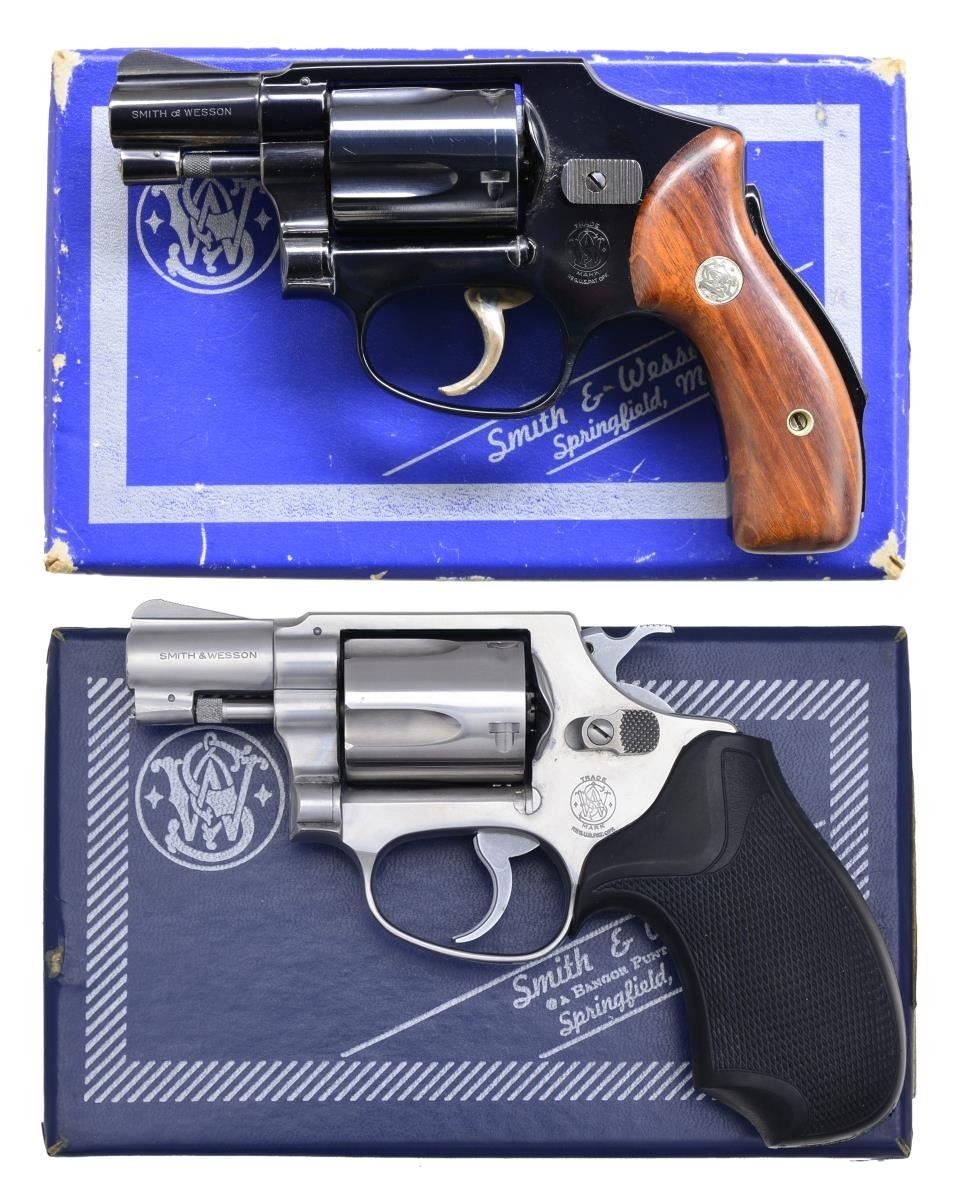 BOTH: cal. 38 Spl. Bbls. 1 7/8" pinned w/ serrated ramp front sights. Rnd. butt J frames w/ 5 rd. cyls. UNATTACHED ACCESSORIES: very good original 2 piece boxes w/ matching labels & all packaging except no paperwork for Model 42. CONDITION: very faint turn lines & slight internal firing residue. All other aspects near excellent including bores & grips. 1) MODEL 42 CENTENNIAL AIRWEIGHT. S# 19098. Early variation w/out "L" prefix in S#. Mfg. 1952-1971. S# 1-30,160. Steel cyl., flat latch, target trigger & smooth Magna walnut grips; right pencil numbered 19098, left stamped "81". Right side of frame on sideplate Old English engraved "Emerson W. Axe". (20-2110/NW). CURIO. 2) MODEL 60. S# R199012. Mfg. 1977-1978 w/ flash chromed standard hammer & trigger. Pachmayr Compac grips. (20-2122/NW). MODERN. $800-1,200.