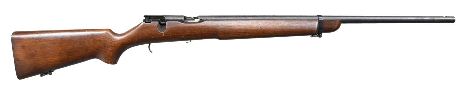 1) Cal. 22 LR. S# 65635. Bbl. 25". Savage Model 19 NRA bolt rifle. No sights present. Bbl. has two vacant screw holes. Receiver has five vacant screw holes, two on left side of receiver & three on rear top. Bolt, mag, bottom metal assembly & screws are missing. Front band appears to be a replacement. Pistol grip walnut stock. Bottom mounted sling swivels. MAGS: none present. CONDITION: stock shows a couple grain cracks on left side, some staining, scattered dings & handling marks. Metal is mostly a gray patina w/ scattered light pitting & oxidation. Good bore w/ some frosting but strong rifling. (23-1467/MJC). 2) Cal. 22 LR. NSN. Bbl. 25". Blade front sight. No rear sight present. Rear of receiver has three holes for sight mounting. Middle floorplate screw is missing. Cocking piece not working properly & may require attention. Pistol grip walnut stock w/ bottom mounted sling swivels. MAGS: none present. CONDITION: refinished stock shows scattered dings, scratches & handling marks. Metal is mostly a gray patina w/ some light oxidation & scattered traces of original blue. Good bore. (23-1471/MJC). ALL CURIO. $150-300.