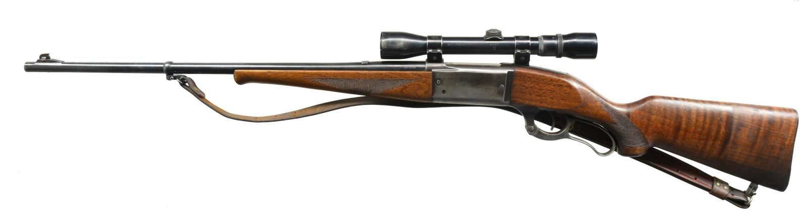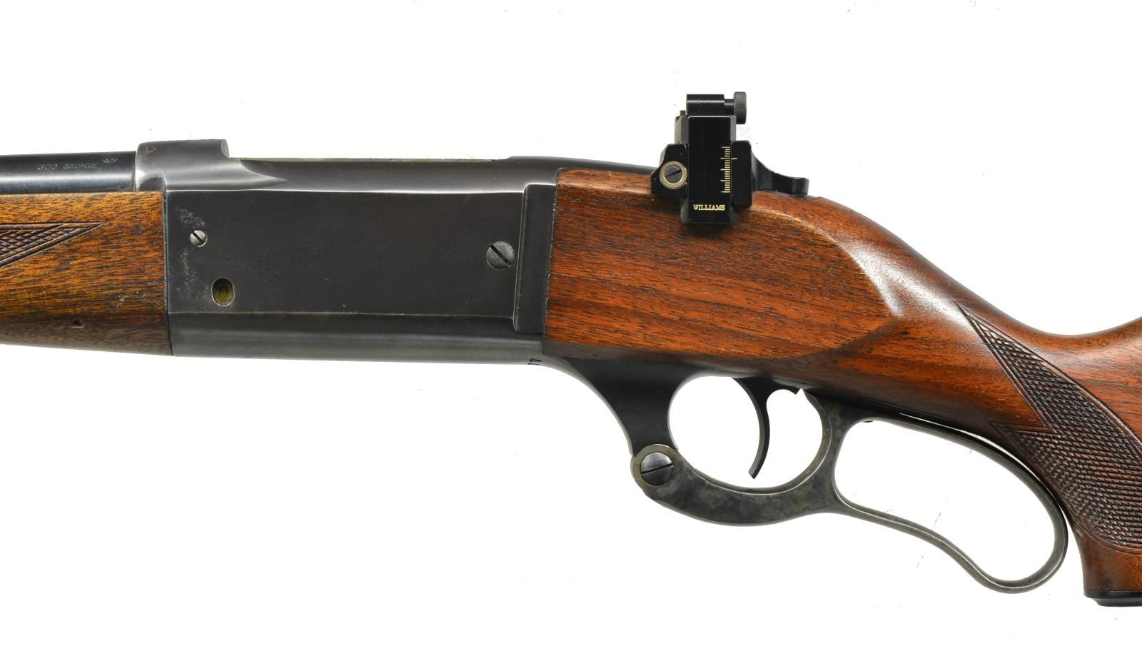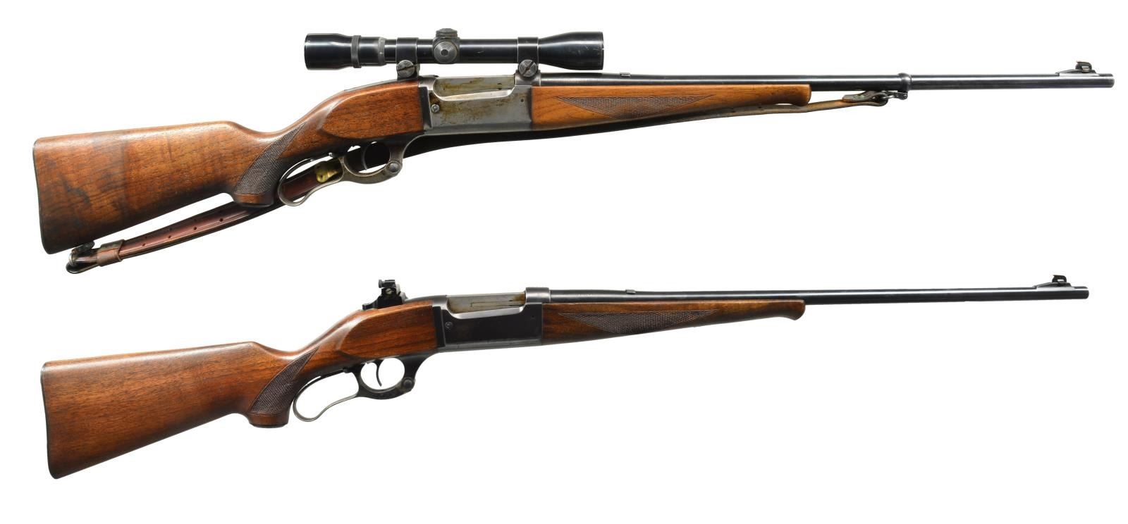 ALL: cal. 300 Sav. Bbl. 24". Ramp mounted bead front sights w/ fillers in rear dovetails. Blued finish w/ case colored levers. Action features bent tab safeties & cocking indicators. Schnable tipped forearms & capped pistol grip walnut stocks w/ steel buttplates & cut checkering. 1) S# 520793. Weaver V7 gloss finished scope w/ duplex reticle on Weaver mts. Action features steel rotary mag. Leather sling on added QD swivels. 1949 Mfg. CONDITION: 60% blue showing fading in carry area of action. Wood has worn finish showing scratches & marks. Bore has lightly worn rifling. Front bell of scope is dented. (20-2763/DS). 2) S# 580177. Williams receiver sight. Action features brass rotary mag. CONDITION: 95% blue showing light edge wear & sm. spots of freckling. Very good original wood finish showing sm. scratches. Bright bore w/ strong rifling. (20-2805/DS). ALL CURIO. $750-1,100.