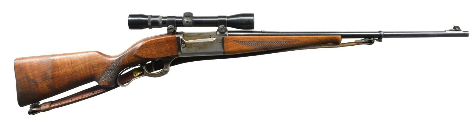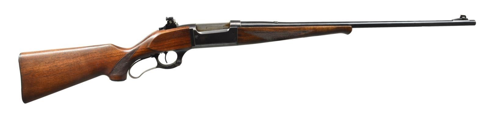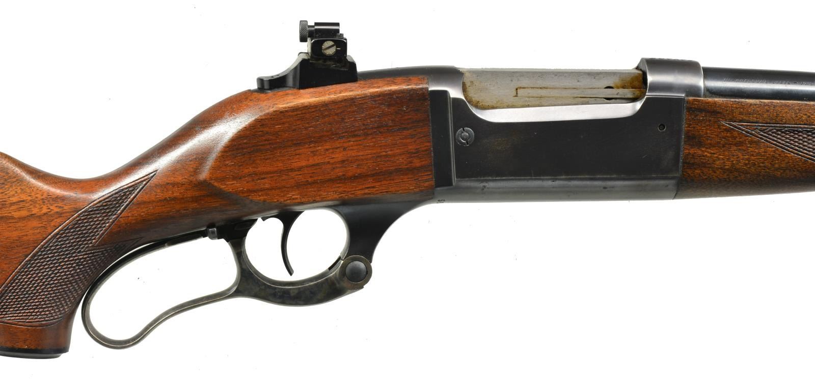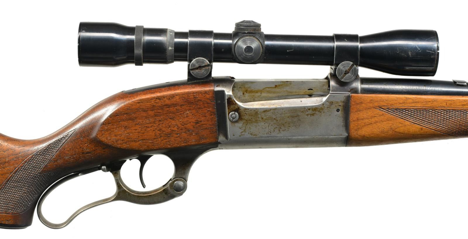 ALL: cal. 300 Sav. Bbl. 24". Ramp mounted bead front sights w/ fillers in rear dovetails. Blued finish w/ case colored levers. Action features bent tab safeties & cocking indicators. Schnable tipped forearms & capped pistol grip walnut stocks w/ steel buttplates & cut checkering. 1) S# 520793. Weaver V7 gloss finished scope w/ duplex reticle on Weaver mts. Action features steel rotary mag. Leather sling on added QD swivels. 1949 Mfg. CONDITION: 60% blue showing fading in carry area of action. Wood has worn finish showing scratches & marks. Bore has lightly worn rifling. Front bell of scope is dented. (20-2763/DS). 2) S# 580177. Williams receiver sight. Action features brass rotary mag. CONDITION: 95% blue showing light edge wear & sm. spots of freckling. Very good original wood finish showing sm. scratches. Bright bore w/ strong rifling. (20-2805/DS). ALL CURIO. $750-1,100.