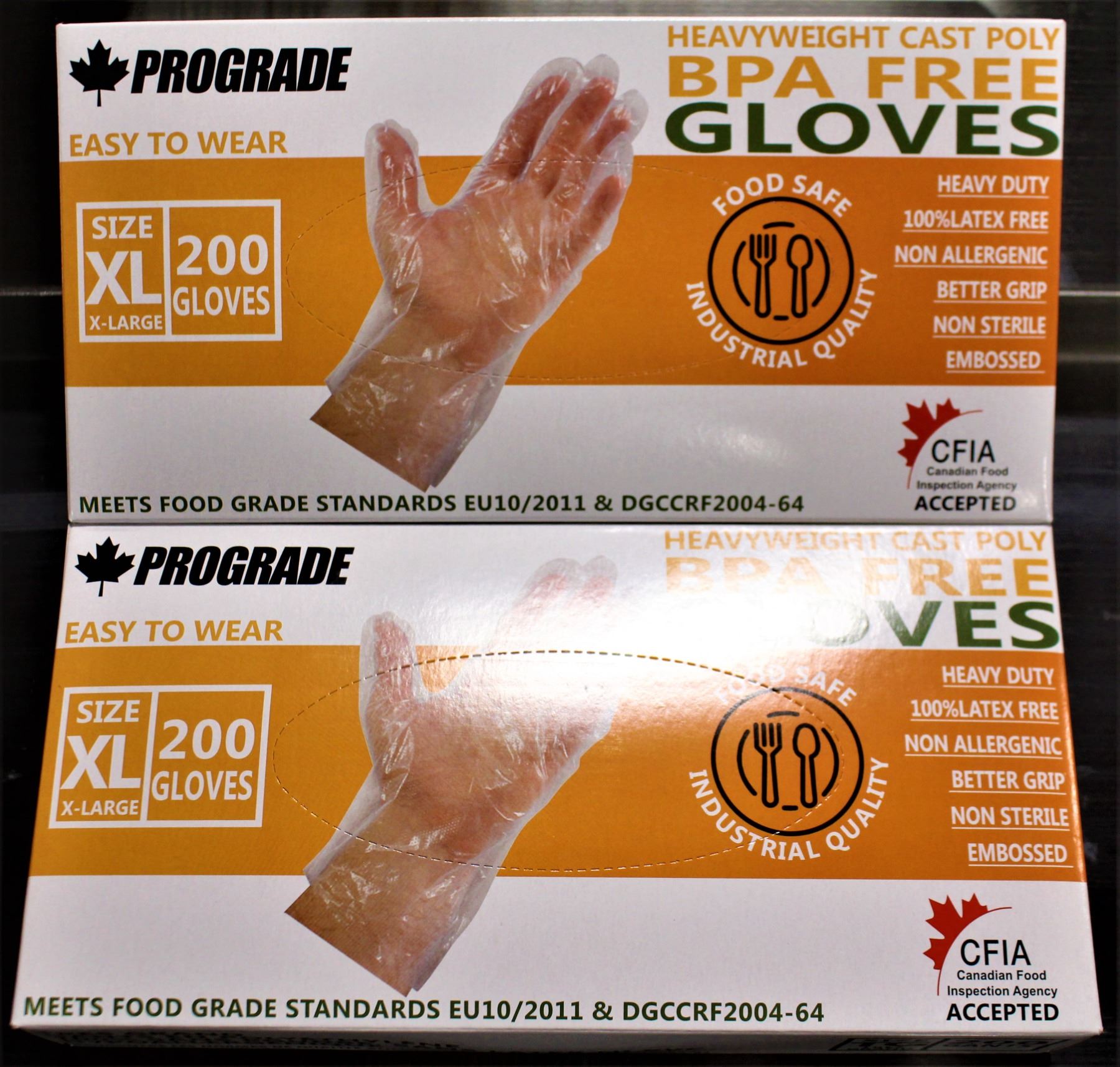 SIZE: EXTRA LARGE, 200 / BOX (400 TOTAL). HEAVY DUTY INDUSTRIAL QUALITY, 2.36 MILLS THICKNESS, 100% FREE OF POWDER, LATEX & PVC. C.F.I.A. ACCEPTED. RECYCLABLE & HYPO ALLERGENIC. TOUCHSCREEN FRIENDLY.