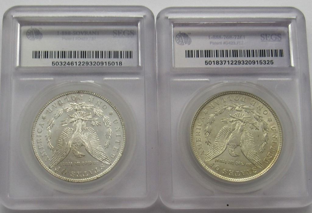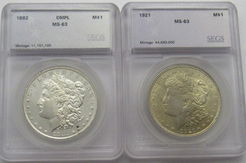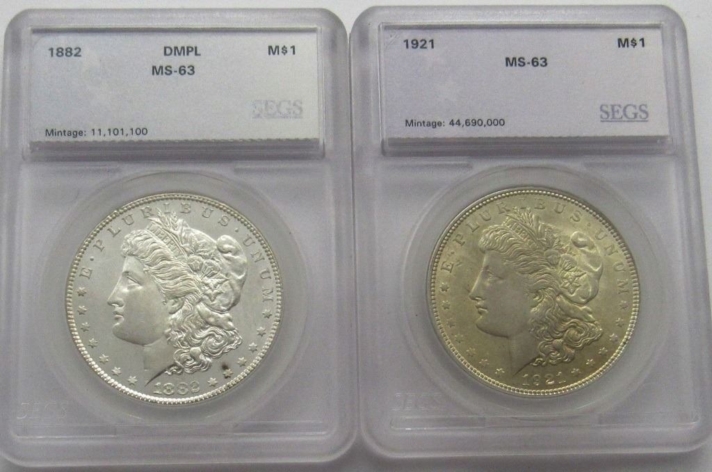 2-SEGS GRADED MORGANS PL 1921-P MS63,