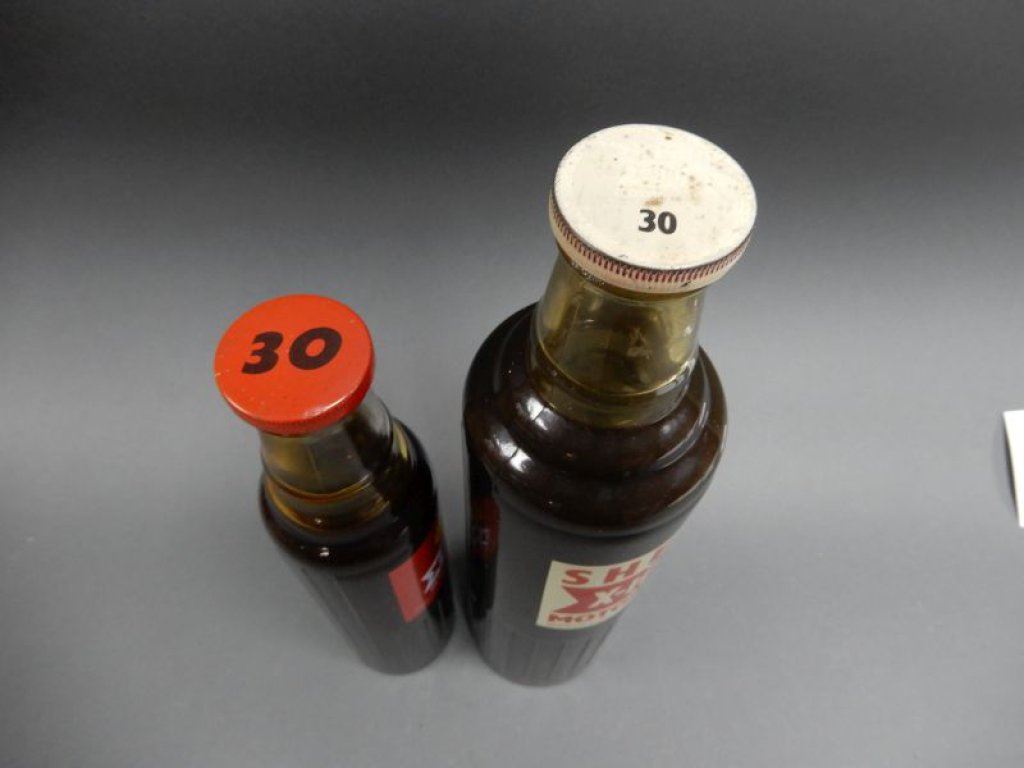 2 SHELL X-100 U.S QT. & PT. OIL BOTTLES- FULL CORRECT CAPS LOCATION: LOWER LEFT