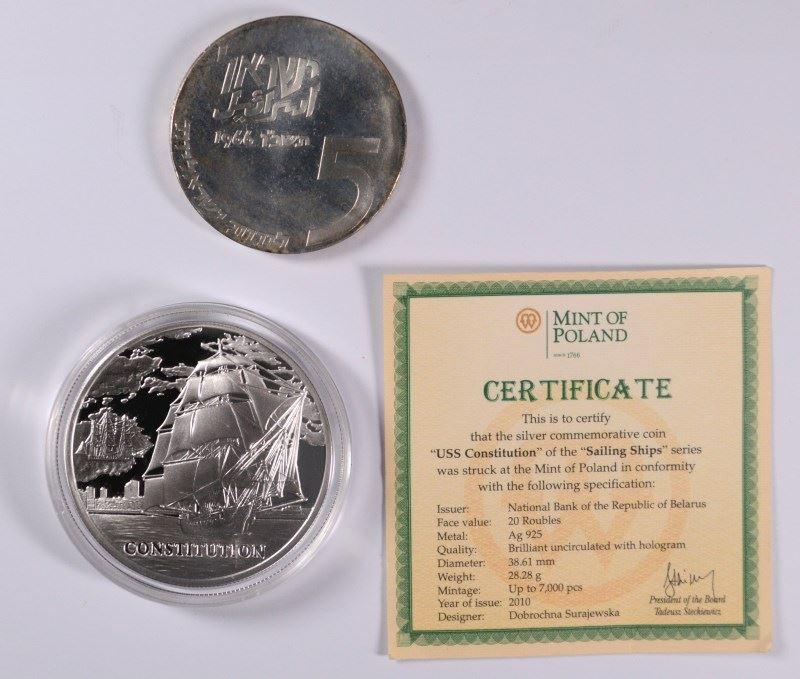 2 -SILVER COINS, 1966 ISRAEL SILVER FIVE LI ROT & 2010 .925 SILVER CONSTITUTION
