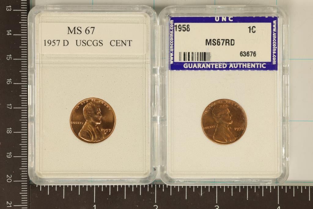 LINCOLN CENT MS67RD. THIS IS NOT FROM A REPUTABLE GRADING SERVICE, USE YOUR OWN JUDGEMENT, BIDALOT CANNOT GUARANTEE THE GRADE.